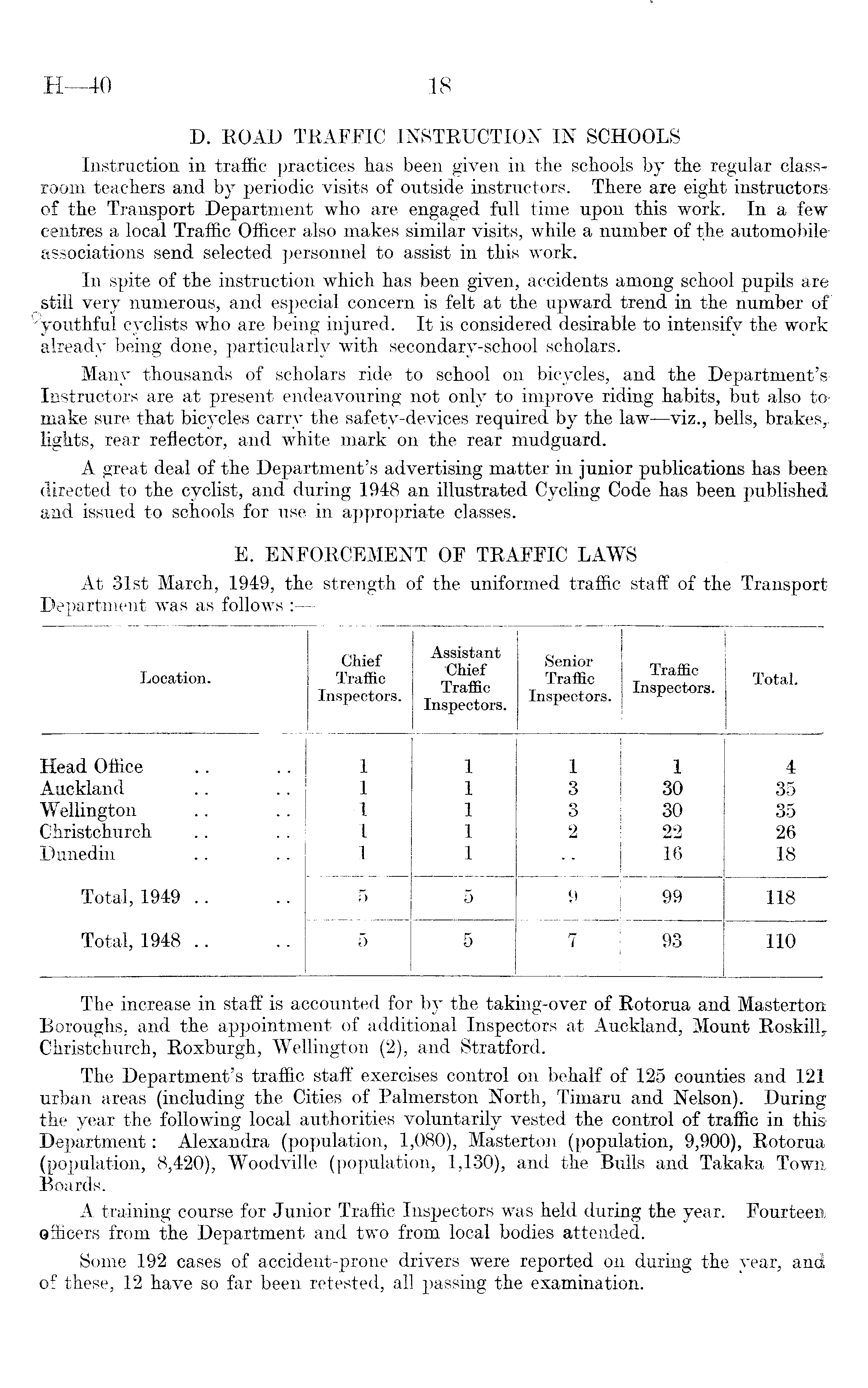 Location. Chief Traffic Inspectors. Assistant Chief Traffic Inspectors. Senior Traffic Inspectors. Traffic Inspectors. Total. Head Office Auckland Wellington Christchurch Dunedin 1 1 1 1 1 1 1 1 1 1 1 3 3 2 1 30 30 22 16 4 35 35 26 18 Total, 1949 5 5 9 99 118 Total, 1948 5 5 7 93 110