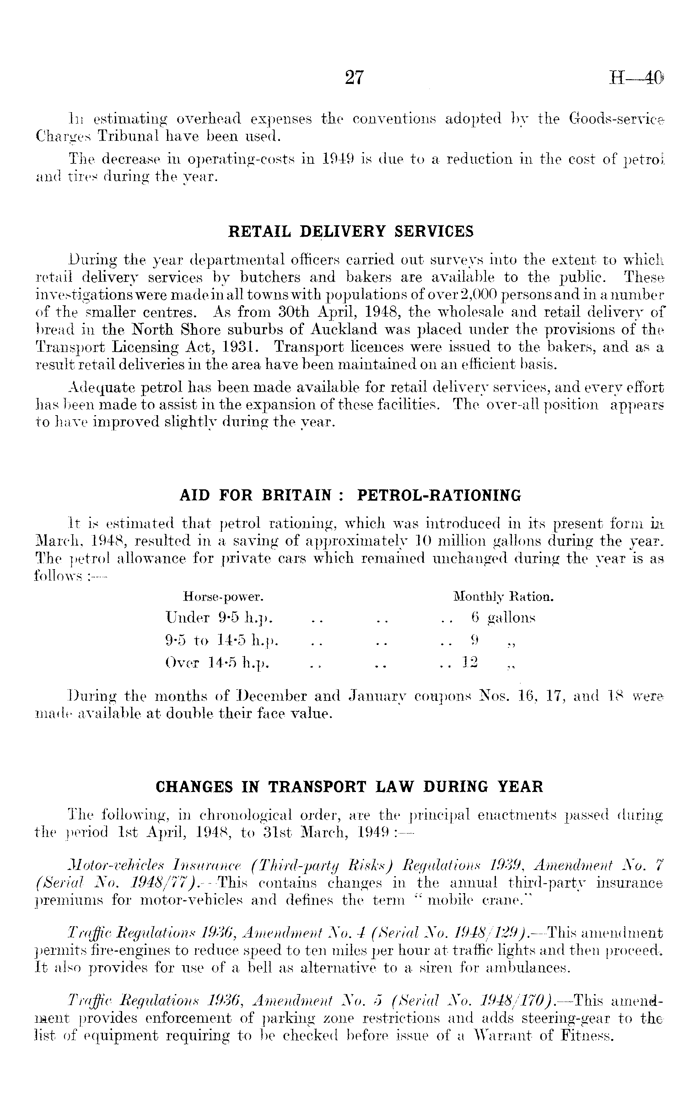 In estimating overhead expenses the conventions adopted by the Goods-service Charges Tribunal have been used. The decrease in operating-costs in 1949 is due to a reduction in the cost of petrol and tires during the year. RETAIL DELIVERY SERVICES During the year departmental officers carried out surveys into the extent to which retail delivery services by butchers and bakers are available to the public. These investigations were made in all towns with populations of over 2,000 persons and in a number of the smaller centres. As from 30th April, 1948, the wholesale and retail delivery of bread in the North Shore suburbs of Auckland was placed under the provisions of the Transport Licensing Act, 1931. Transport licences were issued to the bakers, and as a result retail deliveries in the area have been maintained on an efficient basis. Adequate petrol has been made available for retail delivery services, and every effort has been made to assist in the expansion of these facilities. The over-all position appears to have improved slightly during the year. AID FOR BRITAIN : PETROL-RATIONING It is estimated that petrol rationing, which was introduced in its present form in March, 1948, resulted in a saving of approximately 10 million gallons during the year. The petrol allowance for private cars which remained unchanged during the year is as follows :—- Horse-power. Monthly Ration. Under 9*5 h.p. .. .. 6 gallons 9-5 to 14-5 h.p. .. .. .. 9 Over 14*5 h.p. .. .. .. 12 „ During the months of December and January coupons Nos. 16, 17, and 18 were made available at double their face value. CHANGES IN TRANSPORT LAW DURING YEAR The following, in chronological order, are the principal enactments passed during the period Ist April, 1948, to 31st March, 1949 Motor-vehicles Insurance (Third-party Risks) Regulations 1939, Amendment No. 7 I(Serial No. 1948/77). —This contains changes in the annual third-party insurance premiums for motor-vehicles and defines the term " mobile crane." Traffic Regulations 1936, Amendment No. 4 (Serial No. 1948/129). —This amendment permits fire-engines to reduce speed to ten miles per hour at traffic lights and then proceed. It also provides for use of a bell as alternative to a siren for ambulances. Traffic Regulations 1936, Amendment No. 5 (Serial No. 1948/170). —This amendment provides enforcement of parking zone restrictions and adds steering-gear to the list of equipment requiring to be checked before issue of a Warrant of Fitness.