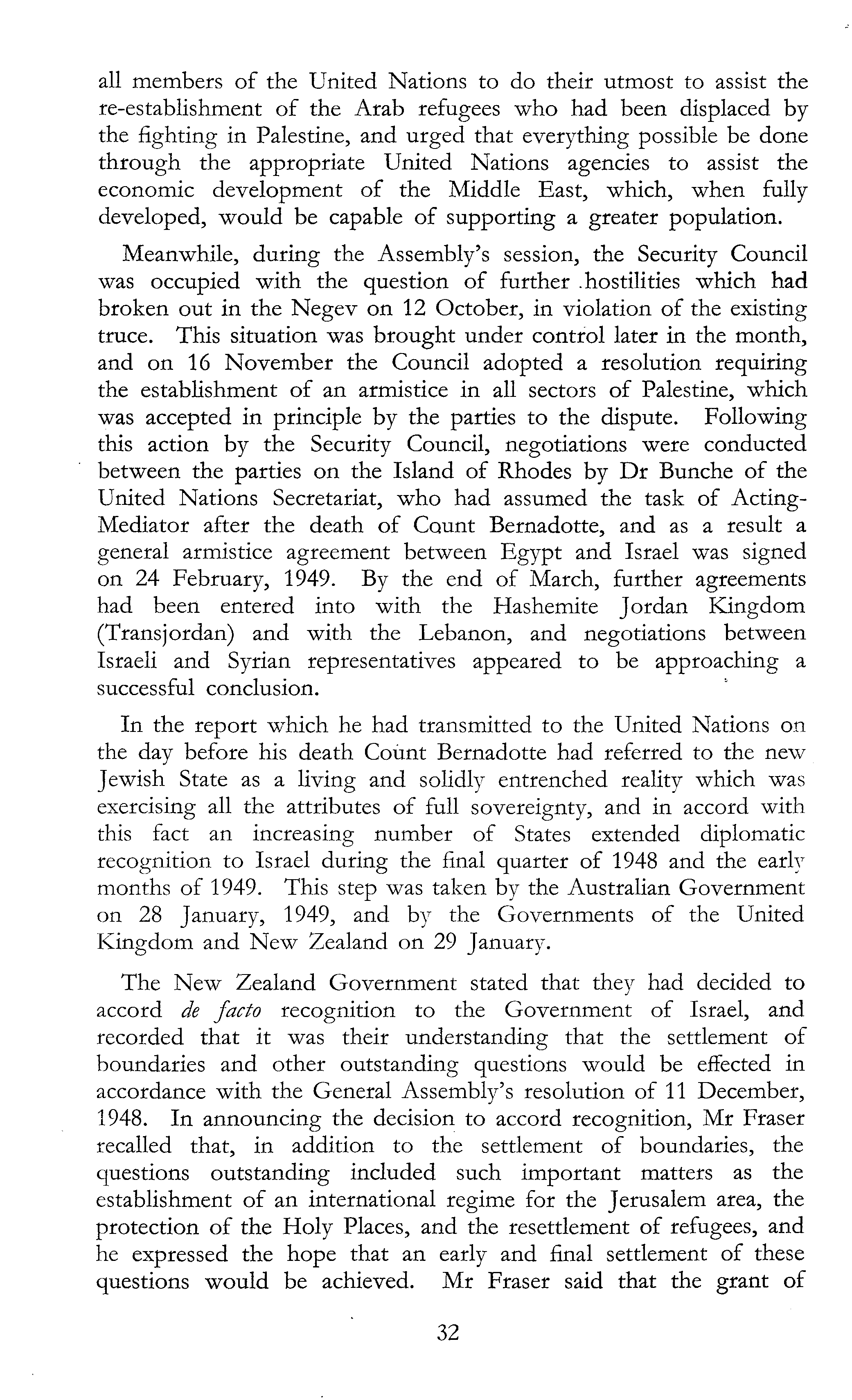 all members of the United Nations to do their utmost to assist the re-establishment of the Arab refugees who had been displaced by the fighting in Palestine, and urged that everything possible be done through the appropriate United Nations agencies to assist the economic development of the Middle East, which, when fully developed, would be capable of supporting a greater population. Meanwhile, during the Assembly's session, the Security Council was occupied with the question of further .hostilities which had broken out in the Negev on 12 October, in violation of the existing truce. This situation was brought under control later in the month, and on 16 November the Council adopted a resolution requiring the establishment of an armistice in all sectors of Palestine, which was accepted in principle by the parties to the dispute. Following this action by the Security Council, negotiations were conducted between the parties on the Island of Rhodes by Dr Bunche of the United Nations Secretariat, who had assumed the task of ActingMediator after the death of Count Bernadotte, and as a result a general armistice agreement between Egypt and Israel was signed on 24 February, 1949. By the end of March, further agreements had been entered into with the Hashemite Jordan Kingdom (Transjordan) and with the Lebanon, and negotiations between Israeli and Syrian representatives appeared to be approaching a successful conclusion. In the report which he had transmitted to the United Nations on the day before his death Count Bernadotte had referred to the new Jewish State as a living and solidly entrenched reality which was exercising all the attributes of full sovereignty, and in accord with this fact an increasing number of States extended diplomatic recognition to Israel during the final quarter of 1948 and the early months of 1949. This step was taken by the Australian Government on 28 January, 1949, and by the Governments of the United Kingdom and New Zealand on 29 January. The New Zealand Government stated that they had decided to accord de facto recognition to the Government of Israel, and recorded that it was their understanding that the settlement of boundaries and other outstanding questions would be effected in accordance with the General Assembly's resolution of 11 December, 1948. In announcing the decision to accord recognition, Mr Fraser recalled that, in addition to the settlement of boundaries, the questions outstanding included such important matters as the establishment of an international regime for the Jerusalem area, the protection of the Holy Places, and the resettlement of refugees, and he expressed the hope that an early and final settlement of these questions would be achieved. Mr Fraser said that the grant of