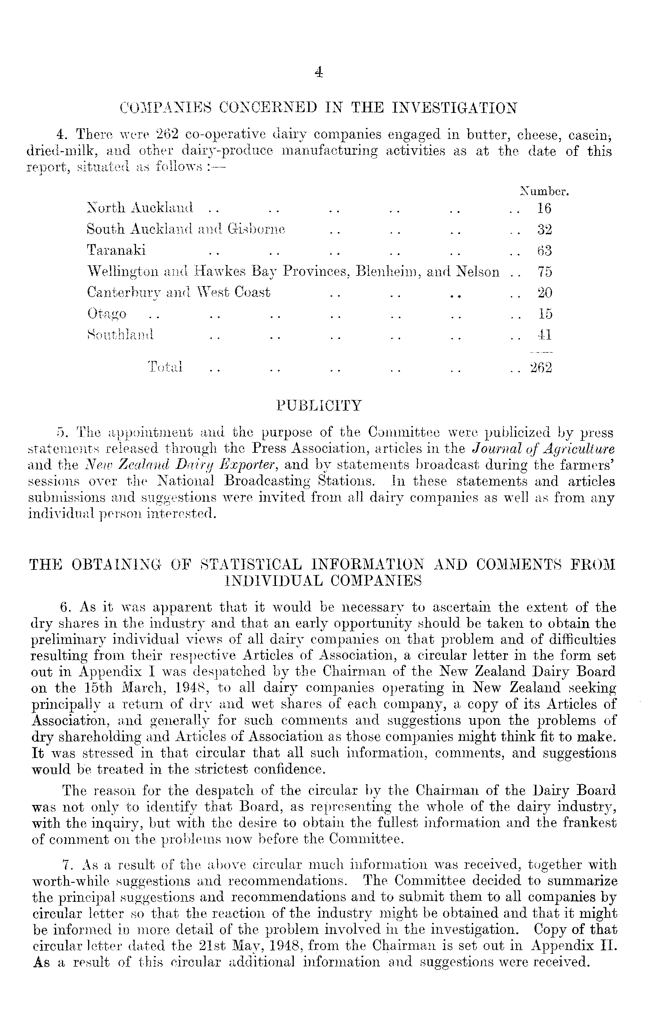 COMPANIES CONCERNED IN THE INVESTIGATION 4. There were 262 co-operative dairy companies engaged in butter, cheese, dried-milk, and other dairy-produce manufacturing activities as at the date of this report, situated as follows : —- Number. North Auckland .. .. .. .. .. 16 South Auckland and Gisborne .. .. .. .. 32 Taranaki .. .. .. .. .. .. 63 Wellington and Hawkes Bay Provinces, Blenheim, and Nelson .. 75 Canterbury and West Coast .. .. .. .. 20 Otago .. .. .. .. .. .. .. 15 Southland .. .. .. .. .. .. 41 Total .. .. .. .. .. ..262 PUBLICITY 5. The appointment and the purpose of the Committee were publicized by press statements released through the Press Association, articles in the Journal of Agriculture and the New Zealand Dairy Exporter, and by statements broadcast during the farmers' sessions over the National Broadcasting Stations. In these statements and articles submissions and suggestions were invited from all dairy companies as well as from any individual person interested. THE OBTAINING OF STATISTICAL INFORMATION AND COMMENTS FROM INDIVIDUAL COMPANIES 6. As it was apparent that it would be necessary to ascertain the extent of the dry shares in the industry and that an early opportunity should be taken to obtain the preliminary individual views of all dairy companies on that problem and of difficulties resulting from their respective Articles of Association, a circular letter in the form set out in Appendix I was despatched by the Chairman of the New Zealand Dairy Board on the 15th March, 1948, to all dairy companies operating in New Zealand seeking principally a return of dry and wet shares of each company, a copy of its Articles of Association, and generally for such comments and suggestions upon the problems of dry shareholding and Articles of Association as those companies might think fit to make. It was stressed in that circular that all such information, comments, and suggestions would be treated in the strictest confidence. The reason for the despatch of the circular by the Chairman of the Dairy Board was not only to identify that Board, as representing the whole of the dairy industry, with the inquiry, but with the desire to obtain the fullest information and the frankest of comment on the problems now before the Committee. 7. As a result of the above circular much information was received, together with worth-while suggestions and recommendations. The Committee decided to summarize the principal suggestions and recommendations and to submit them to all companies by circular letter so that the reaction of the industry might be obtained and that it might be informed in more detail of the problem involved in the investigation. Copy of that circular letter dated the 21st May, 1948, from the Chairman is set out in Appendix 11. As a result of this circular additional information and suggestions were received.