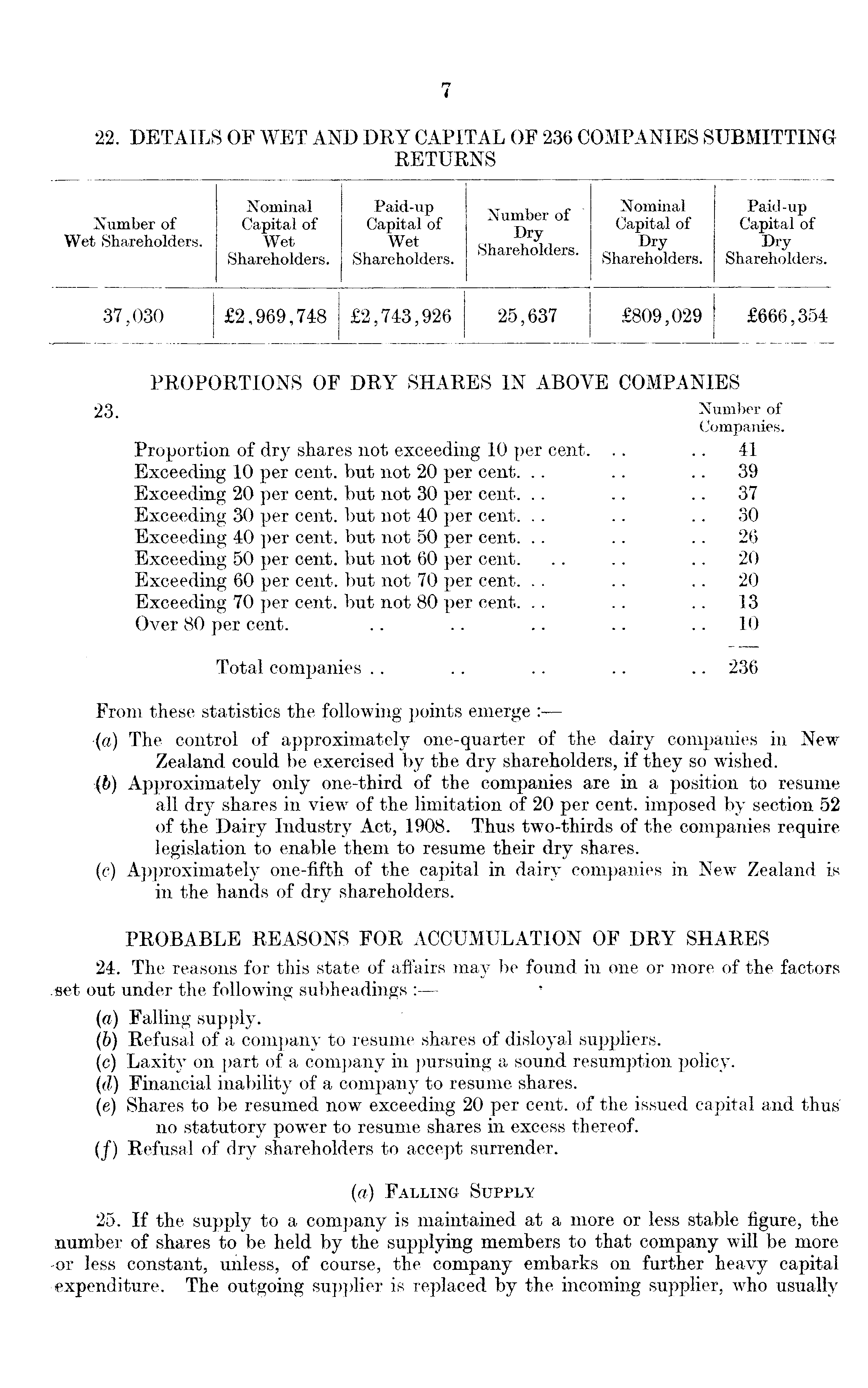 PROPORTIONS OF DRY SHARES IN ABOVE COMPANIES 23. Number of Companies. Proportion of dry shares not exceeding 10 per cent. .. .. 41 Exceeding 10 per cent, but not 20 per cent. .. .. 39 Exceeding 20 per cent, but not 30 per cent. .. .. 37 Exceeding 30 per cent, but not 40 per cent. .. .. 30 Exceeding 40 per cent, but not 50 per cent. .. .. 26 Exceeding 50 per cent, but not 60 per cent. .. .. .. 20 Exceeding 60 per cent, but not 70 per cent. .. .. 20 Exceeding 70 per cent, but not 80 per cent. .. .. .. 13 Over 80 per cent. .. .. .. .. 10 Total companies .. .. .. .. .. 236 From these statistics the following points emerge : (a) The control of approximately one-quarter of the dairy companies in New Zealand could be exercised by the dry shareholders, if they so wished, i(b) Approximately only one-third of the companies are in a position to resume all dry shares in view of the limitation of 20 per cent, imposed by section 52 of the Dairy Industry Act, 1908. Thus two-thirds of the companies require legislation to enable them to resume their dry shares. (c) Approximately one-fifth of the capital in dairy companies in New Zealand is in the hands of dry shareholders. PROBABLE REASONS FOR ACCUMULATION OF DRY SHARES 24. The reasons for this state of affairs may be found in one or more of the factors set out under the following subheadings : ' (a) Falling supply. (b) Refusal of a company to resume shares of disloyal suppliers. (c) Laxity on part of a company in pursuing a sound resumption policy. (d) Financial inability of a company to resume shares. (e) Shares to be resumed now exceeding 20 per cent, of the issued capital and thus no statutory power to resume shares in excess thereof. (/) Refusal of dry shareholders to accept surrender. {a) Falling Supply 25. If the supply to a company is maintained at a more or less stable figure, the number of shares to be held by the supplying members to that company will be more -or less constant, unless, of course, the company embarks on further heavy capital •expenditure. The outgoing supplier is replaced by the incoming supplier, who usually