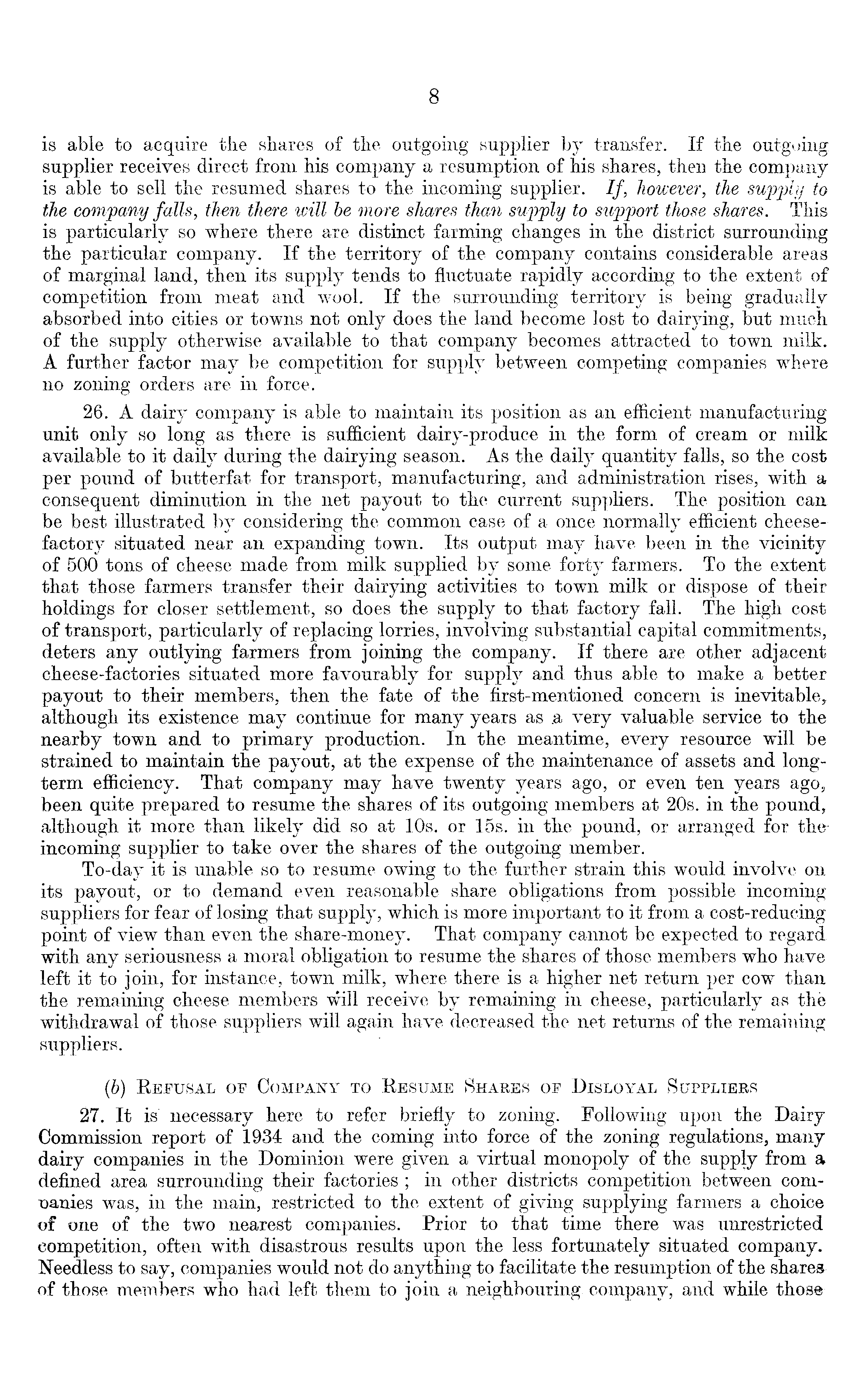 is able to acquire the shares of the outgoing supplier by transfer. If the outgoing supplier receives direct from his company a resumption of his shares, then the company is able to sell the resumed shares to the incoming supplier. If, however, the supply to the company falls, then there will be more shares than supply to support those shares. This is particularly so where there are distinct farming changes in the district surrounding the particular company. If the territory of the company contains considerable areas of marginal land, then its supply tends to fluctuate rapidly according to the extent of competition from meat and wool. If the surrounding territory is being gradually absorbed into cities or towns not only does the land become lost to dairying, but much of the supply otherwise available to that company becomes attracted to town milk. A further factor may be competition for supply between competing companies where no zoning orders are in force. 26. A dairy company is able to maintain its position as an efficient manufacturing unit only so long as there is sufficient dairy-produce in the form of cream or milk available to it daily during the dairying season. As the daily quantity falls, so the cost per pound of butterfat for transport, manufacturing, and administration rises, with a consequent diminution in the net payout to the current suppliers. The position can be best illustrated by considering the common case of a once normally efficient cheesefactory situated near an expanding town. Its output may have been in the vicinity of 500 tons of cheese made from milk supplied by some forty farmers. To the extent that those farmers transfer their dairying activities to town milk or dispose of their holdings for closer settlement, so does the supply to that factory fall. The high cost of transport, particularly of replacing lorries, involving substantial capital commitments,, deters any outlying farmers from joining the company. If there are other adjacent cheese-factories situated more favourably for supply and thus able to make a better payout to their members, then the fate of the first-mentioned concern is inevitable, although its existence may continue for many years as a very valuable service to the nearby town and to primary production. In the meantime, every resource will be strained to maintain the payout, at the expense of the maintenance of assets and longterm efficiency. That company may have twenty years ago, or even ten years ago, been quite prepared to resume the shares of its outgoing members at 20s. in the pound, although it more than likely did so at 10s. or 15s. in the pound, or arranged for theincoming supplier to take over the shares of the outgoing member. To-day it is unable so to resume owing to the further strain this would involve on. its payout, or to demand even reasonable share obligations from possible incoming suppliers for fear of losing that supply, which is more important to it from a cost-reducing point of view than even the share-money. That company cannot be expected to regard with any seriousness a moral obligation to resume the shares of those members who have left it to join, for instance, town milk, where there is a higher net return per cow than the remaining cheese members will receive by remaining in cheese, particularly as the withdrawal of those suppliers will again have decreased the net returns of the remaining suppliers. (b) Refusal of Company to Resume Shares of Disloyal Suppliers 27. It is necessary here to refer briefly to zoning. Following upon the Dairy Commission report of 1934 and the coming into force of the zoning regulations, many dairy companies in the Dominion were given a virtual monopoly of the supply from a defined area surrounding their factories ; in other districts competition between companies was, in the main, restricted to the extent of giving supplying farmers a choice of one of the two nearest companies. Prior to that time there was unrestricted competition, often with disastrous results upon the less fortunately situated company. Needless to say, companies would not do anything to facilitate the resumption of the sharesof those members who had left them to join a neighbouring company, and while thos»