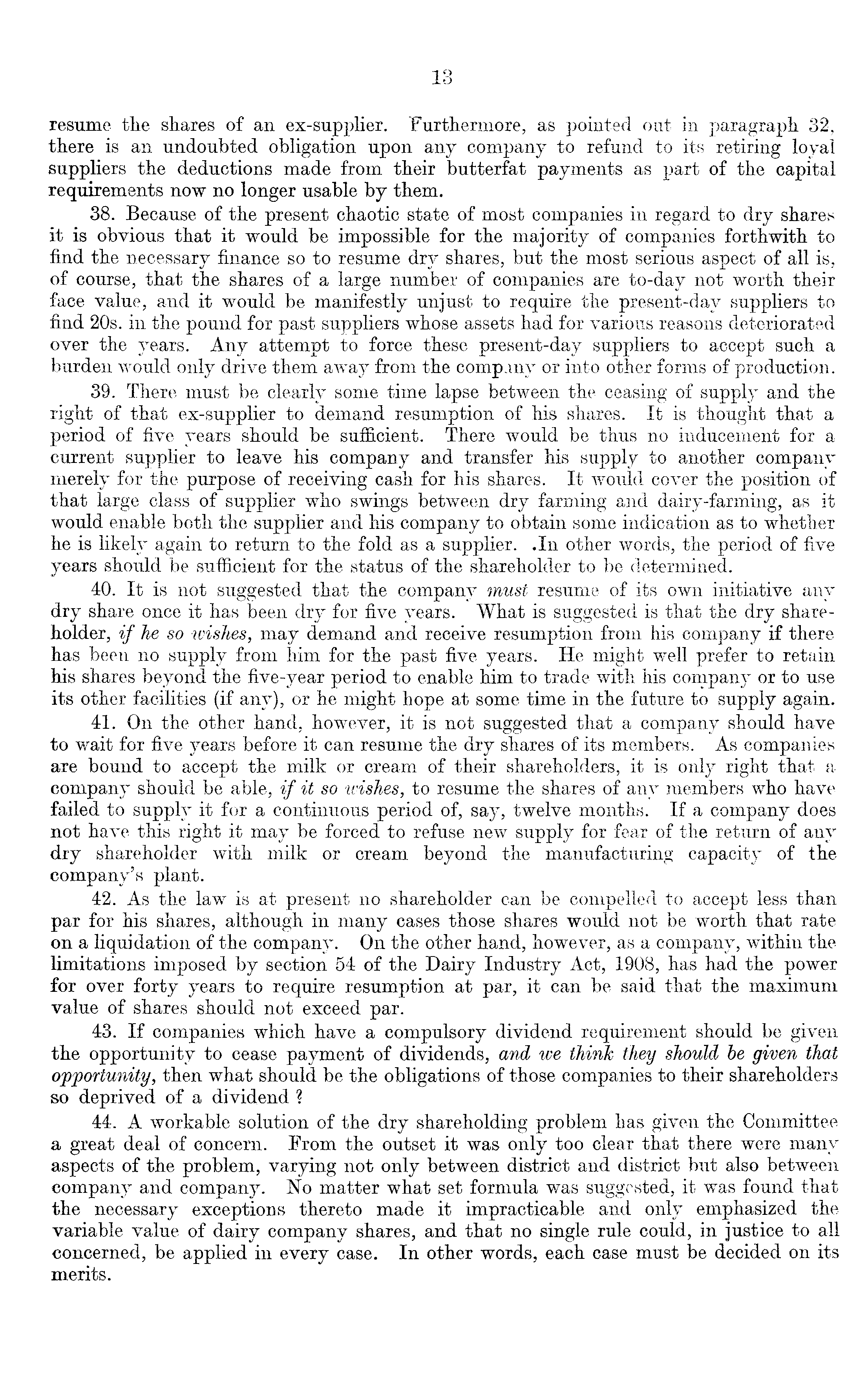 resume the shares of an ex-supplier. Furthermore, as pointed out in paragraph 32, there is an undoubted obligation upon any company to refund to its retiring loyal suppliers the deductions made from their butterfat payments as part of the capital requirements now no longer usable by them. 38. Because of the present chaotic state of most companies in regard to dry shares it is obvious that it would be impossible for the majority of companies forthwith to find the necessary finance so to resume dry shares, but the most serious aspect of all is, of course, that the shares of a large number of companies are to-day not worth their face value, and it would be manifestly unjust to require the present-day suppliers to find 20s. in the pound for past suppliers whose assets had for various reasons deteriorated over the years. Any attempt to force these present-day suppliers to accept such a burden would only drive them away from the company or into other forms of production. 39. There must be clearly some time lapse between the ceasing of supply and the right of that ex-supplier to demand resumption of his shares. It is thought that a period of five years should be sufficient. There would be thus no inducement for a current supplier to leave his company and transfer his supply to another company merely for the purpose of receiving cash for his shares. It would cover the position of that large class of supplier who swings between dry farming and dairy-farming, as it would enable both the supplier and his company to obtain some indication as to whether he is likely again to return to the fold as a supplier. .In other words, the period of five years should be sufficient for the status of the shareholder to be determined. 40. It is not suggested that the company must resume of its own initiative any dry share once it has been dry for five years. What is suggested is that the dry shareholder, if he so wishes, may demand and receive resumption from his company if there has been no supply from him for the past five years. He might well prefer to retain his shares beyond the five-year period to enable liim to trade with his company or to use its other facilities (if any), or he might hope at some time in the future to supply again. 41. On the other hand, however, it is not suggested that a company should have to wait for five years before it can resume the dry shares of its members. As companies are bound to accept the milk or cream of their shareholders, it is only right that a company should be able, if it so wishes, to resume the shares of any members who have failed to supply it for a continuous period of, say, twelve months. If a company does not have this right it may be forced to refuse new supply for fear of the return of any dry shareholder with milk or cream beyond the manufacturing capacity of the company's plant. 42. As the law is at present no shareholder can be compelled to accept less than par for his shares, although in many cases those shares would not be worth that rate on a liquidation of the company. On the other hand, however, as a company, within the limitations imposed by section 54 of the Dairy Industry Act, 1908, has had the power for over forty years to require resumption at par, it can be said that the maximum value of shares should not exceed par. 43. If companies which have a compulsory dividend requirement should be given the opportunity to cease payment of dividends, and we think they should be given that opportunity, then what should be the obligations of those companies to their shareholders so deprived of a dividend ? 44. A workable solution of the dry shareholding problem has given the Committee a great deal of concern. From the outset it was only too clear that there were many aspects of the problem, varying not only between district and district but also between company and company. No matter what set formula was suggested, it was found that the necessary exceptions thereto made it impracticable and only emphasized the variable value of dairy company shares, and that no single rule could, in justice to all concerned, be applied in every case. In other words, each case must be decided on its merits.