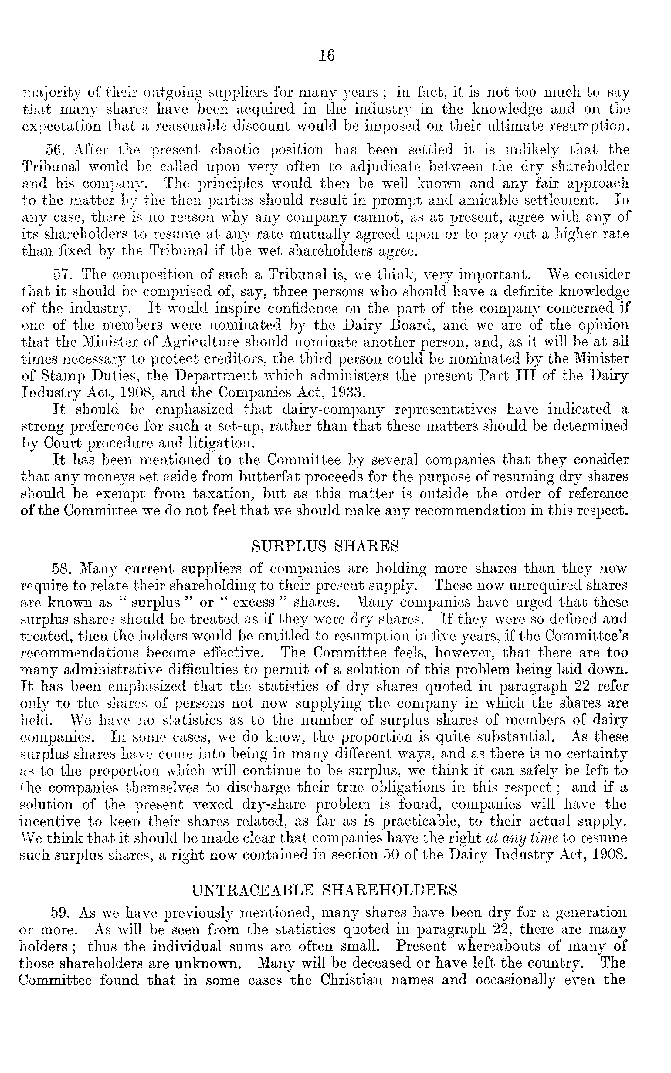 majority of their outgoing suppliers for many years ; in fact, it is not too much to say that many shares have been acquired in the industry in the knowledge and on the expectation that a reasonable discount would be imposed on their ultimate resumption. 56. After the present chaotic position has been settled it is unlikely that the Tribunal would be called upon very often to adjudicate between the dry shareholder and his company. The principles would then be well known and any fair approach to the matter by the then parties should result in prompt and amicable settlement. In any case, there is no reason why any company cannot, as at present, agree with any of its shareholders to resume at any rate mutually agreed upon or to pay out a higher rate than fixed by the Tribunal if the wet shareholders agree. 57. The composition of such a Tribunal is, we think, very important. We consider that it should be comprised of, say, three persons who should have a definite knowledge of the industry. It would inspire confidence on the part of the company concerned if one of the members were nominated by the Dairy Board, and we are of the opinion that the Minister of Agriculture should nominate another person, and, as it will be at all times necessary to protect creditors, the third person could be nominated by the Minister of Stamp Duties, the Department which administers the present Part 111 of the Dairy Industry Act, 1908, and the Companies Act, 1933. It should be emphasized that dairy-company representatives have indicated a strong preference for such a set-up, rather than that these matters should be determined by Court procedure and litigation. It has been mentioned to the Committee by several companies that they consider that any moneys set aside from butterfat proceeds for the purpose of resuming dry shares should be exempt from taxation, but as this matter is outside the order of reference of the Committee we do not feel that we should make any recommendation in this respect. SURPLUS SHARES 58. Many current suppliers of companies are holding more shares than they now require to relate their shareholding to their present supply. These now unrequired shares are known as " surplus "or " excess " shares. Many companies have urged that these surplus shares should be treated as if they were dry shares. If they were so defined and treated, then the holders would be entitled to resumption in five years, if the Committee's recommendations become effective. The Committee feels, however, that there are too many administrative difficulties to permit of a solution of this problem being laid down. It has been emphasized that the statistics of dry shares quoted in paragraph 22 refer only to the shares of persons not now supplying the company in which the shares are held. We have no statistics as to the number of surplus shares of members of dairy companies. In some cases, we do know, the proportion is quite substantial. As these surplus shares have come into being in many different ways, and as there is no certainty as to the proportion which will continue to be surplus, we think it can safely be left to the companies themselves to discharge their true obligations in this respect; and if a solution of the present vexed dry-share problem is found, companies will have the incentive to keep their shares related, as far as is practicable, to their actual supply. We think that it should be made clear that companies have the right at any time to resume such surplus shares, a right now contained in section 50 of the Dairy Industry Act, 1908. UNTRACEABLE SHAREHOLDERS 59. As we have previously mentioned, many shares have been dry for a generation or more. As will be seen from the statistics quoted in paragraph 22, there are many holders; thus the individual sums are often small. Present whereabouts of many of those shareholders are unknown. Many will be deceased or have left the country. The Committee found that in some cases the Christian names and occasionally even the