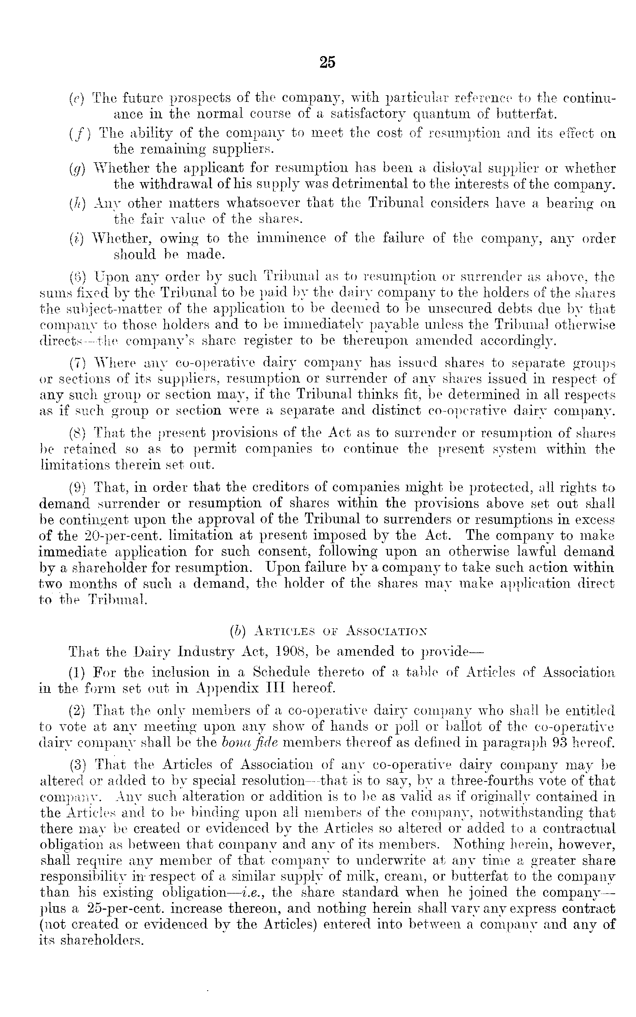 (e) The future prospects of the company, with particular reference to the continuance in the normal course of a satisfactory quantum of butterfat. (/) The ability of the company to meet the cost of resumption and its effect on the remaining suppliers. (g) Whether the applicant for resumption has been a disloyal supplier or whether the withdrawal of his supply was detrimental to the interests of the company. (h) Any other matters whatsoever that the Tribunal considers have a bearing on the fair value of the shares. (i) Whether, owing to the imminence of the failure of the company, any order should be made. (6) Upon any order by such Tribunal as to resumption or surrender as above, the sums fixed by the Tribunal to be paid by the dairy company to the holders of the shares the subject-matter of the application to be deemed to be unsecured debts due by that company to those holders and to be immediately payable unless the Tribunal otherwise directs —the company's share register to be thereupon amended accordingly. (7) Where any co-operative dairy company has issued shares to separate groups or sections of its suppliers, resumption or surrender of any shares issued in respect of any such group or section may, if the Tribunal thinks fit, be determined in all respects as if such group or section were a separate and distinct co-operative dairy company. (8) That the present provisions of the Act as to surrender or resumption of shares be retained so as to permit companies to continue the present system within the limitations therein set out. (9) That, in order that the creditors of companies might be protected, all rights to demand surrender or resumption of shares within the provisions above set out shall be contingent upon the approval of the Tribunal to surrenders or resumptions in excess of the 20-per-cent. limitation at present imposed by the Act. The company to make immediate application for such consent, following upon an otherwise lawful demand by a shareholder for resumption. Upon failure by a company to take such action within two months of such a demand, the holder of the shares may make application direct to the Tribunal. (b) Articles op Association That the Dairy Industry Act, 1908, be amended to provide—(l) For the inclusion in a Schedule thereto of a table of Articles of Association in the form set out in Appendix 111 hereof. (2) That the only members of a co-operative dairy company who shall be entitled to vote at any meeting upon any show of hands or poll or ballot of the co-operative dairy company shall be the bona fide members thereof as defined in paragraph 93 hereof. (3) That the Articles of Association of any co-operative dairy company may be altered or added to by special resolution —that is to say, by a three-fourths vote of that company. Any such alteration or addition is to be as valid as if originally contained in the Articles and to be binding upon all members of the company, notwithstanding that there may be created or evidenced by the Articles so altered or added to a contractual obligation as between that company and any of its members. Nothing herein, however, shall require any member of that company to underwrite at any time a greater share responsibility in-respect of a similar supply of milk, cream, or butterfat to the company than his existing obligation —i.e., the share standard when he joined the company—plus a 25-per-cent. increase thereon, and nothing herein shall vary any express contract (not created or evidenced by the Articles) entered into between a company and any of its shareholders.