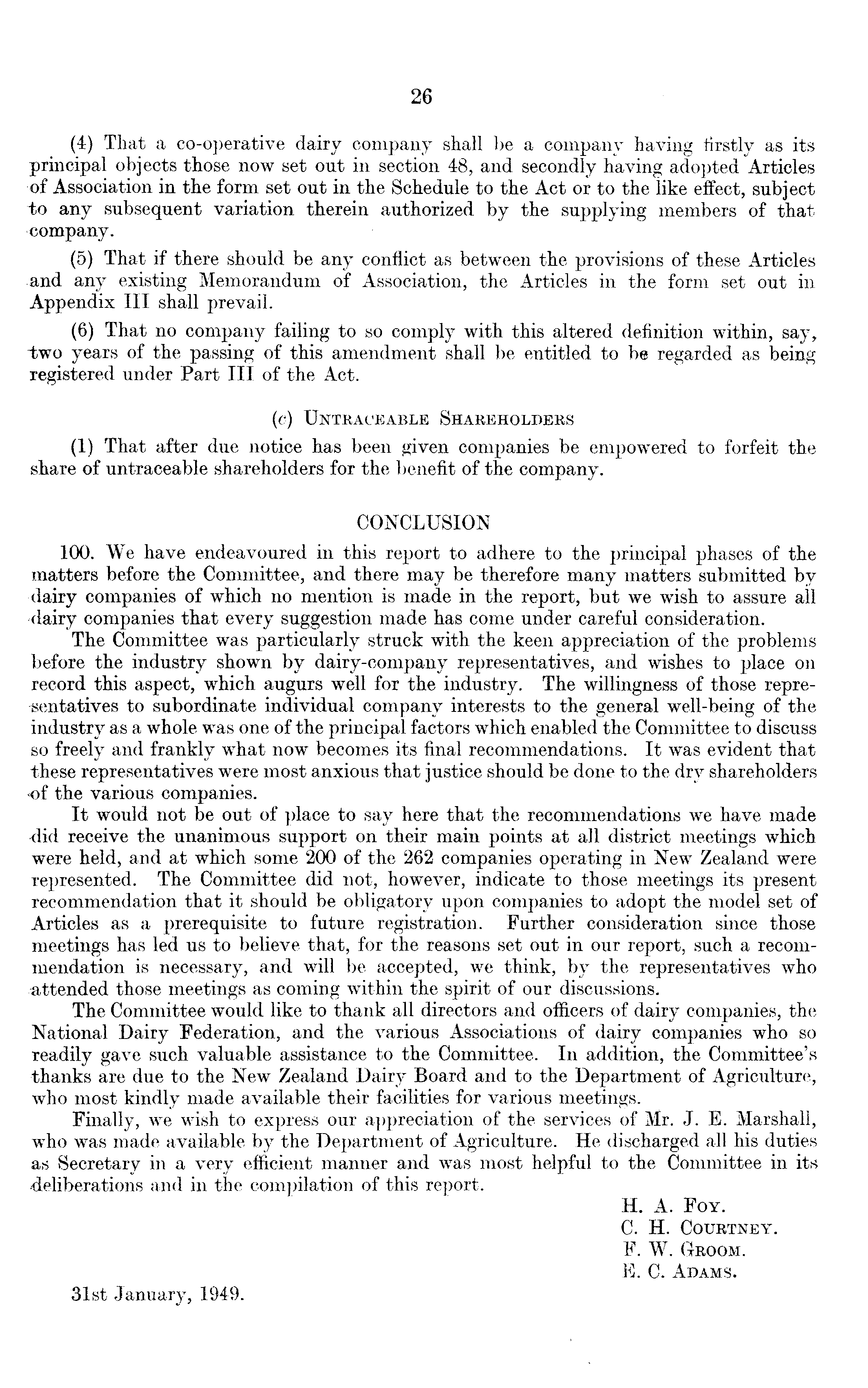 (4) That a co-operative dairy company shall be a company having firstly as its principal objects those now set out in section 48, and secondly having adopted Articles of Association in the form set out in the Schedule to the Act or to the like effect, subject to any subsequent variation therein authorized by the supplying members of that company. (5) That if there should be any conflict as between the provisions of these Articles and any existing Memorandum of Association, the Articles in the form set out in Appendix 111 shall prevail. (6) That no company failing to so comply with this altered definition within, say, two years of the passing of this amendment shall be entitled to be regarded as being registered under Part 111 of the Act. (c) Untraceable Shareholders (1) That after due notice has been given companies be empowered to forfeit the share of untraceable shareholders for the benefit of the company. CONCLUSION 100. We have endeavoured in this report to adhere to the principal phases of the matters before the Committee, and there may be therefore many matters submitted by dairy companies of which no mention is made in the report, but we wish to assure all •dairy companies that every suggestion made has come under careful consideration. The Committee was particularly struck with the keen appreciation of the problems before the industry shown by dairy-company representatives, and wishes to place on record this aspect, which augurs well for the industry. The willingness of those representatives to subordinate individual company interests to the general well-being of the industry as a whole was one of the principal factors which enabled the Committee to discuss so freely and frankly what now becomes its final recommendations. It was evident that these representatives were most anxious that justice should be done to the dry shareholders •of the various companies. It would not be out of place to say here that the recommendations we have made ■did receive the unanimous support on their main points at all district meetings which were held, and at which some 200 of the 262 companies operating in New Zealand were represented. The Committee did not, however, indicate to those meetings its present recommendation that it should be obligatory upon companies to adopt the model set of Articles as a prerequisite to future registration. Further consideration since those meetings has led us to believe that, for the reasons set out in our report, such a recommendation is necessary, and will be accepted, we think, by the representatives who attended those meetings as coming within the spirit of our discussions. The Committee would like to thank all directors and officers of dairy companies, the National Dairy Federation, and the various Associations of dairy companies who so readily gave such valuable assistance to the Committee. In addition, the Committee's thanks are due to the New Zealand Dairy Board and to the Department of Agriculture, who most kindly made available their facilities for various meetings. Finally, we wish to express our appreciation of the services of Mr. J. E. Marshall, who was made available by the Department of Agriculture. He discharged all his duties a,s Secretary in a very efficient manner and was most helpful to the Committee in its deliberations and in the compilation of this report. H. A. Foy. C. H. Courtney. F. W. Groom. E. C. Adams. 31st January, 1949.