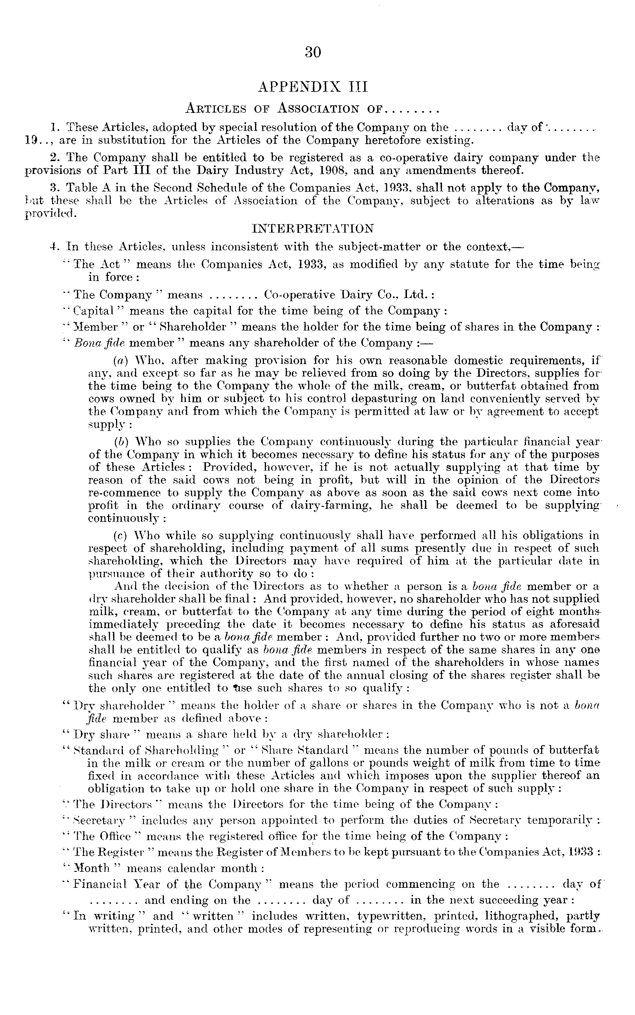 APPENDIX 111 Articles of Association of 1. These Articles, adopted by special resolution of the Company on the day of* 19.are in substitution for the Articles of the Company heretofore existing. 2. The Company shall be entitled to be registered as a co-operative dairy company under the provisions of Part 111 of the Dairy Industry Act, 1908, and any amendments thereof. 3. Table A in the Second Schedule of the Companies Act, 1933, shall not apply to the Company, but these shall be the Articles of Association of the Company, subject to alterations as by law provided. INTERPRETATION 4. In these Articles, unless inconsistent with the subject-matter or the context, — "The Act" means the Companies Act, 1933, as modified by any statute for the time being in force : " The Company " means Co-operative Dairy Co., Ltd.: " Capital" means the capital for the time being of the Company : " Member " or " Shareholder " means the holder for the time being of shares in the Company r " Bona fide member " means any shareholder of the Company : (a) Who, after making provision for his own reasonable domestic requirements, if any, and except so far as he may be relieved from so doing by the Directors, supplies for the time being to the Company the whole of the milk, cream, or butterfat obtained from cows owned by him or subject to his control depasturing on land conveniently served by the Company and from which the Company is permitted at law or by agreement to accept supply: (b) Who so supplies the Company continuously during the particular financial year of the Company in which it becomes necessary to define his status for any of the purposes of these Articles : Provided, however, if he is not actually supplying at that time by reason of the said cows not being in profit, but will in the opinion of the Directors re-commence to supply the Company as above as soon as the said cows next come into profit in the ordinary course of dairy-farming, he shall be deemed to be supplying continuously: (c) Who while so supplying continuously shall have performed all his obligations in respect of shareholding, including payment of all sums presently due in respect of such shareholding, which the Directors may have required of him at the particular date in pursuance of their authority so to do : And the decision of the Directors as to whether a person is a bona fide member or a dry shareholder shall be final: And provided, however, no shareholder who has not supplied milk, cream, or butterfat to the Company at any time during the period of eight months immediately preceding the date it becomes necessary to define his status as aforesaid shall be deemed to be a bona fide member : And, provided further no two or more members shall be entitled to qualify as bona fide members in respect of the same shares in any one financial year of the Company, and the first named of the shareholders in whose names such shares are registered at the date of the annual closing of the shares register shall be the only one entitled to Tise such shares to so qualify: " Dry shareholder " means the holder of a share or shares in the Company who is not a bona fide member as defined above: " Dry share " means a share held by a dry shareholder: " Standard of Shareholding " or " Share Standard " means the number of pounds of butterfat in the milk or cream or the number of gallons or pounds weight of milk from time to time fixed in accordance with these Articles and which imposes upon the supplier thereof an obligation to take up or hold one share in the Company in respect of such supply : The Directors " means the Directors for the time being of the Company : " Secretary " includes any person appointed to perform the duties of Secretary temporarily :: " The Office " means the registered office for the time being of the Company : " The Register " means the Register of Members to be kept pursuant to the Companies Act, 1933 :: " Month " means calendar month : "Financial Year of the Company" means the period commencing on the day of and ending on the ~ day of in the next succeeding year: "In writing" and "written" includes written, typewritten, printed, lithographed, partly written, printed, and other modes of representing or reproducing words in a visible form.