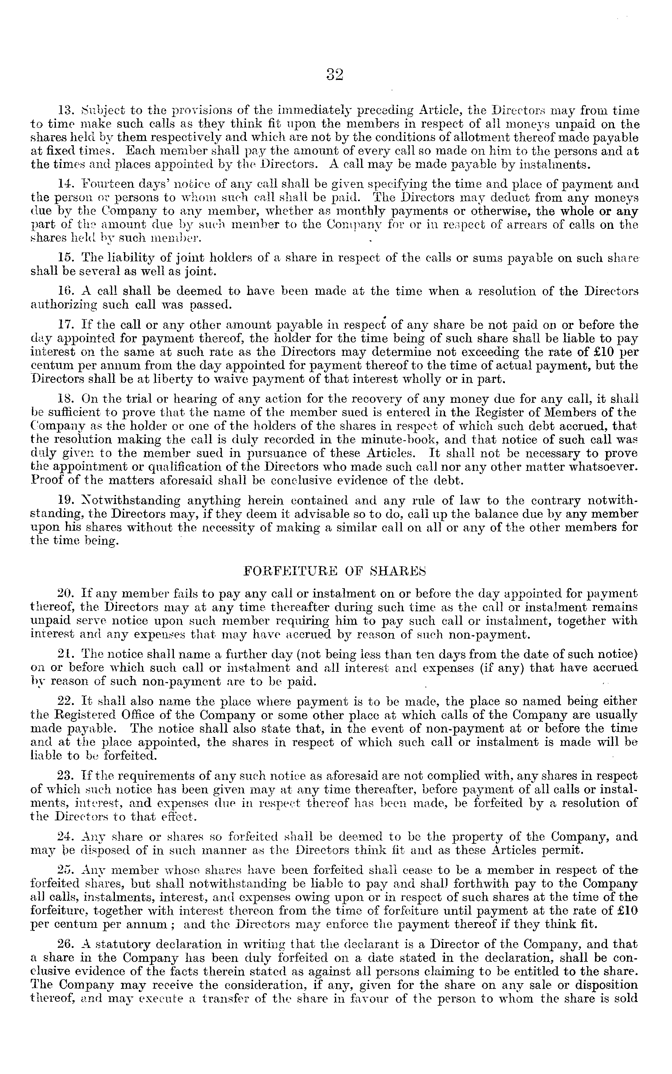 13. Subject to the provisions of the immediately preceding Article, the Directors may from time to time make such calls as they think fit upon the members in respect of all moneys unpaid on the shares held by them respectively and which are not by the conditions of allotment thereof made payable at fixed times. Each member shall pay the amount of every call so made on him to the persons and at the times and places appointed by the Directors. A call may be made payable by instalments. 14. Fourteen days' notice of any call shall be given specifying the time and place of payment and the person or persons to whom such call shall be paid. The Directors may deduct from any moneys due by the Company to any member, whether as monthly payments or otherwise, the whole or any part of the amount due by such member to the Company for or in respect of arrears of calls on the shares held by such member. 15. The liability of joint holders of a share in respect of the calls or sums payable on such shareshall be several as well as joint. 16. A call shall be deemed to have been made at the time when a resolution of the Directors authorizing such call was passed. 17. If the call or any other amount payable in respect of any share be not paid on or before the day appointed for payment thereof, the holder for the time being of such share shall be liable to pay interest on the same at such rate as the Directors may determine not exceeding the rate of £lO per centum per annum from the day appointed for payment thereof to the time of actual payment, but the Directors shall be at liberty to waive payment of that interest wholly or in part. 18. On the trial or hearing of any action for the recovery of any money due for any call, it shall be sufficient to prove that the name of the member sued is entered in the Register of Members of the Company as the holder or one of the holders of the shares in respect of which such debt accrued, that the resolution making the call is duly recorded in the minute-book, and that notice of such call was duly given to the member sued in pursuance of these Articles. It shall not be necessary to prove the appointment or qualification of the Directors who made such call nor any other matter whatsoever. Proof of the matters aforesaid shall be conclusive evidence of the debt. 19. Notwithstanding anything herein contained and any rule of law to the contrary notwithstanding, the Directors may, if they deem it advisable so to do, call up the balance due by any member upon his shares without the necessity of making a similar call on all or any of the other members for .the time being. FORFEITURE OF SHARES 20. If any member fails to pay any call or instalment on or before the day appointed for payment thereof, the Directors may at any time thereafter during such time as the call or instalment remains unpaid serve notice upon such member requiring him to pay such call or instalment, together with interest and any expenses that may have accrued by reason of such non-payment. 21. The notice shall name a further day (not being less than ten days from the date of such notice) on or before which such call or instalment and all interest and expenses (if any) that have accrued by reason of such non-payment are to be paid. 22. It shall also name the place where payment is to be made, the place so named being either the Registered Office of the Company or some other place at which calls of the Company are usually made payable. The notice shall also state that, in the event of non-payment at or before the time and at the place appointed, the shares in respect of which such call or instalment is made will be liable to be forfeited. 23. If the requirements of any such notice as aforesaid are not complied with, any shares in respect of which such notice has been given may at any time thereafter, before payment of all calls or instalments, interest, and expenses due in respect thereof has been made, be forfeited by a resolution of the Directors to that effect. 24. Any share or shares so forfeited shall be deemed to be the property of the Company, and may be disposed of in such manner as the Directors think fit and as these Articles permit. 25. Any member whose shares have been forfeited shall cease to be a member in respect of the forfeited shares, but shall notwithstanding be liable to pay and shall forthwith pay to the Company all calls, instalments, interest, and expenses owing upon or in respect of such shares at the time of the forfeiture, together with interest thereon from the time of forfeiture until payment at the rate of £lO per centum per annum ; and the Directors may enforce the payment thereof if they think fit. 26. A statutory declaration in writing that the declarant is a Director of the Company, and that a share in the Company has been duly forfeited on a date stated in the declaration, shall be conclusive evidence of the facts therein stated as against all persons claiming to be entitled to the share. The Company may receive the consideration, if any, given for the share on any sale or disposition thereof, and may execute a transfer of the share in favour of the person to whom the share is sold