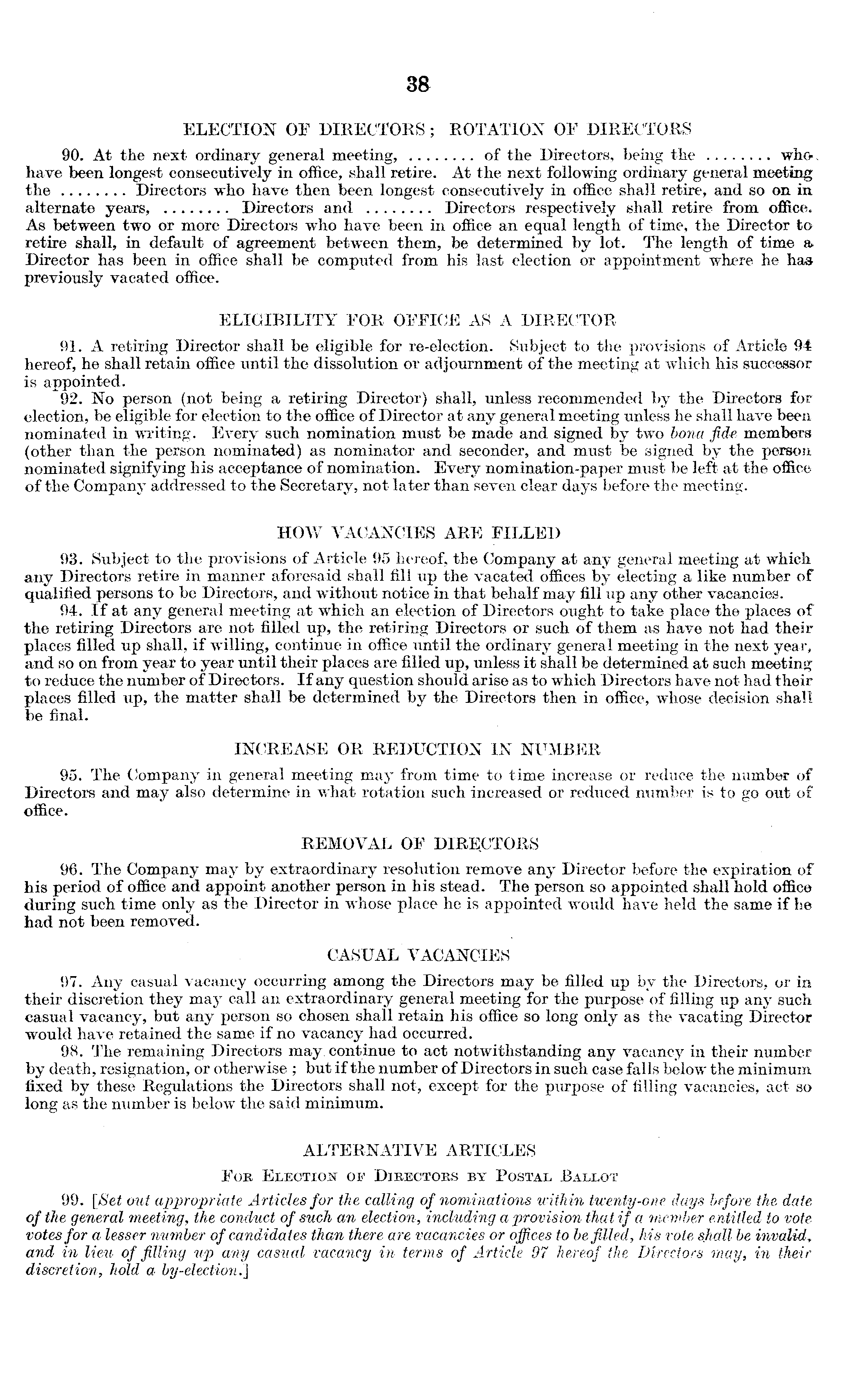 ELECTION OF DIRECTORS; ROTATION OF DIRECTORS 90. At the next ordinary general meeting, of the Directors, being the who have been longest consecutively in office, shall retire. At the next following ordinary general meeting the Directors who have then been longest consecutively in office shall retire, and so on in alternate years, Directors and Directors respectively shall retire from office. As between two or more Directors who have been in office an equal length of time, the Director to retire shall, in default of agreement between them, be determined by lot. The length of time a Director has been in office shall be computed from his last election or appointment where he has previously vacated office. ELIGIBILITY FOR OFFICE AS A DIRECTOR 91. A retiring Director shall be eligible for re-election. Subject to the provisions of Article 94 hereof, he shall retain office until the dissolution or adjournment of the meeting at which his successor is appointed. 92. No person (not being a retiring Director) shall, unless recommended by the Directors for election, be eligible for election to the office of Director at any general meeting unless he shall have been nominated in writing. Every such nomination must be made and signed by two bona fide members (other than the person nominated) as nominator and seconder, and must be signed by the person nominated signifying his acceptance of nomination. Every nomination-paper must be left at the office of the Company addressed to the Secretary, not later than seven clear days before the meeting. HOW VACANCIES ARE FILLED 93. Subject to the provisions of Article 95 hereof, the Company at any general meeting at which any Directors retire in manner aforesaid shall fill up the vacated offices by electing a like number of qualified persons to be Directors, and without notice in that behalf may fill up any other vacancies. 94. If at any general meeting at which an election of Directors ought to take place the places of the retiring Directors are not filled up, the retiring Directors or such of them as have not had their places filled up shall, if willing, continue in office until the ordinary general meeting in the next year, and so on from year to year until their places are filled up, unless it shall be determined at such meeting to reduce the number of Directors. If any question should arise as to which Directors have not had their places filled up, the matter shall be determined by the Directors then in office, whose decision shall be final. INCREASE OR REDUCTION IN NUMBER 95. The Company in general meeting may from time to time increase or reduce the number of Directors and may also determine in what rotation such increased or reduced number is to go out of office. REMOVAL OF DIRECTORS 96. The Company may by extraordinary resolution remove any Director before the expiration of his period of office and appoint another person in his stead. The person so appointed shall hold office during such time only as the Director in whose place he is appointed would have held the same if he had not been removed. CASUAL VACANCIES 97. Any casual vacancy occurring among the Directors may be filled up by the Directors, or in their discretion they may call an extraordinary general meeting for the purpose of filling up any such casual vacancy, but any person so chosen shall retain his office so long only as the vacating Director would have retained the same if no vacancy had occurred. 98. The remaining Directors may continue to act notwithstanding any vacancy in their number by death, resignation, or otherwise ; but if the number of Directors in such case falls below the minimum fixed by these Regulations the Directors shall not, except for the purpose of filling vacancies, act so long as the number is below the said minimum. ALTERNATIVE ARTICLES For Election of Directors by Postal Ballot 99. [Set out appropriate Articles for the calling of nominations within twenty-one days before the date of the general meeting, the conduct of such an election, including a provision that if a member entitled to vote votes for a lesser number of candidates than there are vacancies or offices to be filled, his vote shall be invalid, and in lieu of filling up any casual vacancy in terms of Article 97 hereof the Directors may, in their discretion, hold a by-election.] .