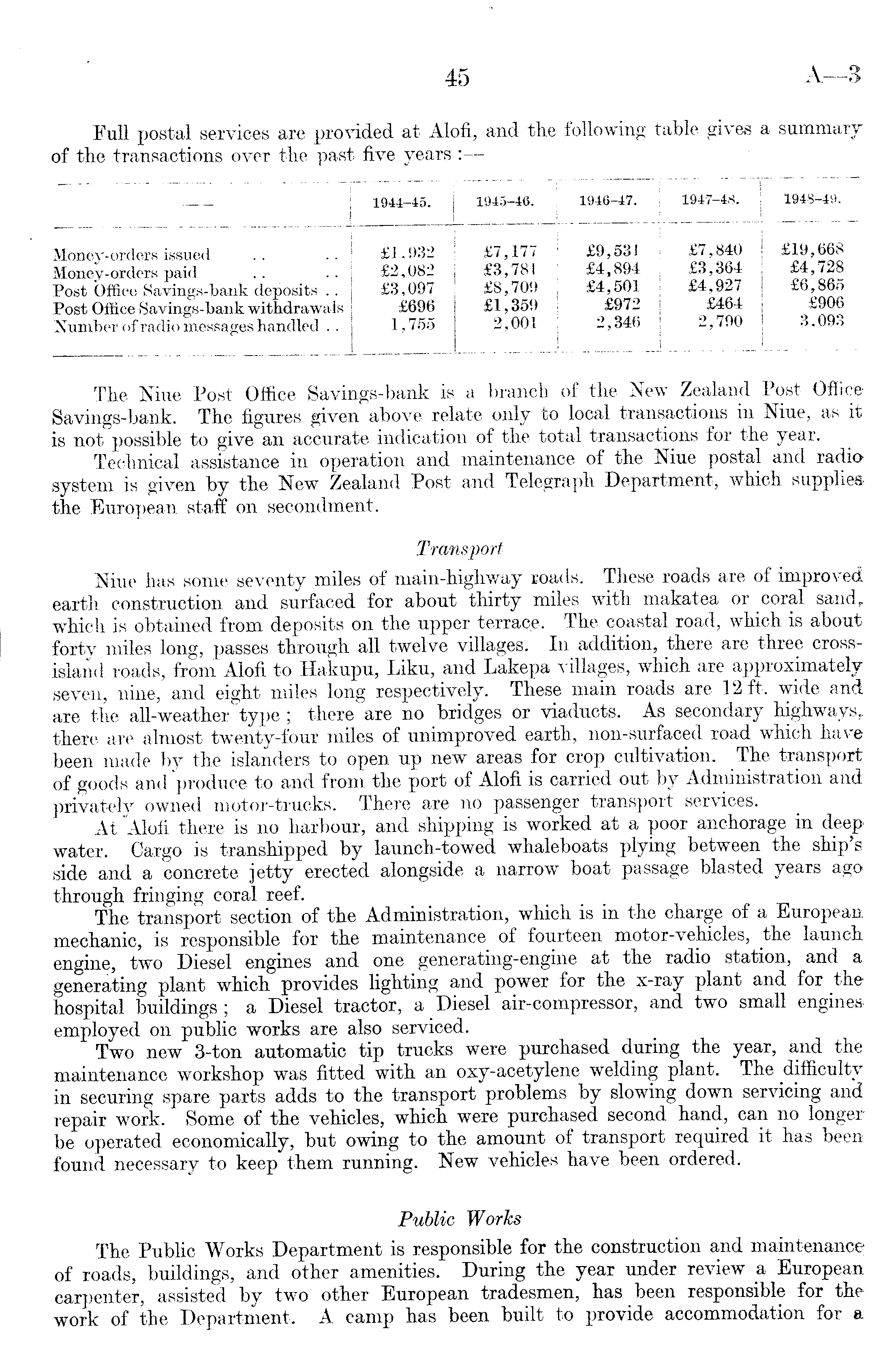 The Niue Post Office Savings-bank is a branch of the New Zealand Post Office Savings-bank. The figures given above relate only to local transactions in Niue, as it is not possible to give an accurate indication of the total transactions for the year. Technical assistance in operation and maintenance of the Niue postal and radio system is given by the New Zealand Post and Telegraph Department, which supplies the European staff on secondment. Transport Niue has some seventy miles of main-highway toads. These roads are of improved earth construction and surfaced for about thirty miles with makatea or coral sand r which is obtained from deposits on the upper terrace. The coastal road, which is about forty miles long, passes through all twelve villages. In addition, there are three crossisland roads, from Alofi to Hakupu, Liku, and Lakepa villages, which are approximately seven, nine, and eight miles long respectively. ' These main roads are 12 ft. wide and are the all-weather type ; there are no bridges or viaducts. As secondary highways,, there are almost twenty-four miles of unimproved earth, non-surfaced road which have been made by the islanders to open up new areas for crop cultivation. The transport of goods and produce to and from the port of Alofi is carried out by Administration and privately owned motor-trucks. There are no passenger transport services. At Alofi there is no harbour, and shipping is worked at a poor anchorage in deep water. Cargo is transhipped by launch-towed whaleboats plying between the ship's side and a concrete jetty erected alongside a narrow boat passage blasted years ago through fringing coral reef. The transport section of the Administration, which is in the charge of a European mechanic, is responsible for the maintenance of fourteen motor-vehicles, the launch engine, two Diesel engines and one generating-engine at the radio station, and a generating plant which provides lighting and power for the x-ray plant and for the hospital buildings; a Diesel tractor, a Diesel air-compressor, and two small engines employed on public works are also serviced. Two new 3-ton automatic tip trucks were purchased during the year, and the maintenance workshop was fitted with an oxy-acetylene welding plant. The difficulty in securing spare parts adds to the transport problems by slowing down servicing and repair work. Some of the vehicles, which were purchased second hand, can no longer be Operated economically, but owing to the amount of transport required it has been found necessary to keep them running. New vehicles have been ordered. Public WorJcs The Public Works Department is responsible for the construction and maintenance of roads, buildings, and other amenities. During the year under review a European carpenter, assisted by two otfher European tradesmen, has been responsible for the work of the Department. A camp has been built to provide accommodation for a