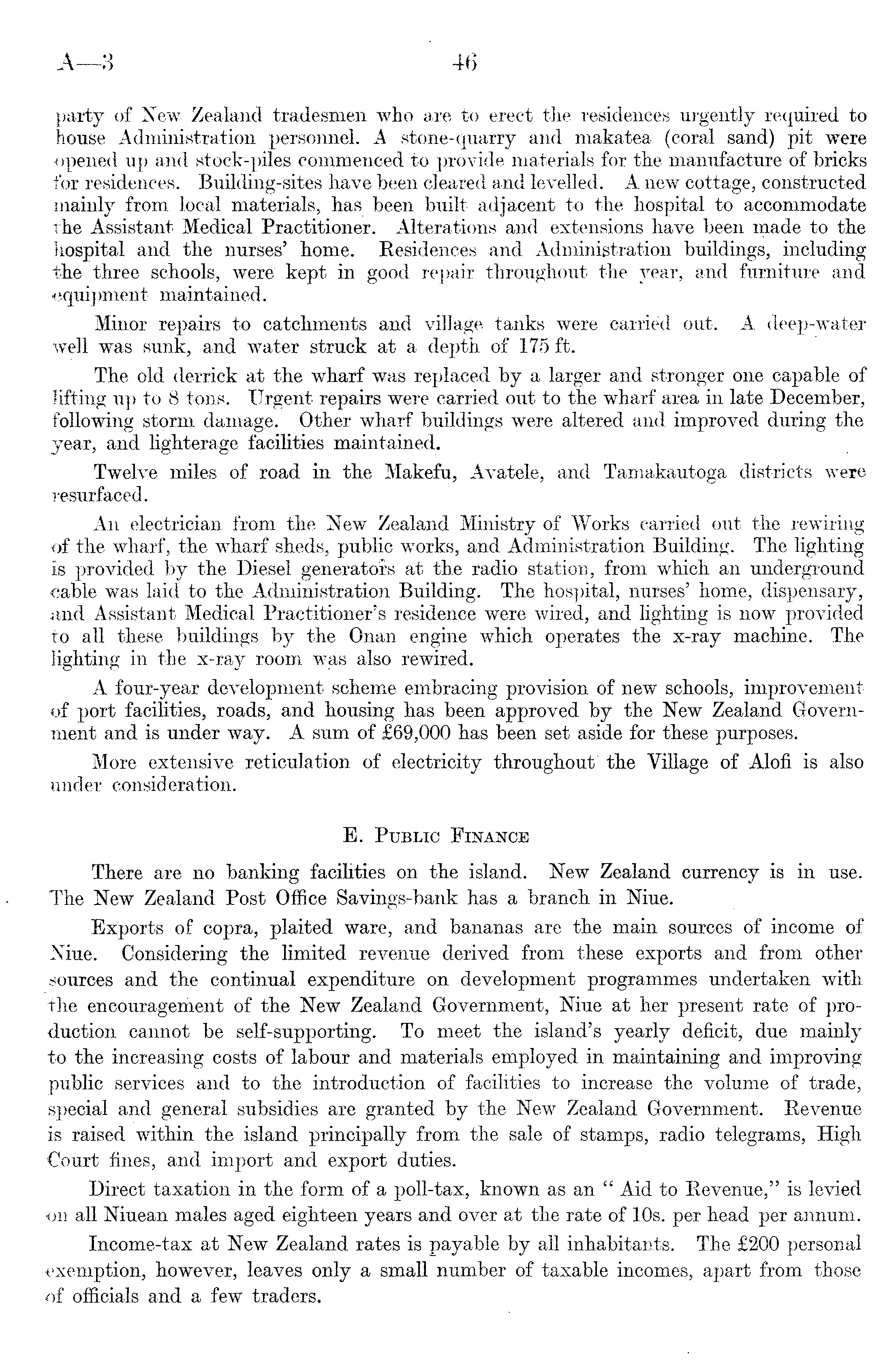 party of New Zealand tradesmen who are to erect the residences urgently required to house Administration personnel. A stone-quarry and makatea (coral sand) pit were opened up and stock-piles commenced to provide materials for the manufacture of bricks for residences. Building-sites have been cleared and levelled. A new cottage, constructed mainly from local materials, has been built adjacent to the hospital to accommodate the Assistant Medical Practitioner. Alterations and extensions have been made to the hospital and the nurses' home. Residences and Administration buildings, including the three schools, were kept in good repair throughout the year, and furniture and equipment maintained. Minor repairs to catchments and village tanks were carried out. A deep-water well was sunk, and water struck at a depth of 175 ft. The old derrick at the wharf was replaced by a larger and'stronger one capable of lifting up to 8 tons. Urgent repairs were carried out to the wharf area in late December, following storm damage. Other wharf buildings were altered and improved during the year,, and lighterage facilities maintained. Twelve miles of road in the Makefu, Avatele, and Tamakautoga districts were resurfaced. An electrician from the New Zealand Ministry of Works carried out the rewiring of the wharf, the wharf sheds, public works, and Administration Building. The lighting is provided by the Diesel generators at the radio station, from which an underground cable was laid to the Administration Building. The hospital, nurses' home, dispensary, and Assistant Medical Practitioner's residence were wired, and lighting is now provided to all these buildings by the Onan engine which operates the x-ray machine. . The lighting in the x-ray room was also rewired. A four-year development scheme embracing provision of new schools, improvement of port facilities, roads, and housing has been approved by the New Zealand Government and is under way. A sum of £69,000 has been set aside for these purposes. More extensive reticulation of electricity throughout the Village of Alofi is also under consideration. E. Public Finance There are no banking facilities on the island. New Zealand currency is in use. The New Zealand Post Office Savings-bank has a branch in Niue. Exports of copra, plaited ware, and bananas are the main sources of income of Niue. Considering the limited revenue derived from these exports and from other sources and the continual expenditure on development programmes undertaken with the encouragement of the New Zealand Government, Niue at her present rate of production cannot be self-supporting. To meet the island's yearly deficit, due mainly to the increasing costs of labour and materials employed in maintaining and improving public services and to the introduction of facilities to increase the volume of trade, special and general subsidies are granted by the New Zealand Government. Revenue is raised within the island principally from the sale of stamps, radio telegrams, High Court fines, and import and export duties. Direct taxation in the form of a poll-tax, known as an " Aid to Revenue," is levied on all Niuean males aged eighteen years and over at the rate of 10s. per head per annum. Income-tax at New Zealand rates is payable by all inhabitants. The £2OO personal exemption, however, leaves only a small number of taxable incomes, apart from those of officials and a few traders.