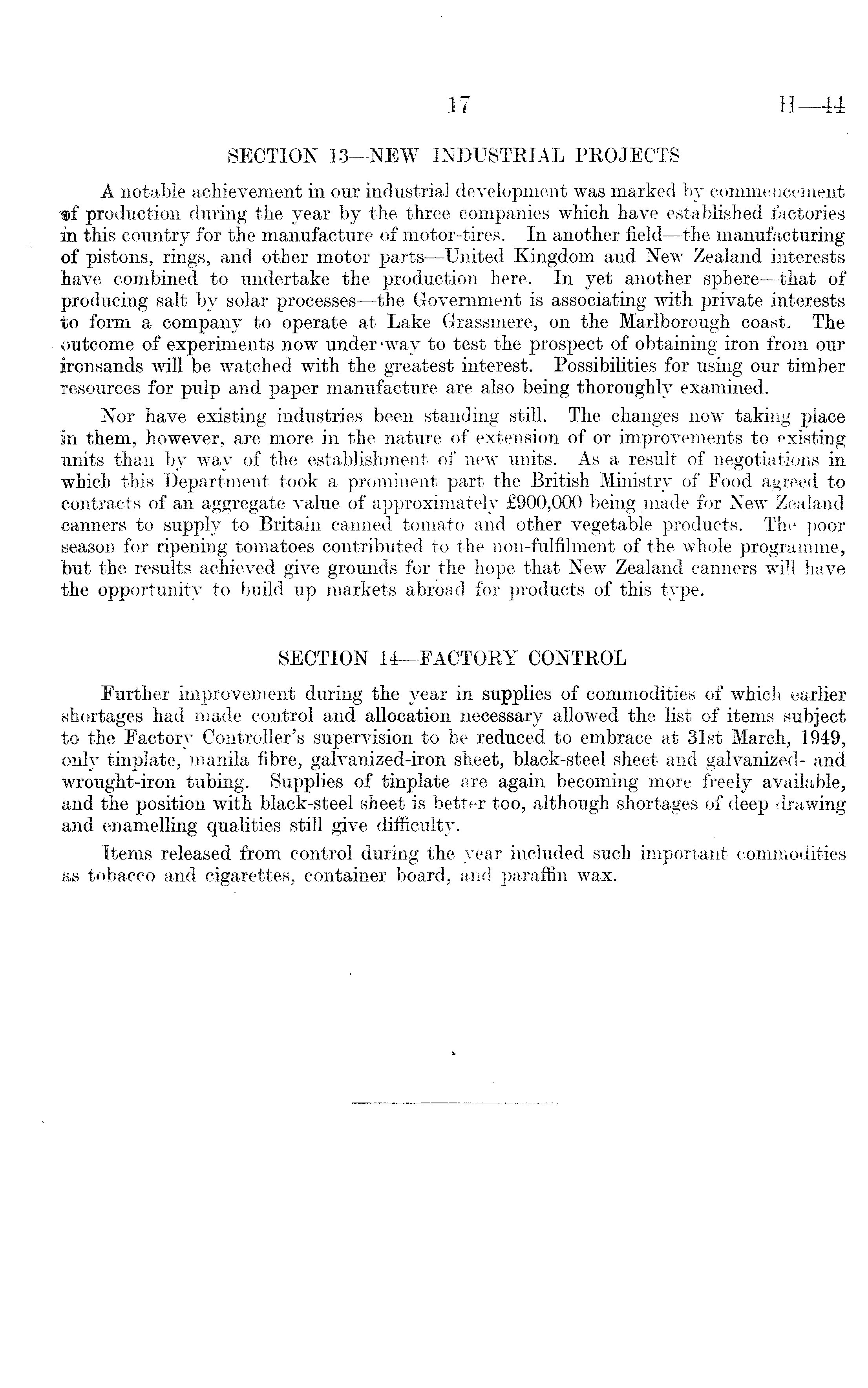 SECTION 13—NEW INDUSTRIAL PROJECTS A notable achievement in our industrial development was marked by commencement ®f production during the year by the three companies which have established factories in this country for the manufacture of motor-tires. In another field —the manufacturing of pistons, rings, and other motor parts —United Kingdom and New Zealand interests have combined, to undertake the production here. In yet another sphere—that of producing salt by solar processes —the Government is associating with private interests to form a company to operate at Lake Grassmere, on the Marlborough coast. The outcome of experiments now under -way to test the prospect of obtaining iron from our ironsands will be watched with the greatest interest. Possibilities for using our timber resources for pulp and paper manufacture are also being thoroughly examined. Nor have existing industries been standing still. The changes now taking place in them, however, are more in the nature of extension of or improvements to existing units than by way of the establishment of new units. As a result of negotiations in which this Department took a prominent part the British Ministry of Food agreed to contracts of an aggregate value of approximately £900,000 being made for New Zealand canners to supply to Britain canned tomato and other vegetable products. Th<> poor season for ripening tomatoes contributed to the non-fulfilment of the whole programme, but the results achieved give grounds for the hope that New Zealand canners will have the opportunity to build up markets abroad for products of this type. SECTION 14—FACTORY CONTROL Further improvement during the year in supplies of commodities of which earlier shortages had made control and allocation necessary allowed the list of items subject to the Factory Controller's supervision to be reduced to embrace at 31st March, 1949, only tinplate, manila fibre, galvanized-iron sheet, black-steel sheet and galvanized- and wrought-iron tubing. Supplies of tinplate are again becoming more freely available, and the position with black-steel sheet is better too, although shortages of deep drawing and enamelling qualities still give difficulty. Items released from control during the year included such important commodities as tobacco and cigarettes, container board, and paraffin wax.