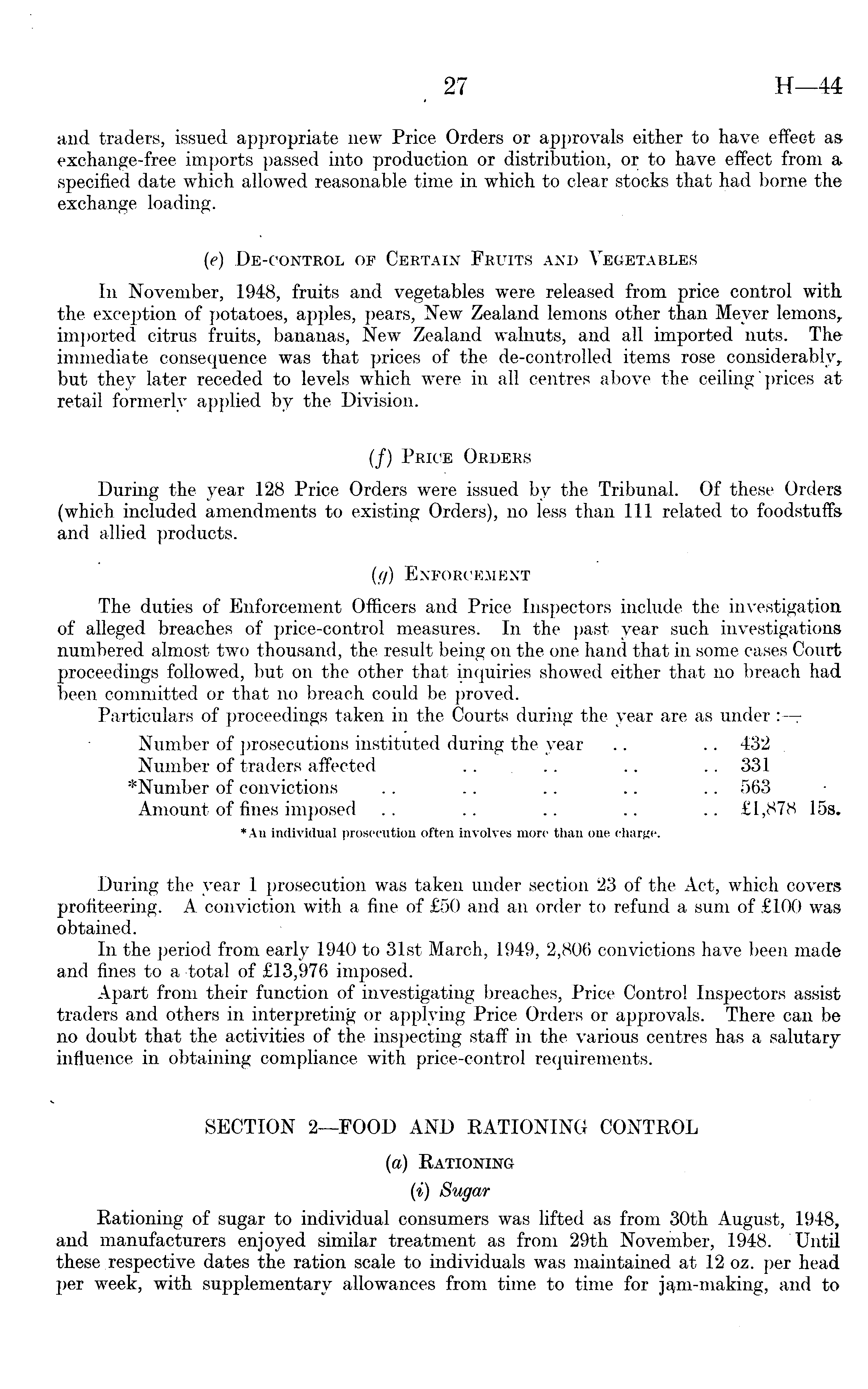 and traders, issued appropriate new Price Orders or approvals either to have effect as-exchange-free imports passed into production or distribution, or to have effect from a specified date which allowed reasonable time in which to clear stocks that had borne the exchange loading. (e) De-control of Certain Fruits and Vegetables In November, 1948, fruits and vegetables were released from price control with the exception of potatoes, apples, pears, New Zealand lemons other than Meyer lemons,, imported citrus fruits, bananas, New Zealand walnuts, and all imported nuts. The immediate consequence was that prices of the de-controlled items rose considerably, but they later receded to levels which were in all centres above the ceiling "prices at retail formerly applied by the Division. (/) Price Orders During the year 128 Price Orders were issued by the Tribunal. Of these Orders (which included amendments to existing Orders), no less than 111 related to foodstuffs and allied products. (g) Enforcement The duties of Enforcement Officers and Price Inspectors include the investigation of alleged breaches of price-control measures. In the past year such investigations numbered almost two thousand, the result being on the one hand that in some cases Court proceedings followed, but on the other that inquiries showed either that no breach had been committed or that no breach could be proved. Particulars of proceedings taken in the Courts during the year are as under :■— Number of prosecutions instituted during the year .. .. 432 Number of traders affected . . ... .. .. 331 * Number of convictions . . .. .. .. .. 563 Amount of fines imposed .. .. .. .. .. £1,878 15s. *Au individual prosecution often involves more than one charge. During the year 1 prosecution was taken under section 23 of the Act, which covers profiteering. A conviction with a fine of £5O and an order to refund a sum of £lOO was obtained. In the period from early 1940 to 31st March, 1949, 2,806 convictions have been made and fines to a total of £13,976 imposed. Apart from their function of investigating breaches, Price Control Inspectors assist traders and others in interpreting or applying Price Orders or approvals. There can be no doubt that the activities of the inspecting staff in the various centres has a salutary influence in obtaining compliance with price-control requirements. SECTION 2—FOOD AND RATIONING CONTROL (a) Rationing (*) Sugar Rationing of sugar to individual consumers was lifted as from 30th August, 1948, and manufacturers enjoyed similar treatment as from 29th November, 1948. Until these respective dates the ration scale to individuals was maintained at 12 oz. per head per week, with supplementary allowances from time to time for ja.m-making, and to