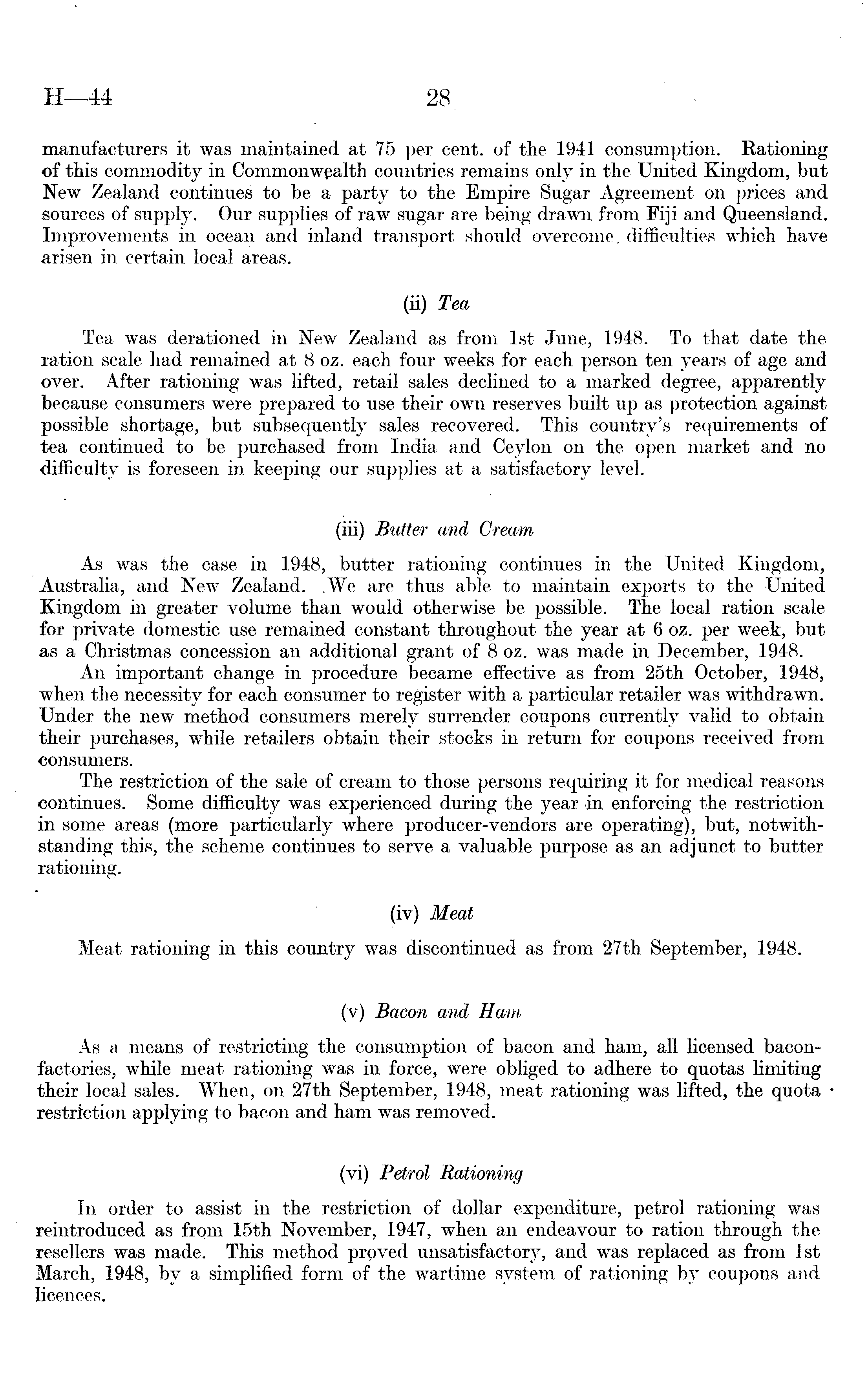 manufacturers it was maintained at 75 per cent, of the 1941 consumption. Eationing of this commodity in Commonwealth countries remains only in the United Kingdom, but New Zealand continues to be a party to the Empire Sugar Agreement on prices and sources of supply. Our supplies of raw sugar are being drawn from Fiji and Queensland. Improvements in ocean and inland transport should overcome, difficulties which have arisen in certain local areas. (ii) Tea Tea was derationed in New Zealand as from Ist June, 1948. To that date the ration scale had remained at 8 oz. each four weeks for each person ten years of age and over. After rationing was lifted, retail sales declined to a marked degree, apparently because consumers were prepared to use their own reserves built up as protection against possible shortage, but subsequently sales recovered. This country's requirements of tea continued to be purchased from India and Ceylon on the open market and no difficulty is foreseen in keeping our supplies at a satisfactory level. (iii) Butter and Cream As was the case in 1948, butter rationing continues in the United Kingdom, Australia, and New Zealand. .We are thus able to maintain exports to the United Kingdom in greater volume than would otherwise be possible. The local ration scale for private domestic use remained constant throughout the year at 6 oz. per week, but as a Christmas concession an additional grant of 8 oz. was made in December, 1948. An important change in procedure became effective as from 25th October, 1948, when the necessity for each consumer to register with a particular retailer was withdrawn. Under the new method consumers merely surrender coupons currently valid to obtain their purchases, while retailers obtain their stocks in return for coupons received from consumers. The restriction of the sale of cream to those persons requiring it for medical reasons continues. Some difficulty was experienced during the year in enforcing the restriction in some areas (more particularly where producer-vendors are operating), but, notwithstanding this, the scheme continues to serve a valuable purpose as an adjunct to butter rationing. (iv) Meat Meat rationing in this country was discontinued as from 27th September, 1948. (v) Bacon and Ham. As a means of restricting the consumption of bacon and ham, all licensed baconfactories, while meat rationing was in force, were obliged to adhere to quotas limiting their local sales. When, on 27th September, 1948, meat rationing was lifted, the quota restriction applying to bacon and ham was removed. (vi) Petrol Rationing In order to assist in the restriction of dollar expenditure, petrol rationing was reintroduced as from 15th November, 1947, when an endeavour to ration through the resellers was made. This method proved unsatisfactory, and was replaced as from Ist March, 1948, by a simplified form of the wartime system of rationing by coupons and licences.