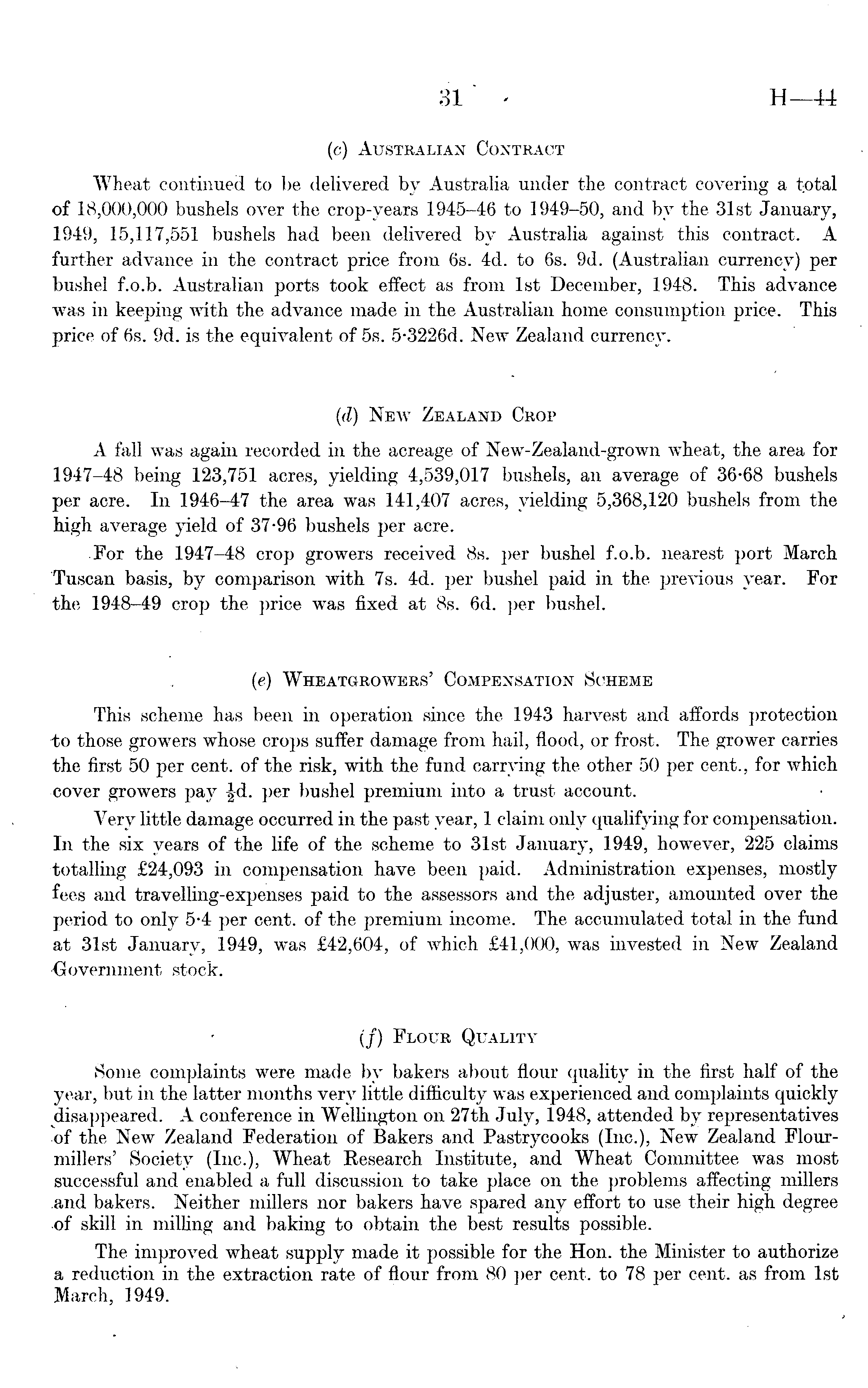 (c) Australian Contract Wheat continued to be delivered by Australia under the contract covering a total of 18,000,000 bushels over the crop-years 1945-46 to 1949-50, and by the 31st January, 1949, 15,117,551 bushels had been delivered by Australia against this contract. A further advance in the contract price from 6s. 4d. to 6s. 9d. (Australian currency) per bushel f.o.b. Australian ports took effect as from Ist December, 1948. This advance was in keeping with the advance made in the Australian home consumption price. This price of 6s. 9d. is the equivalent of ss. 5-3226 d. New Zealand currency. (d) New Zealand Crop A fall was again recorded in the acreage of New-Zealand-grown wheat, the area for 1947-48 being 123,751 acres, yielding 4,539,017 bushels, an average of 36-68 bushels per acre. In 1946-47 the area was 141,407 acres, yielding 5,368,120 bushels from the high average yield of 37-96 bushels per acre. .For the 1947-48 crop growers received Bs. per bushel f.o.b. nearest port March Tuscan basis, by comparison with 7s. 4d. per bushel paid in the previous year. For the 1948-49 crop the price was fixed at Bs. 6d. per bushel. (e) Wheatgrowers' Compensation Scheme This scheme has been in operation since the 1943 harvest and affords protection -to those growers whose crops suffer damage from hail, flood, or frost. The grower carries the first 50 per cent, of the risk, with the fund carrying the other 50 per cent., for which cover growers pay per bushel premium into a trust account. Very little damage occurred in the past year, 1 claim only qualifying for compensation. In the six years of the life of the scheme to 31st January, 1949, however, 225 claims totalling £24,093 in compensation have been paid. Administration expenses, mostly fees and travelling-expenses paid to the assessors and the adjuster, amounted over the period to only 5-4 per cent, of the premium income. The accumulated total in the fund at 31st January, 1949, was £42,604, of which £41,000, was invested in New Zealand 'Government stock. (/) Flour Quality Some complaints were made by bakers about flour quality in the first half of the year, but in the latter months very little difficulty was experienced and complaints quickly disappeared. A conference in Wellington on 27th July, 1948, attended by representatives of the New Zealand Federation of Bakers and Pastrycooks (Inc.), New Zealand Flourmillers' Society (Inc.), Wheat Research Institute, and Wheat Committee was most successful and enabled a full discussion to take place on the problems affecting millers and bakers. Neither millers nor bakers have spared any effort to use their high degree of skill in milling and baking to obtain the best results possible. The improved wheat supply made it possible for the Hon. the Minister to authorize a reduction in the extraction rate of flour from 80 per cent, to 78 per cent, as from Ist March, 1949.