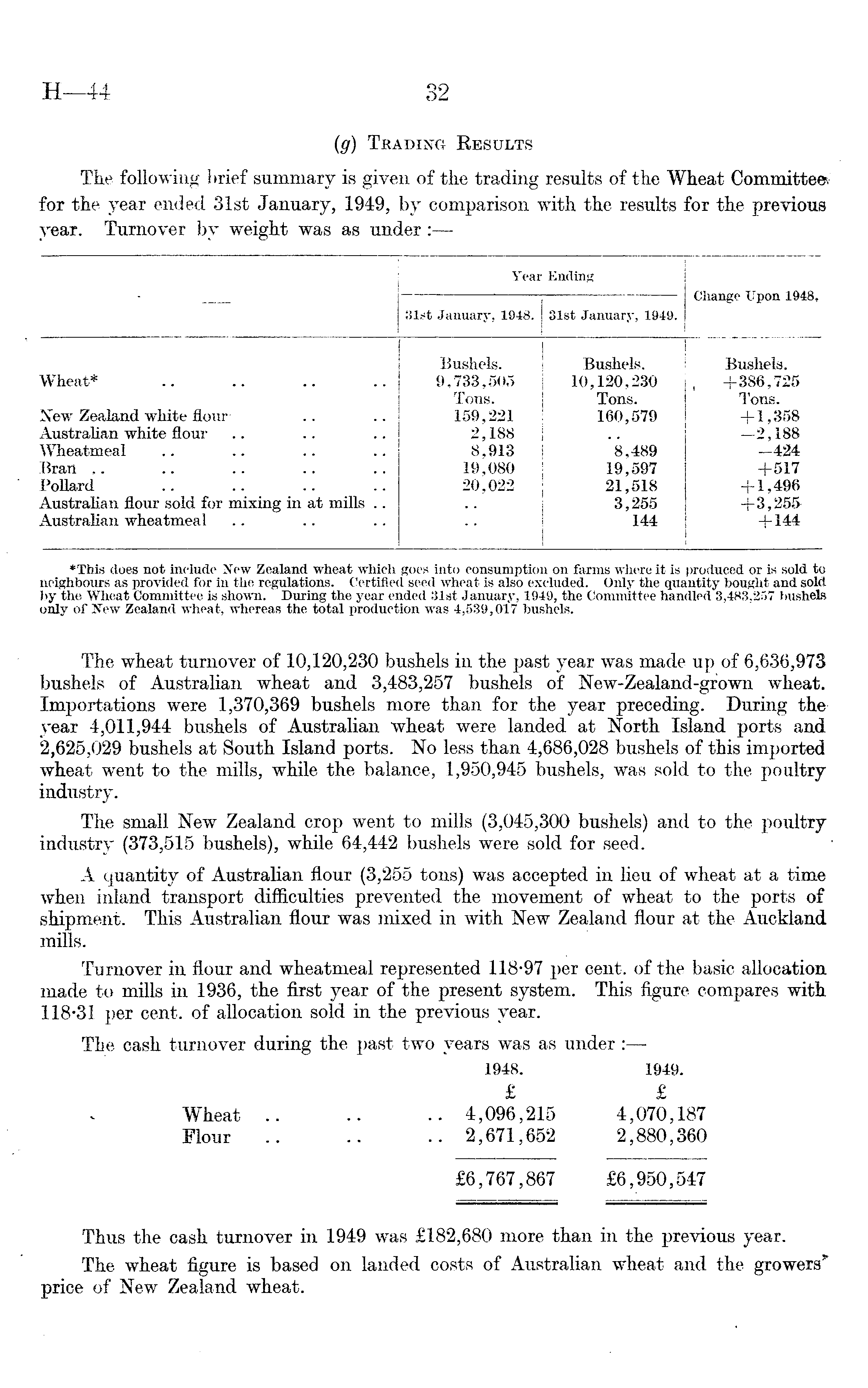 The wheat turnover of 10,120,230 bushels in the past year was made up of 6,636,973 bushels of Australian wheat and 3,483,257 bushels of New-Zealand-grown wheat. Importations were 1,370,369 bushels more than for the year preceding. During the year 4,011,944 bushels of Australian wheat were landed at North Island ports and 2,625,029 bushels at South Island ports. No less than 4,686,028 bushels of this imported wheat went to the mills, while the balance, 1,950,945 bushels, was sold to the poultry industry. The small New Zealand crop went to mills (3,045,300 bushels) and to the poultry industry (373,515 bushels), while 64,442 bushels were sold for seed. A quantity of Australian flour (3,255 tons) was accepted in lieu of wheat at a time when inland transport difficulties prevented the movement of wheat to the ports of shipment. This Australian flour was mixed in with New Zealand flour at the Auckland mills. Turnover in flour and wheatmeal represented 118-97 per cent, of the basic allocation made to mills in 1936, the first year of the present system. This figure compares with. 118-31 per cent, of allocation sold in the previous year. The cash turnover during the past two years was as under : —• 1948. 1949. £ £ Wheat .. .. .. 4,096,215 4,070,187 Flour .. .. .. 2,671,652 2,880,360 £6,767,867 £6,950,547 Thus the cash turnover in 1949 was £182,680 more than in the previous year. The wheat figure is based on landed costs of Australian wheat and the price of New Zealand wheat.