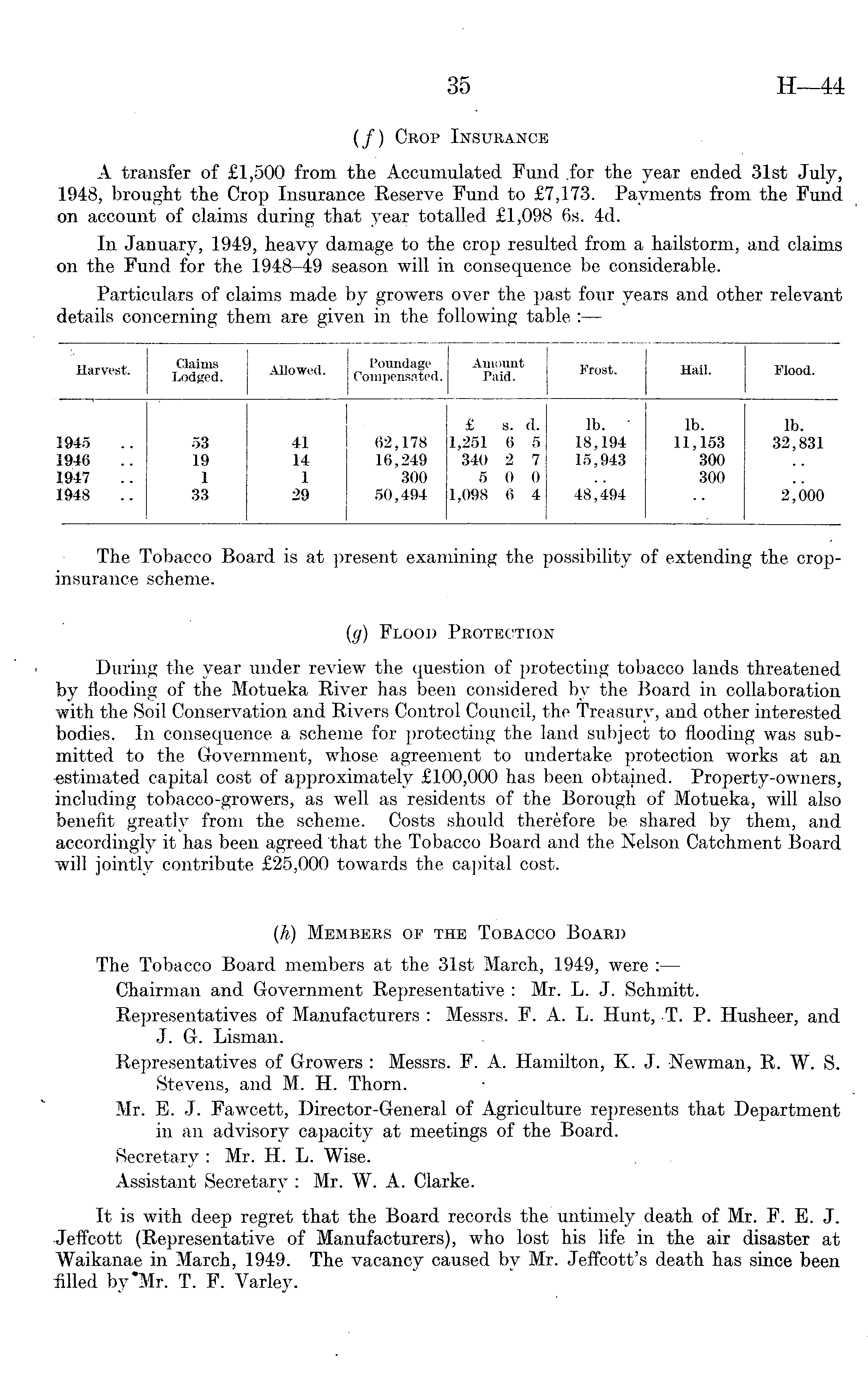 The Tobacco Board is at present examining the possibility of extending the cropinsurance scheme. (g) Flood Protection During the year under review the question of protecting tobacco lands threatened by flooding of the Motueka Kiver has been considered by the Board in collaboration with the Soil Conservation and Rivers Control Council, the Treasury, and other interested bodies. In consequence a scheme for protecting the land subject to flooding was submitted to the Government, whose agreement to undertake protection works at an estimated capital cost of approximately £lOO,OOO has been obtained. Property-owners, including tobacco-growers, as well as residents of the Borough of Motueka, will also benefit greatly from the scheme. Costs should therefore be shared by them, and accordingly it has been agreed that the Tobacco Board and the Nelson Catchment Board will jointly contribute £25,000 towards the capital cost. (h) Members op the Tobacco Board The Tobacco Board members at the 31st March, 1949, were : Chairman and Government Representative : Mr. L. J. Schmitt. Representatives of Manufacturers : Messrs. F. A. L. Hunt, T. P. Husheer, and J. G. Lisman. Representatives of Growers : Messrs. F. A. Hamilton, K. J. Newman, R. W. S. Stevens, and M. H. Thorn. Mr. B. J. Fawcett, Director-General of Agriculture represents that Department in an advisory capacity at meetings of the Board. Secretary : Mr. H. L. Wise. Assistant Secretary : Mr. W. A. Clarke. It is with deep regret that the Board records the untimely death of Mr. F. E. J. Jeffcott (Representative of Manufacturers), who lost his life in the air disaster at Waikanae in March, 1949. The vacancy caused bv Mr. Jeffcott's death has since been filled by' Mr. T. F. Varley.