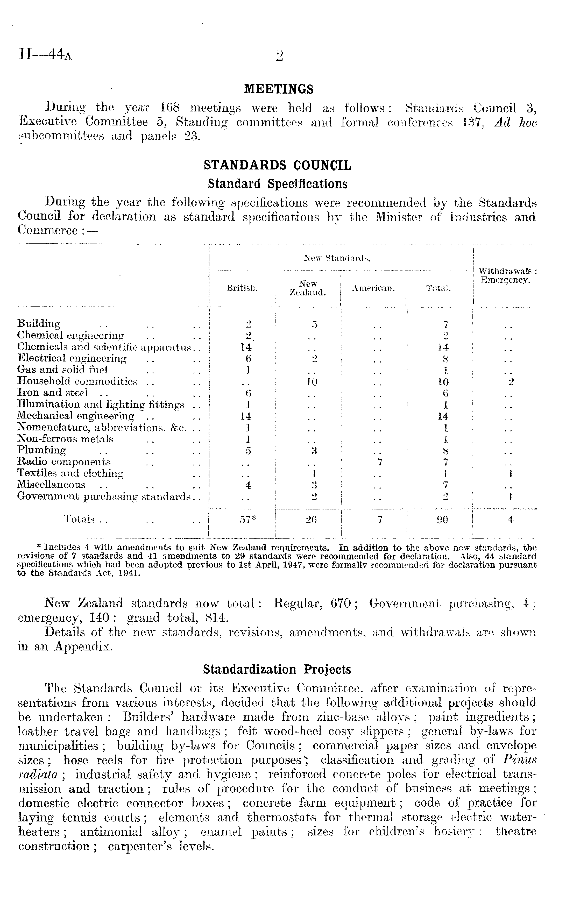 — New Standards. Withdrawals; Emergency. British. New Zealand. American. Total. Building 2 5 1 Chemical engineering 2 .. 2 1 Chemicals and scientific apparatus.. 14 14 j Electrical engineering 6 2 ! 8 Gas and solid fuel 1 1 Household commodities io 10 Iron and steel 6 6 Illumination and lighting fittings .. 1 1 1 Mechanical engineering 14 14 Nomenclature, abbreviations, &c. .. 1 i ; . . Non-ferrous metals 1 1 ! Plumbing 5 3 8 Radio components 7 Textiles and clothing i 1 1 Miscellaneous 4 3 ! 7 Government purchasing standards.. 2 I 2 ! i Totals .. 57* 26 7 90 4