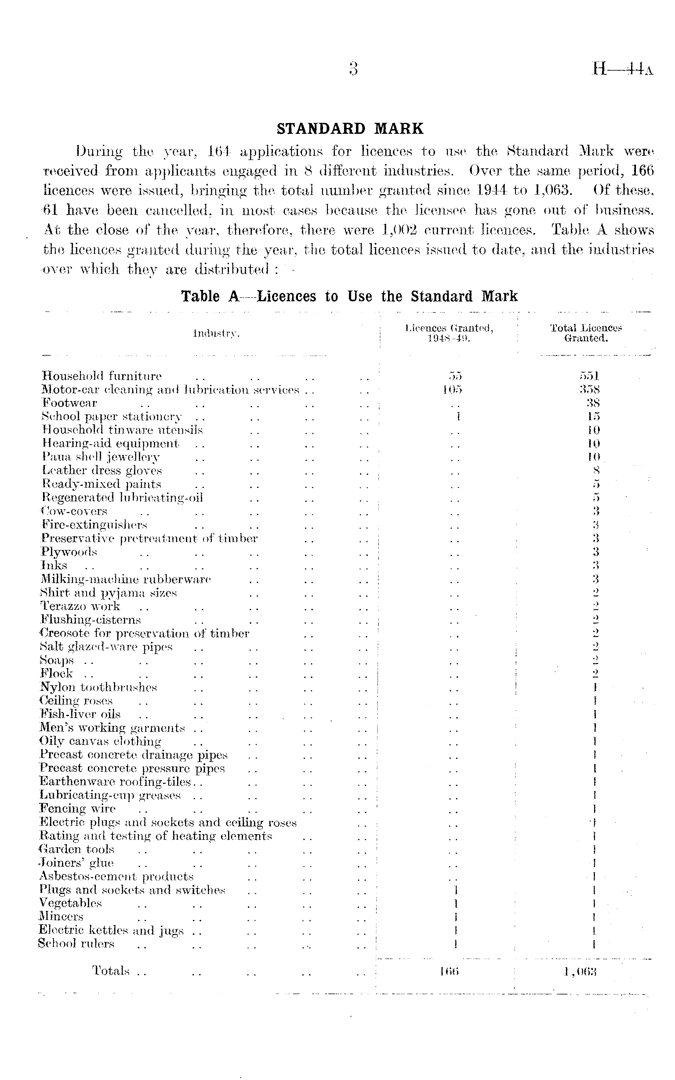 STANDARD MARK During the year, 164 applications for licences to use the Standard Mark were received from applicants engaged in 8 different industries. Over the same period, 166 licences were issued, bringing the total number granted since 1944 to 1,063. Of these, -61 have been cancelled, in most cases because the licensee has gone out of business. At the close of the year, therefore, there were 1,002 current licences. Table A shows the licences granted during the year, the total licences issued to date, and the industries •over which they are distributed :