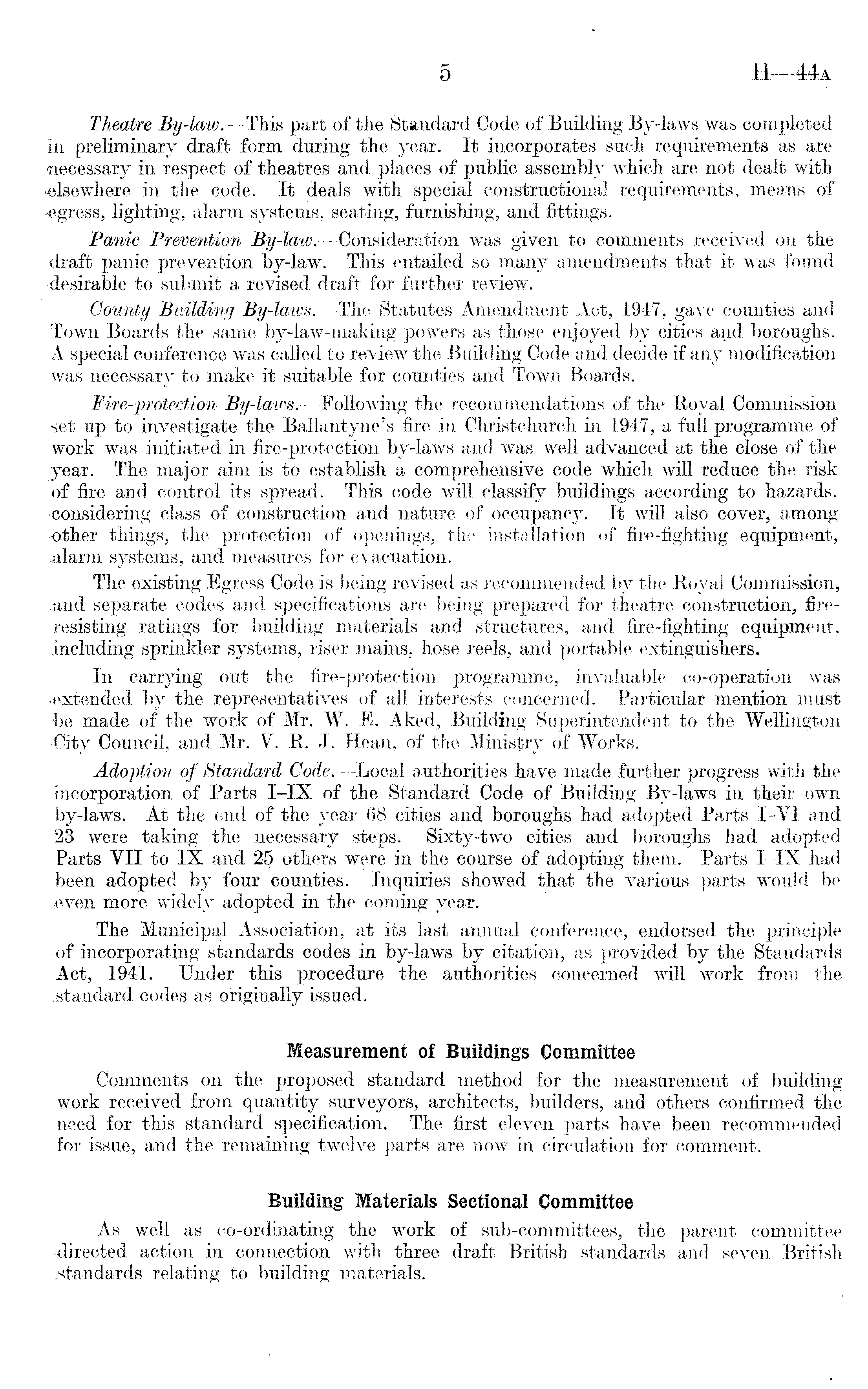 Theatre By-law. —This part of the Standard Code of Building By-laws was completed in preliminary draft form during the year. It incorporates such requirements as are necessary in respect of theatres and places of public assembly which are not dealt with elsewhere in the code. It deals with special constructional requirements, means of •egress, lighting, alarm systems, seating, furnishing, and fittings. Panic Prevention By-law.— Consideration was given to comments received on the draft panic prevention by-law. This entailed so many amendments that it was found desirable to submit a revised draft for further review. County Building By-laws.- -The Statutes Amendment Act, 1947, gave counties and Town Boards the same by-law-making powers as those enjoyed by cities and boroughs. A special conference was called to review the Building Code and decide if any modification was necessary to make it suitable for counties and Town Boards. Fire-protection By-laws— Following the recommendations of the Royal Commission set up to investigate the Ballantyne's fire in Christchurch in 1947, a full programme of work was initiated in fire-protection by-laws and was well advanced at the close of the year. The major aim is to establish a comprehensive code which will reduce the risk of fire and control its spread. This code will classify buildings according to hazards, considering class of construction and nature of occupancy. It will also cover, among other things, the protection of openings, the installation of fire-fighting equipment, alarm systems, and measures for evacuation. The existing Egress Code is being revised as recommended by the Royal Commission, and separate codes and specifications are being prepared for theatre construction, fireresisting ratings for building materials and structures, and fire-fighting equipment, including sprinkler systems, riser mains, hose reels, and portable extinguishers. In carrying out the fire-protection programme, invaluable co-operation was •extended by the representatives of all interests concerned. Particular mention must be made of the work of Mr. W. E. Aked, Building Superintendent to the Wellington City Council, and Mr. V. R. J. Hean, of the Ministry of Works. Adoption of Standard Code. —Local authorities have made further progress with the incorporation of Parts I-IX of the Standard Code of Building By-laws in their own by-laws. At the end of the year 68 cities and boroughs had adopted Parts I-VI and 23 were taking the necessary steps. Sixty-two cities and boroughs had adopted Parts VII to IX and 25 others were in the course of adopting them. Parts I-IX had been adopted by four counties. Inquiries showed that the various parts would be even more widely adopted in the coming year. The Municipal Association, at its last annual conference, endorsed the principle ■of incorporating standards codes in by-laws by citation, as provided by the Standards Act, 1941. Under this procedure the authorities concerned will work from the .standard codes as originally issued. Measurement of Buildings Committee Comments on the proposed standard method for the measurement of building work received from quantity surveyors, architects, builders, and others confirmed the need for this standard specification. The first eleven parts have been recommended for issue, and the remaining twelve parts are now in circulation for comment. Building Materials Sectional Committee As well as co-ordinating the work of sub-committees, the parent committee directed action in connection with three draft British standards and seven British ■ standards relating to building materials.
