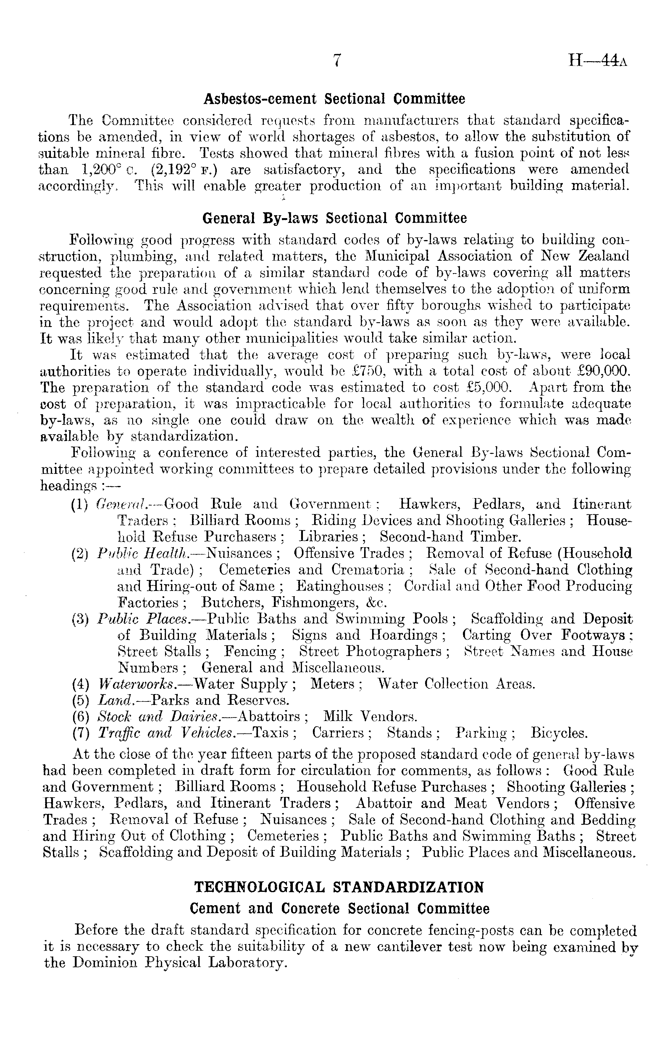 Asbestos-cement Sectional Committee The Committee considered requests from manufacturers that standard specifications be amended, in view of world shortages of asbestos, to allow the substitution of suitable mineral fibre. Tests showed that mineral fibres with a fusion point of not less than 1,200° c. (2,192° f.) are satisfactory, and the specifications were amended accordingly. This will enable greater production of an important building material. General By-laws Sectional Committee Following good progress with standard codes of by-laws relating to building construction, plumbing, and related matters, the Municipal Association of New Zealand requested the preparation of a similar standard code of by-laws covering all matters concerning good rule and government which lend themselves to the adoption of uniform requirements. The Association advised that over fifty boroughs wished to participate in the project and would adopt the standard by-laws as soon as they were available. It was likely that many other municipalities would take similar action. It was estimated that the average cost of preparing such by-laws, were local authorities to operate individually, would be £750, with a total cost of about £90,000. The preparation of the standard code was estimated to cost £5,000. Apart from the cost of preparation, it was impracticable for local authorities to formulate adequate by-laws, as no single one could draw on the wealth of experience which was made available by standardization. Following a conference of interested parties, the General By-laws Sectional Committee appointed working committees to prepare detailed provisions under the following headings:— (1) General. —Good Rule and Government ; Hawkers, Pedlars, and Itinerant Traders ; Billiard Rooms ; Riding Devices and Shooting Galleries ; Household Refuse Purchasers ; Libraries ; Second-hand Timber. (2) Public Health. —Nuisances ; Offensive Trades ; Removal of Refuse (Household and Trade); Cemeteries and Crematoria ; Sale of Second-hand Clothing and Hiring-out of Same ; Eatinghouses ; Cordial and Other Food Producing Factories ; Butchers, Fishmongers, &c. (3) Public Places. —Public Baths and Swimming Pools ; Scaffolding and Deposit of Building Materials ; Signs and Hoardings ; Carting Over Footways; Street Stalls ; Fencing ; Street Photographers ; Street Names and House Numbers ; General and Miscellaneous. (4) Waterworks. —Water Supply ; Meters ; Water Collection Areas. (5) Land.- —Parks and Reserves. (6) Stock and Dairies. —Abattoirs ; Milk Vendors. (7) Traffic and Vehicles. —Taxis ; Carriers ; Stands : Parking ; Bicycles. At the close of the year fifteen parts of the proposed standard code of general by-laws had been completed in draft form for circulation for comments, as follows : Good Rule and Government; Billiard Rooms ; Household Refuse Purchases ; Shooting Galleries ; Hawkers, Pedlars, and Itinerant Traders ; Abattoir and Meat Vendors; Offensive Trades ; Removal of Refuse ; Nuisances ; Sale of Second-hand Clothing and Bedding and Hiring Out of Clothing ; Cemeteries ; Public Baths and Swimming Baths ; Street Stalls ; Scaffolding and Deposit of Building Materials ; Public Places and Miscellaneous. TECHNOLOGICAL STANDARDIZATION Cement and Concrete Sectional Committee Before the draft standard specification for concrete fencing-posts can be completed it is necessary to check the suitability of a new cantilever test now being examined bv the Dominion Physical Laboratory.
