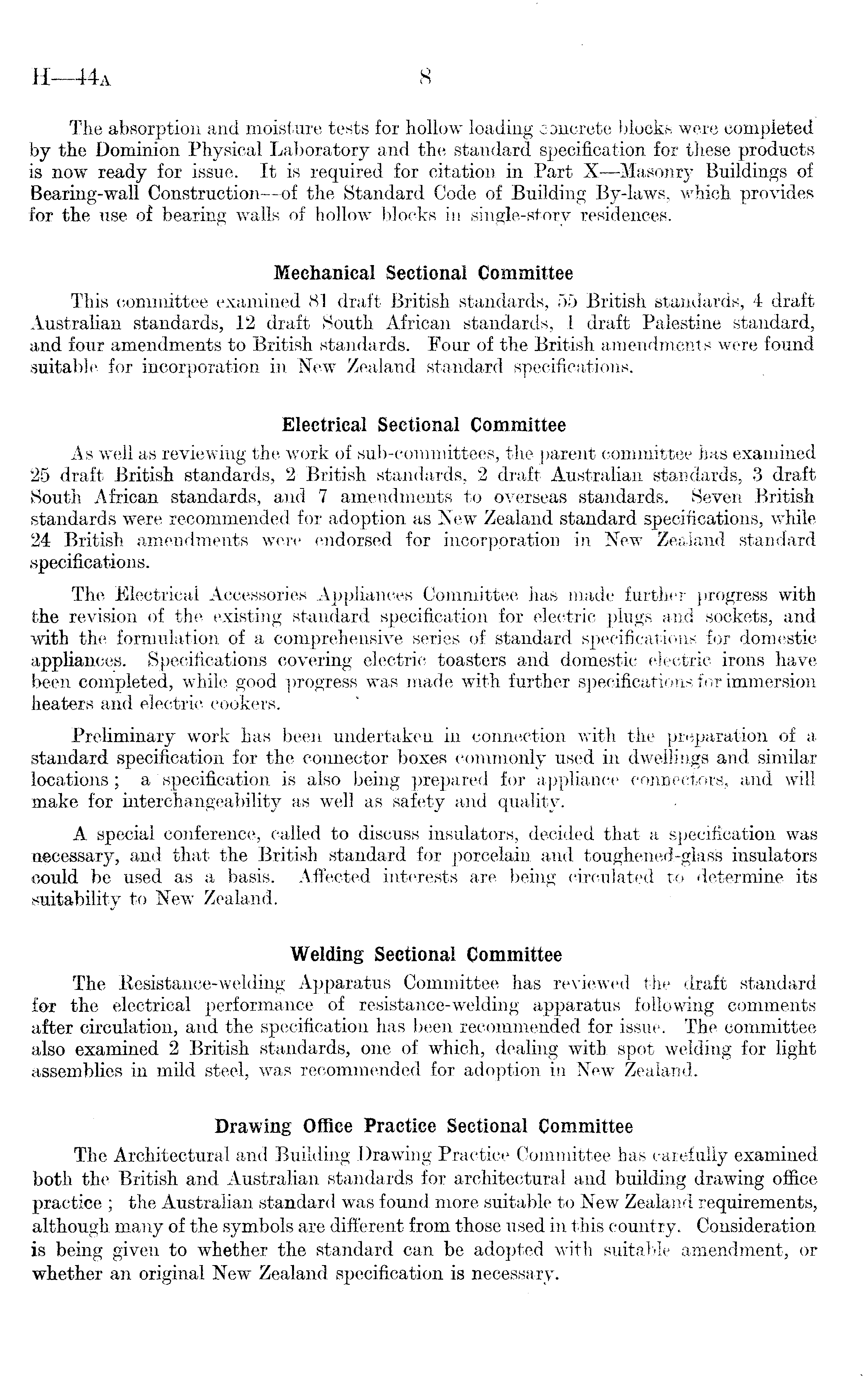 The absorption and moisture tests for hollow loading concrete blocks were completed by the Dominion Physical Laboratory and the standard specification for these products is now ready for issue. It is required for citation in Part X—Masonry Buildings of Bearing-wall Construction —of the Standard Code of Building By-laws, which provides for the use of bearing walls of hollow blocks in single-story residences. Mechanical Sectional Committee This committee examined 81 draft British standards, 55 British standards, 4 draft Australian standards, 12 draft South African standards, 1 draft Palestine standard, and four amendments to British standards. Four of the British amendments were found suitable for incorporation in New Zealand standard specifications. Electrical Sectional Committee As well as reviewing the work of sub-committees, the parent committee has examined 25 draft British standards, 2 British standards, 2 draft Australian standards, 3 draft South African standards, and 7 amendments to overseas standards. Seven British standards were recommended for adoption as New Zealand standard specifications, while 24 British amendments were 1 endorsed for incorporation in New Zealand standard specifications. The Electrical Accessories Appliances Committee has made further progress with the revision of the existing standard specification for electric plugs and sockets, and with the formulation of a comprehensive series of standard specifications for domestic appliances. Specifications covering electric toasters and domestic electric irons have been completed, while good progress was made with further specifications for immersion heaters and electric cookers. Prehminary work has been undertaken in connection with the preparation of a standard specification for the connector boxes commonly used in dwellings and similar locations ; a specification is also being prepared for appliance connectors, and will make for interchangeability as well as safety and quality. A special conference, called to discuss insulators, decided that a specification was necessary, and that the British standard for porcelain and toughened-glass insulators could be used as a basis. Affected interests are being circulated to determine its suitability to New Zealand. Welding Sectional Committee The Resistance-welding Apparatus Committee has reviewed the draft standard for the electrical performance of resistance-welding apparatus following comments after circulation, and the specification has been recommended for issue. The committee also examined 2 British standards, one of which, dealing with spot welding for light assemblies in mild steel, was recommended for adoption in New Zealand. Drawing Office Practice Sectional Committee The Architectural and Building Drawing Practice Committee has carefully examined both the British and Australian standards for architectural and building drawing office practice ; the Australian standard was found more suitable to New Zealand requirements, although many of the symbols are different from those used in this country. Consideration is being given to whether the standard can be adopted with suitable amendment, or whether an original New Zealand specification is necessary.