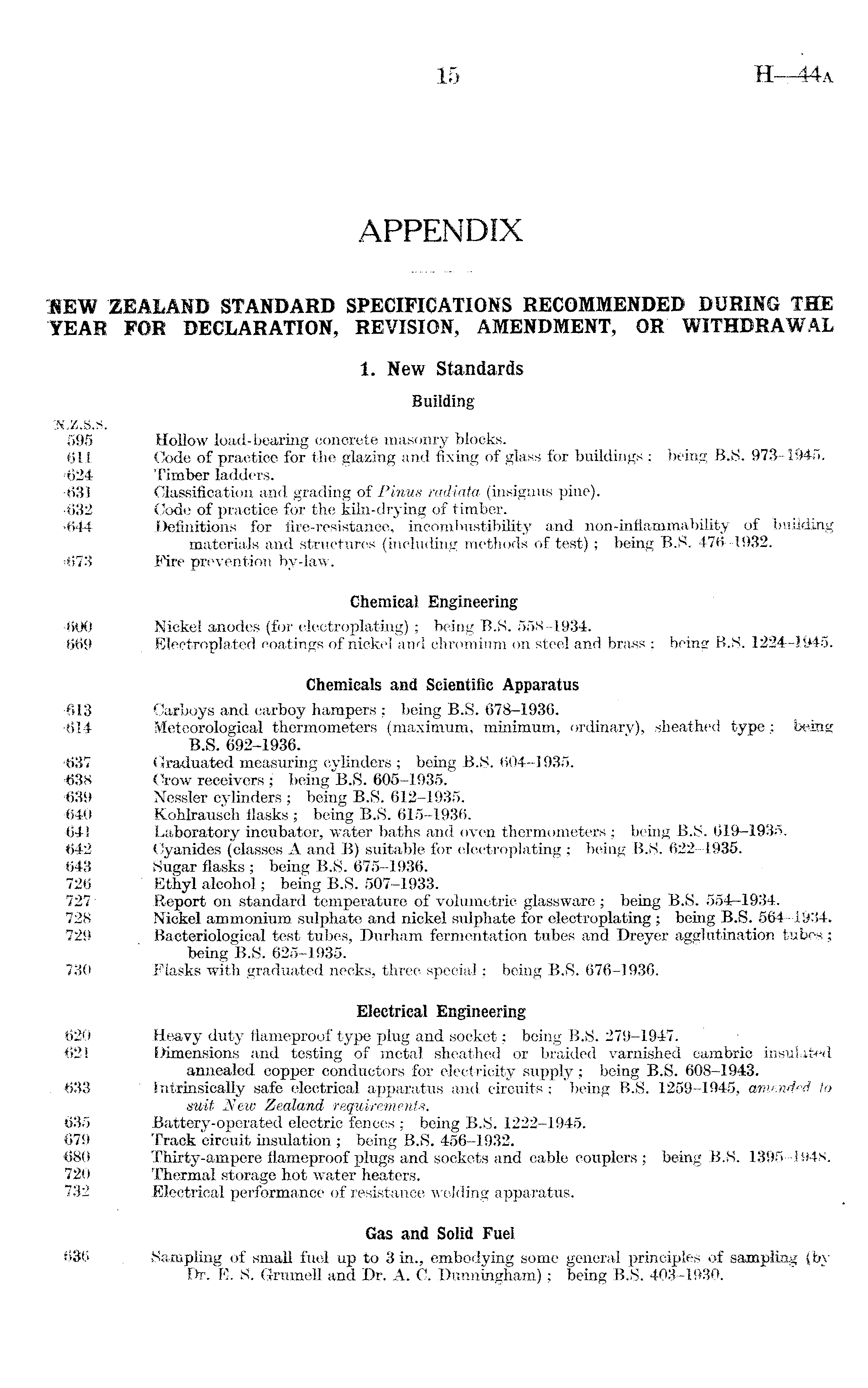 HEW ZEALAND STANDARD SPECIFICATIONS RECOMMENDED DURING THE YEAR FOR DECLARATION, REVISION, AMENDMENT, OR WITHDRAWAL 1. New Standards Building at.z.s.s. 595 Hollow load-bearing concrete masonry blocks. 611 Code of practice for the glazing and fixing of glass for buildings ; being B.S. 973-1945. •624 Timber ladders. 631 Classification and grading of Pinus radiata (insignus pine). •632 Code of practice for the kiln-drying of timber. '644 Definitions for fire-resistance, incombustibility and non-inflammability of building materials and structures (including methods of test) ; being B.S. 476-1932. =673 Fire prevention by-law. Chemical Engineering •600 Nickel anodes (for electroplating) ; being B.S. 558-1934. 669 Electroplated coatings of nickel and chromium on steel and brass ; being B.S. 1224-1945. Chemicals and Scientific Apparatus •613 Carboys and carboy hampers ; being B.S. 678-1936. -614 Meteorological thermometers (maximum, minimum, ordinary), sheathed type; being B.S. 692-1936. ■637 Graduated measuring cylinders ; being B.S. 604-1935. 638 Crow receivers ; being B.S. 605-1935. '639 Nessler cylinders ; being B.S. 612-1935. •640 Kohlrausch flasks ; being B.S. 615-1936. 641 Laboratory incubator, water baths and oven thermometers ; being B.S. 619—1935. 642 Cyanides (classes A and B) suitable for electroplating ; being B.S. 622-1935. 643 Sugar flasks ; being B.S. 675-1936. 726 Ethyl alcohol; being B.S. 507-1933. 727 ■ Report on standard temperature of volumetric glassware ; being B.S. 554-1934. 728 Nickel ammonium sulphate and nickel sulphate for electroplating ; being B.S. 564-1934. 729 Bacteriological test tubes, Durham fermentation tubes and Dreyer agglutination tubes; being B.S. 625-1935. 730 Flasks with graduated necks, three special; being B.S. 676-1936. Electrical Engineering 620 Heavy duty flameproof type plug and socket: being B.S. 279-1947. 621 Dimensions and testing of metal sheathed or braided varnished cambric insulated annealed copper conductors for electricity supply; being B.S. 608-1943. . 633 Intrinsically safe electrical apparatus and circuits ; being B.S. 1259-1945, amended to suit New Zealand 'requirements. 635 Battery-operated electric fences ; being B.S. 1222-1945. 679 Track circuit insulation ; being B.S. 456-1932. 680 Thirty-ampere flameproof plugs and sockets and cable couplers ; being B.S. 1395-1948. 720 Thermal storage hot water heaters. 732 Electrical performance of resistance welding apparatus. Gas and Solid Fuel 636 Sampling of small fuel up to 3 in., embodying some general principles of sampling (bv Dr. E. S. Grumell and Dr. A. C. Dunningham); being B.S. 403-1930.