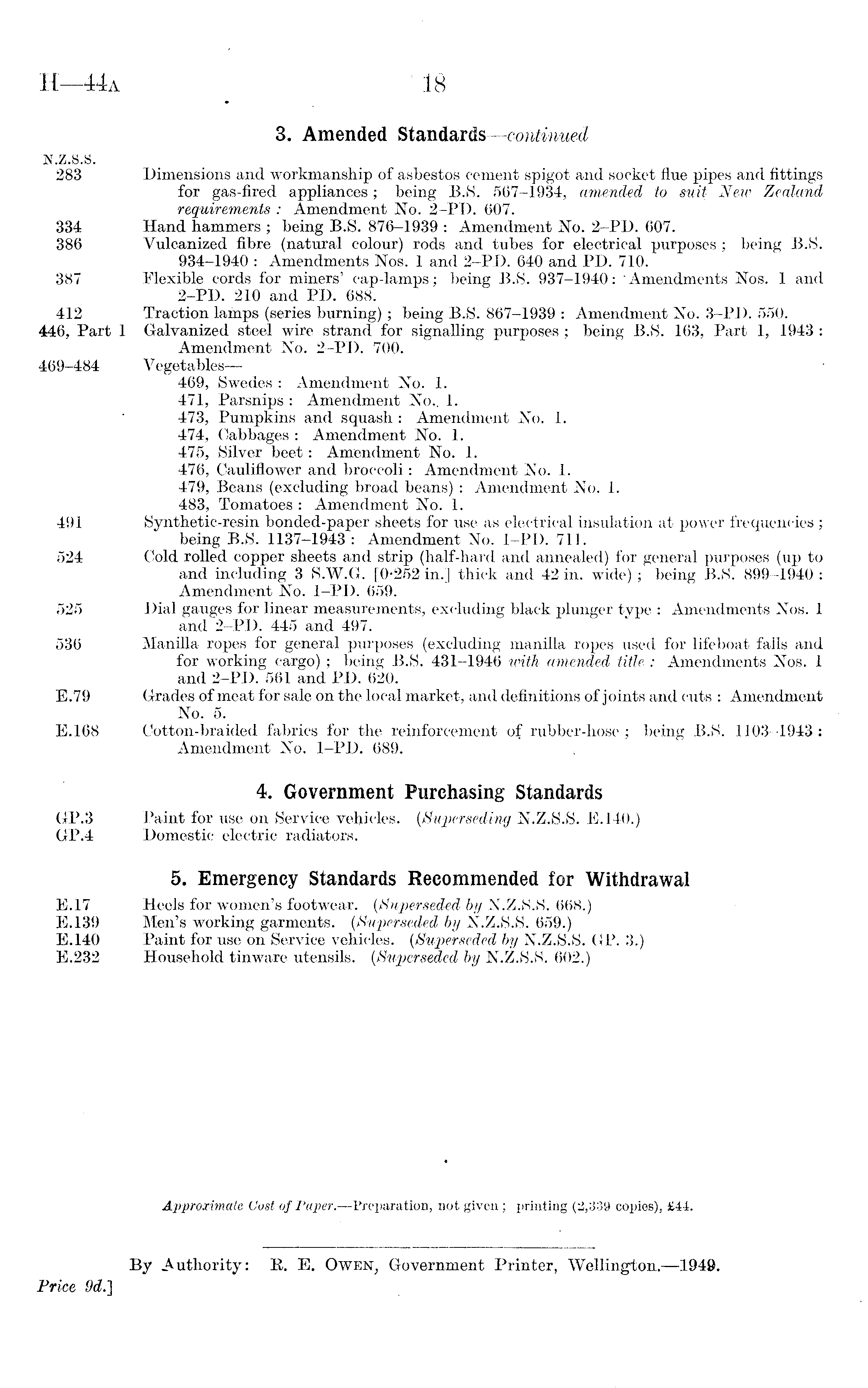 3. Amended Standards — continued N.Z.S.S. 283 Dimensions and workmanship of asbestos cement spigot and socket flue pipes and fittings for gas-fired appliances; being B.S. 567-1934, amended to suit New Zealand requirements : Amendment No. 2-PD. 607. 334 Hand hammers ; being B.S. 876-1939 : Amendment No. 2-PD. 607. 386 Vulcanized fibre (natural colour) rods and tubes for electrical purposes ; being B.S. 934-1940 : Amendments Nos. 1 and 2-PD. 640 and PD. 710. 387 Flexible cords for miners' cap-lamps; being B.S. 937-1940: Amendments Nos. 1 and 2-PD. 210 and PD. 688. 412 Traction lamps (series burning) ; being B.S. 867-1939 : Amendment No. 3-PI). 550. 446, Part 1 Galvanized steel wire strand for signalling purposes ; being B.S. 163, Part 1, 1943 : Amendment No. 2-PD. 700. 469-484 Vegetables—--469, Swedes : Amendment No. 1. 471, Parsnips : Amendment No.. 1. 473, Pumpkins and squash : Amendment No. 1. 474, Cabbages : Amendment No. 1. 475, Silver beet: Amendment No. 1. 476, Cauliflower and broccoli: Amendment No. 1. 479, Beans (excluding broad beans) : Amendment No. 1. 483, Tomatoes : Amendment No. 1. 491 Synthetic-resin bonded-paper sheets for use as electrical insulation at power frequencies ; being B.S. 1137-1943 : Amendment No. 1-PD. 711. 524 Cold rolled copper sheets and strip (half-hard and annealed) for general purposes (up to and including 3 S.W.G. [O-252 in.] thick and 42 in. wide) ; being B.S. 899-1940 : Amendment No. 1-PD. 659. 525 Dial gauges for linear measurements, excluding black plunger type : Amendments Nos. 1 and 2-PD. 445 and 497. 536 Manilla ropes for general purposes (excluding manilla ropes used for lifeboat falls and for working cargo) ; being B.S. 431-1946 with amended title : Amendments Nos. 1 and 2-PD. 561 and PD. 620. 8.79 Grades of meat for sale on the local market, and definitions of joints and cuts : Amendment No. 5. E. 168 Cotton-braided fabrics for the reinforcement of rubber-hose; being B.S. 1103-1943: Amendment No. 1-PD. 689. 4. Government Purchasing Standards GP.3 Paint for use on Service vehicles. (Superseding N.Z.S.S. E. 140.) GP.4 Domestic electric radiators. 5. Emergency Standards Recommended for Withdrawal E. 17 Heels for Avomen's footwear. (Superseded by N.Z.S.S. 668.) E. 139 Men's working garments. (Superseded by N.Z.S.S. 659.) E. 140 Paint for use on Service vehicles. (Superseded by N.Z.S.S. GP. 3.) E. 232 Household tinware utensils. (Superseded by N.Z.S.S. 602.)