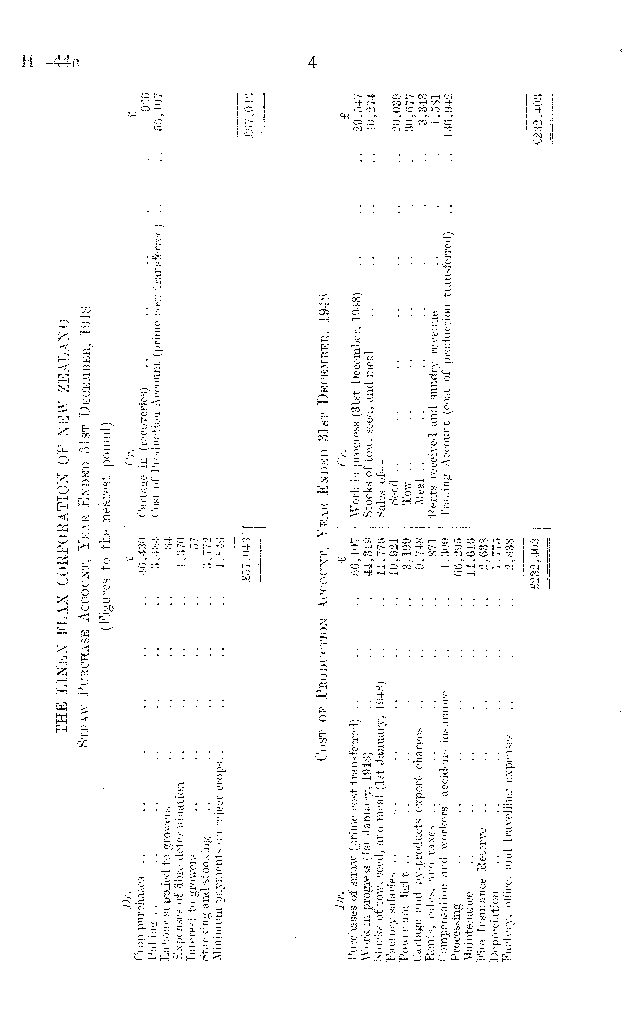 THE LINEN FLAX CORPORATION OF NEW ZEALAND Straw Purchase Account, Year Ended 31st December, 1948 (Figures to the nearest pound) Dr - £ Or, £ Crop purchases .. . . .. , . . . ~ 46,430 Cartage in (recoveries) .. .. .. .. .. 936 Pulling .. .. .. .. .. ~ .. 3,484 Cost of Production Account (prime cost transferred) .. , . 56 107 Labour supplied to growers .. .. ~ .. 84 Expenses of fibre determination .. , . .. . . 1,370 Interest to growers .. . . . , . . .. 57 Stacking and stooking ~ .. .. . . , . 3, 772 Minimum payments on reject crops.. .. .. .. I' 846 £57,043 Cost op Production Account,. Year Ended 31st December, 1948 Dr. £ Or. £ Purchases of straw (prime cost transferred) .. 56,107 Work in progress (31st December, 1948) .. 99 547 Work in progress (Ist January, 1948) ... . .. 44,319 Stocks of tow, seed, and meal .... .. '' 10'274 Stocks of tow, seed, and meal (Ist January, 1948) . . . . 11,776 Sales of— Factory salaries .. ... .. .. .. .. 10,921 Seed.. .. .. .. . 20 039 Power and light .. .. .. .. .. .. 3,199 Tow .. .. .. .. .. '' ' 30'677 Cartage and by-products export charges .. . . ... 9,748 Meal .. .. .. . . .. . . .. 3' 343 Rents, rates, and taxes .. .. .. .. .. 871 'Rents received and sundry revenue ... .. I^sBl Compensation and workers' accident insurance .. .. 1,300 Trading Account (cost of production transferred) . 136'942 Processing .. .. .. .. .. .. 66,295 Maintenance .. .. .. .. .. .. 14,616 Fire Insurance Reserve .. .. .. ~ .. 2,638 Depreciation .. .. .. ~ .. 7,775 Factory, office, and travelling expenses .. .. .. 2,838 | £232,403 I , £232,403