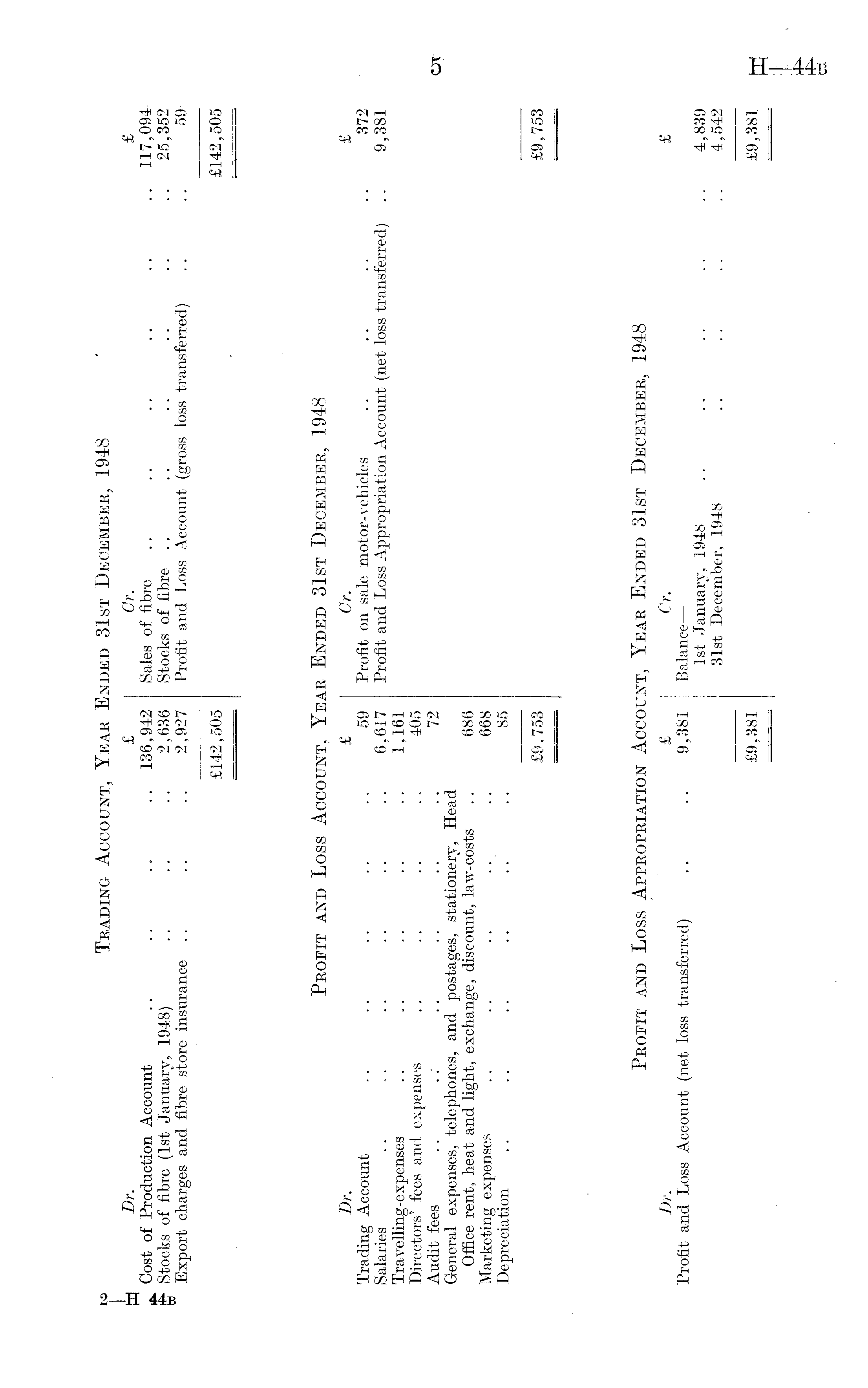 Trading Account, Year Ended 31st December, 1948 Dr. £ Or. £ Cost of Production Account .. .. .. .. 136,942 Sales of fibre .. .. .. .. .. .. 117,094 Stocks of fibre (Ist January, 1948) .. .. .. 2,636 Stocks of fibre .. .. .. .. .. .. 25,352 Export charges and fibre store insurance .. .. .. 2,927 Profit and Loss Account (gross loss transferred) . . .. 59' £142,505 £142,505 Profit and Loss Account, Year Ended 31st December, 1948 Dr. £ Or. £ Trading Account .. .. .. .. . . 59 Profit on sale motor-vehicles .. .. .. .. 372 Salaries .. .. .. .. .. .. 6,617 Profit and Loss Appropriation Account (net loss transferred) 9,381 Travelhng-expenses .. .. .. .. .. 1,161 Directors' fees and expenses .. .. ... .. 405 Audit fees .. .: .. .. .. .. 72 General expenses, telephones, and postages, stationery, Head Office rent, heat and light, exchange, discount, law-costs .. 686 Marketing expenses .. .. .. .. .. 668 Depreciation .. .. .. .. .. .. 85 £9,753 £9,753 Profit and Loss Appropriation Account, Year Ended 31st December, 1948 Dr. £ Or. £ Profit and Loss Account (net loss transferred) .. .. 9,381 Balance— Ist January, 1948 .. .. .. .. .. 4,839 31st December, 1948 " .. .. .. .. 4,542 £9,381 £9,381
