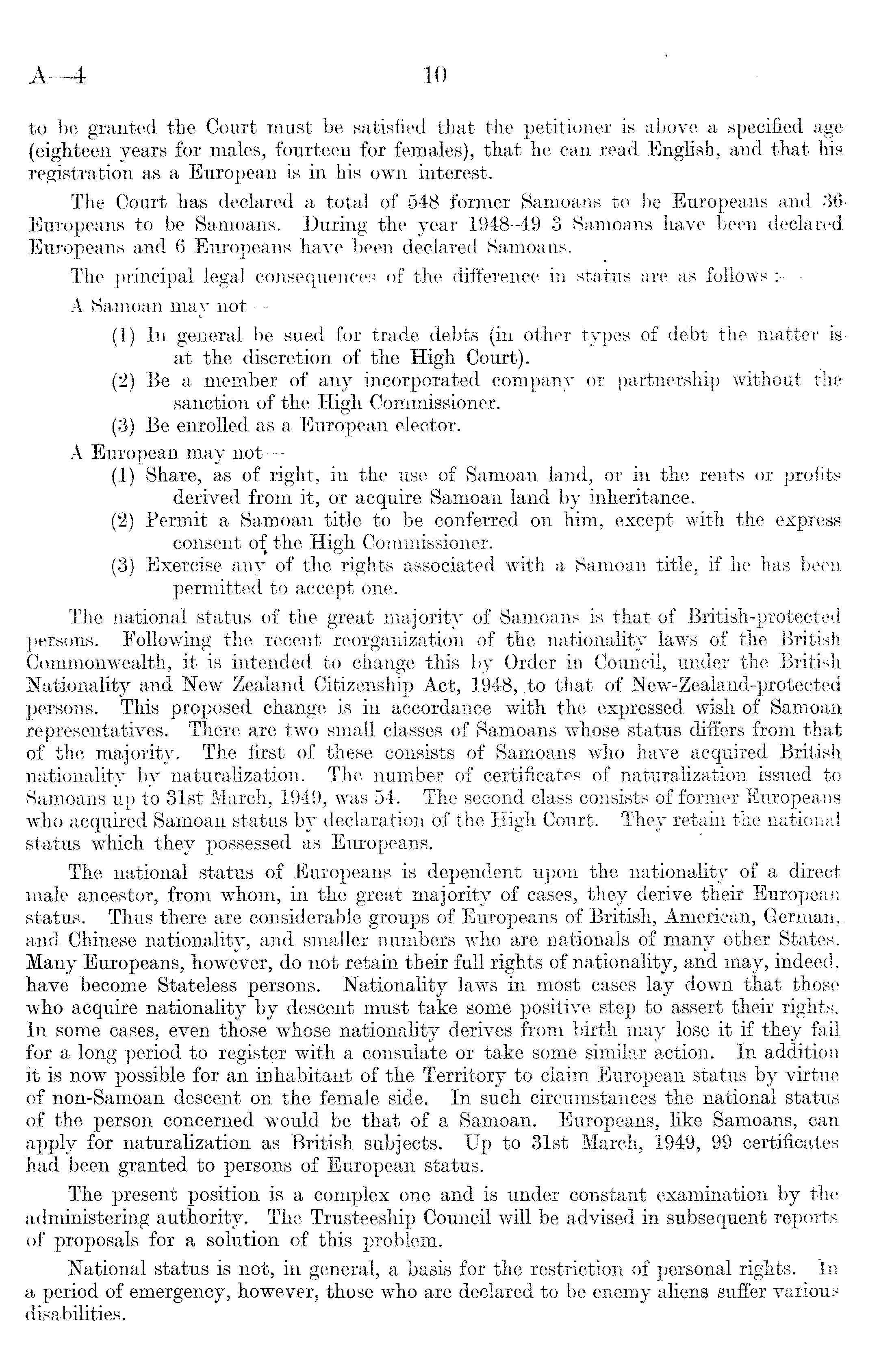 to be granted tlie Court must be satisfied that the petitioner is above a specified age(eighteen years for males, fourteen for females), that he can read English, and that his registration as a European is in his own interest. The Court has declared a total of 548 former Samoans to be Europeans and 36Europeans to be Samoans. During the year 1948-49 3 Samoans have been declared Europeans and 6 Europeans have been declared Samoans. The principal legal consequences of the difference in status are as follows : A Samoan may not — (1) In general be sued for trade debts (in other types of debt the matter is at the discretion of the High Court). (2) Be a member of any incorporated company or partnership without the sanction of the High Commissioner. (3) Be enrolled as a European elector. A European may not — (1) Share, as of right, in the use of Samoan land, or in the rents or profits derived from it, or acquire Samoan land by inheritance. (2) Permit a Samoan title to be conferred on him, except with the express consent of the High Commissioner. (3) Exercise any of the rights associated with a Samoan title, if he has been permitted to accept one. The national status of the great majority of Samoans is that of British-protected persons. Following the recent reorganization of the nationality laws of the British Commonwealth, it is intended to change this by Order in Council, under the British Nationality and New Zealand Citizenship Act, 1948, .to that of New-Zealand-protected persons. This proposed change is in accordance with the expressed wish of Samoan representatives. There are two small classes of Samoans whose status differs from that of the majority. The first of these consists of Samoans who have acquired British nationality by naturalization. The number of certificates of naturalization issued to Samoans up to 31st March, 1949, was 54. The second class consists of former Europeans who acquired Samoan status by declaration of the High Court. They retain the national status which they possessed as Europeans. The national status of Europeans is dependent upon the nationality of a direct male ancestor, from whom, in the great majority of cases, they derive their European status. Thus there are considerable groups of Europeans of British, American, German,, and Chinese nationality, and smaller numbers who are nationals of many other States. Many Europeans, however, do not retain their full rights of nationality, and may, indeed, have become Stateless persons. Nationality laws in most cases lay down that those who acquire nationality by descent must take some positive step to assert their rights.. In some cases, even those whose nationality derives from birth may lose it if they fail for a long period to register with a consulate or take some similar action. In addition it is now possible for an inhabitant of the Territory to claim European status by virtue of non-Samoan descent on the female side. In such circumstances the national status of the person concerned would be that of a Samoan. Europeans, like Samoans, can apply for naturalization as British subjects. Up to 31st March, 1949, 99 certificates had been granted to persons of European status. The present position is a complex one and is under constant examination by the administering authority. The Trusteeship Council will be advised in subsequent reports of proposals for a solution of this problem. National status is not, in general, a basis for the restriction of personal rights. In a period of emergency, however 5 those who are declared to be enemy aliens suffer various ; disabilities.