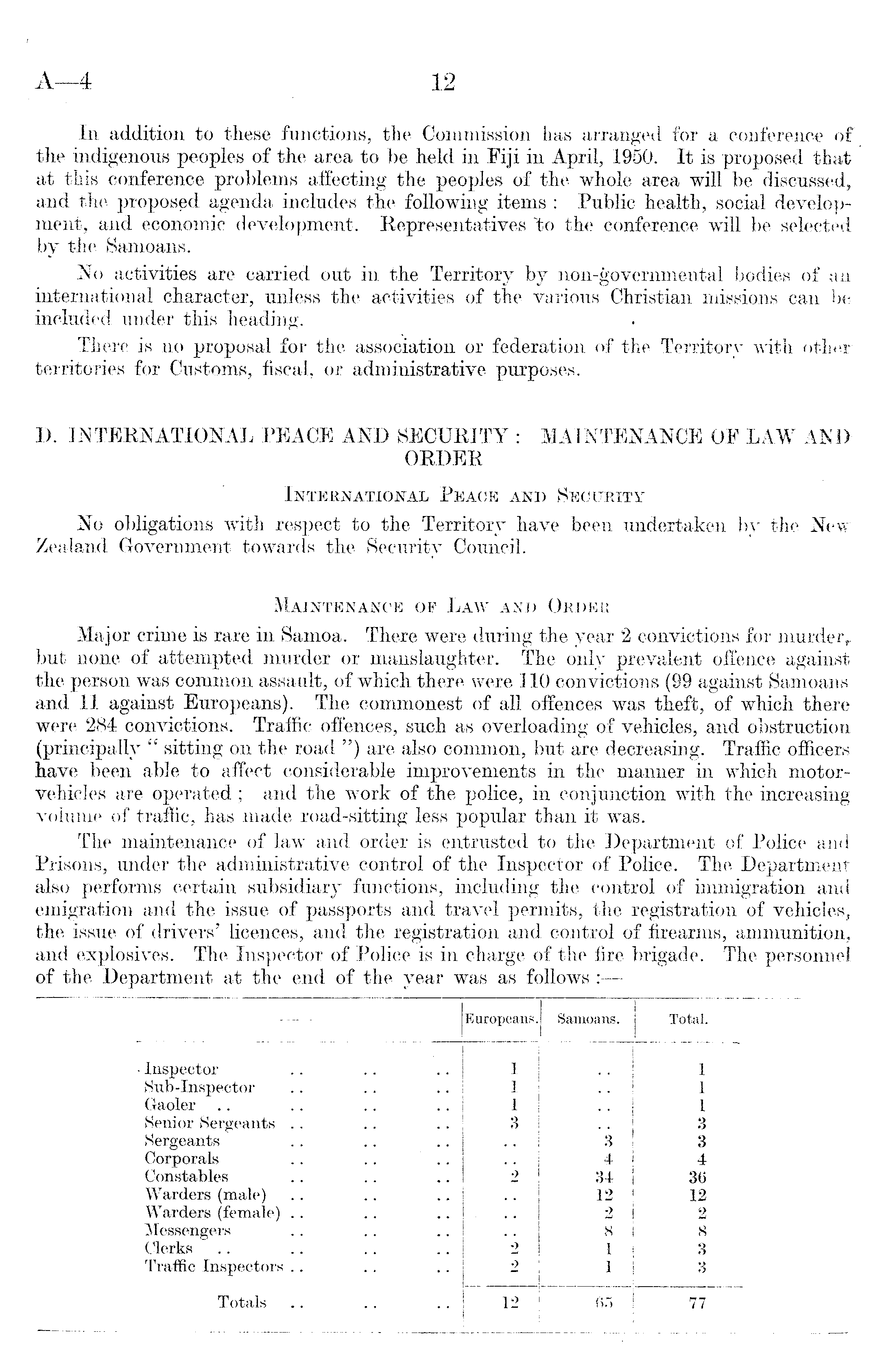 In addition to these functions, the Commission has arranged for a conference of the indigenous peoples of the area to be held in Fiji in April, 1950. It is proposed that at this conference problems affecting the peoples of the whole area will be discussed, and the proposed agenda includes the following items : Public health, social development, and economic development. Representatives to the conference will be selected by the Samoans. No activities are carried out in the Territory by non-governmental bodies of an international character, unless the activities of the various Christian missions can be included under this heading. There is no proposal for the association or federation of the Territory with other territories for Customs, fiscal, or administrative purposes. D. INTERNATIONAL PEACE AND SECURITY : MAINTENANCE OE LAW AND ORDER International Peace and Security No obligations with respect to the Territory have been undertaken by the New Zealand Government towards the Security Council. Maintenance of Law and Order Major crime is rare in Samoa. There were during the year 2 convictions formmurderr r but none of attempted murder or manslaughter. The only prevalent offence against the person was common assault, of which there were 110 convictions (99 against Samoans and 11 against Europeans). The commonest of all offences was theft, of which there were 284 convictions. Traffic offences, such as overloading of vehicles, and obstruction (principally " sitting on the road ") are also common, but are decreasing. Traffic officers have been able to affect considerable improvements in the manner in which motorvehicles are operated ; and the work of the police, in conjunction with the increasing volume of traffic, has made road-sitting less popular than it was. The maintenance of law and order is entrusted to the Department of Police and Prisons, under the administrative control of the Inspector of Police. The Department also performs certain subsidiary functions, including the control of immigration and emigration and the issue of passports and travel permits, the registration of vehicles, the issue of drivers' licences, and the registration and control of firearms, ammunition, and explosives. The Inspector of Police is in charge of the fire brigade. The personnel of the Department at the end of the year was as follows;
