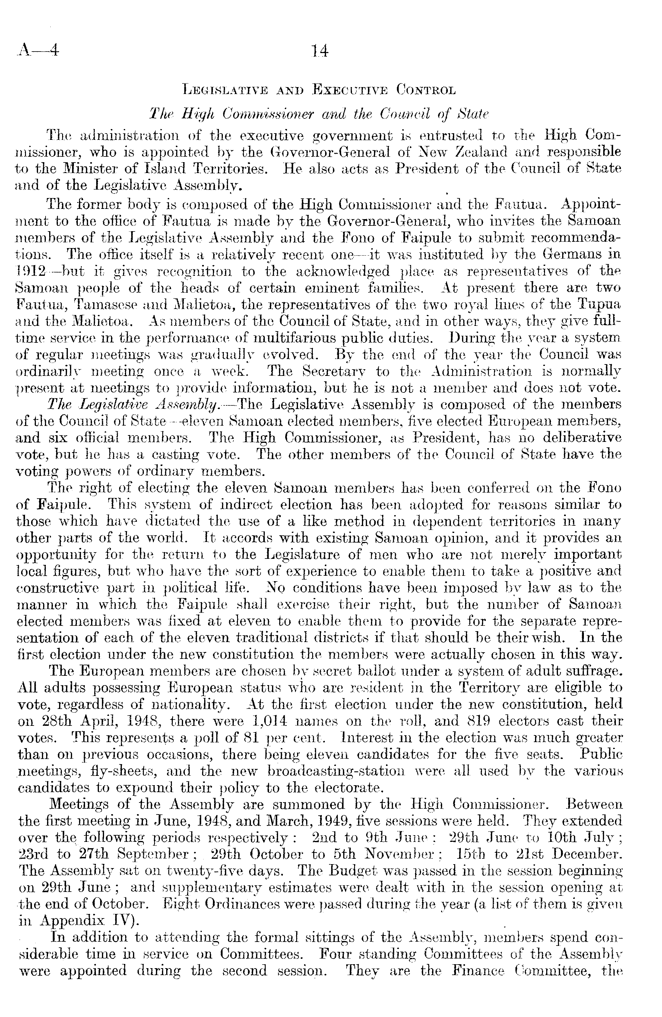 Legislative and Executive Control The High Commissioner and the Council of State The administration of the executive government is entrusted to the High Commissioner, who is appointed by the Governor-General of New Zealand and responsible to the Minister of Island Territories. He also acts as President of the Council of State and of the Legislative Assembly. The former body is composed of the High Commissioner and the Fautua. Appointment to the office of Fautua is made by the Governor-General, who invites the Samoan members of the Legislative Assembly and the Fono of Faipule to submit recommendations. The office itself is a relatively recent one —it was instituted by the Germans in 1912—but it gives recognition to the acknowledged place as representatives of the Samoan people of the heads of certain eminent families. At present there are two Fautua, Tamasese and Malietoa, the representatives of the two royal lines of the Tupua and the Malietoa. As members of the Council of State, and in other ways, they give fulltime service in the performance of multifarious public duties. During the year a system of regular meetings was gradually evolved. By the end of the year the Council was ordinarily meeting once a week. The Secretary to the Administration is normally present at meetings to provide information, but he is not a member and does not vote. The Legislative Assembly. —The Legislative Assembly is composed of the members of the Council of State—eleven Samoan elected members, five elected European members, and six official members. The High Commissioner, as President, has no deliberative vote, but he has a casting vote. The other members of the Council of State have the voting powers of ordinary members. The right of electing the eleven Samoan members has been conferred on the Fono of Faipule. This system of indirect election has been adopted for reasons similar to those which have dictated the use of a like method in dependent territories in many other parts of the world. It accords with existing Samoan opinion, and it provides an opportunity for the return to the Legislature of men who are not merely important local figures, but who have the sort of experience to enable them to take a positive and constructive part in political life. No conditions have been imposed by law as to the manner in which the Faipule shall exercise their right, but the number of Samoan elected members was fixed at eleven to enable them to provide for the separate representation of each of the eleven traditional districts if that should be their wish. In the first election under the new constitution the members were actually chosen in this way. The European members are chosen by secret ballot under a system of adult suffrage. All adults possessing European status who are resident in the Territory are eligible to vote, regardless of nationality. At the first election under the new constitution, held on 28th April, 1948, there were 1,014 names on the roll, and 819 electors cast their votes. This represents a poll of 81 per cent. Interest in the election was much greater than on previous occasions, there being eleven candidates for the five seats. Public meetings, fly-sheets, and the new broadcasting-station were all used by the various candidates to expound their policy to the electorate. Meetings of the Assembly are summoned by the High Commissioner. Between the first meeting in June, 1948, and March, 1949, five sessions were held. They extended over the v following periods respectively : 2nd to 9th June ; 29th June to 10th July ; 23rd to 27th September; 29th October to sth November ; 15th to 21st December. The Assembly sat on twenty-five days. The Budget was passed in the session beginning on 29th June ; and supplementary estimates were dealt with in the session opening at the end of October. Eight Ordinances were passed during the year (a list of them is given in Appendix IV). In addition to attending the formal sittings of the Assembly, members spend considerable time in service on Committees. Four standing Committees of the Assembly were appointed during the second session. They are the Finance Committee, the