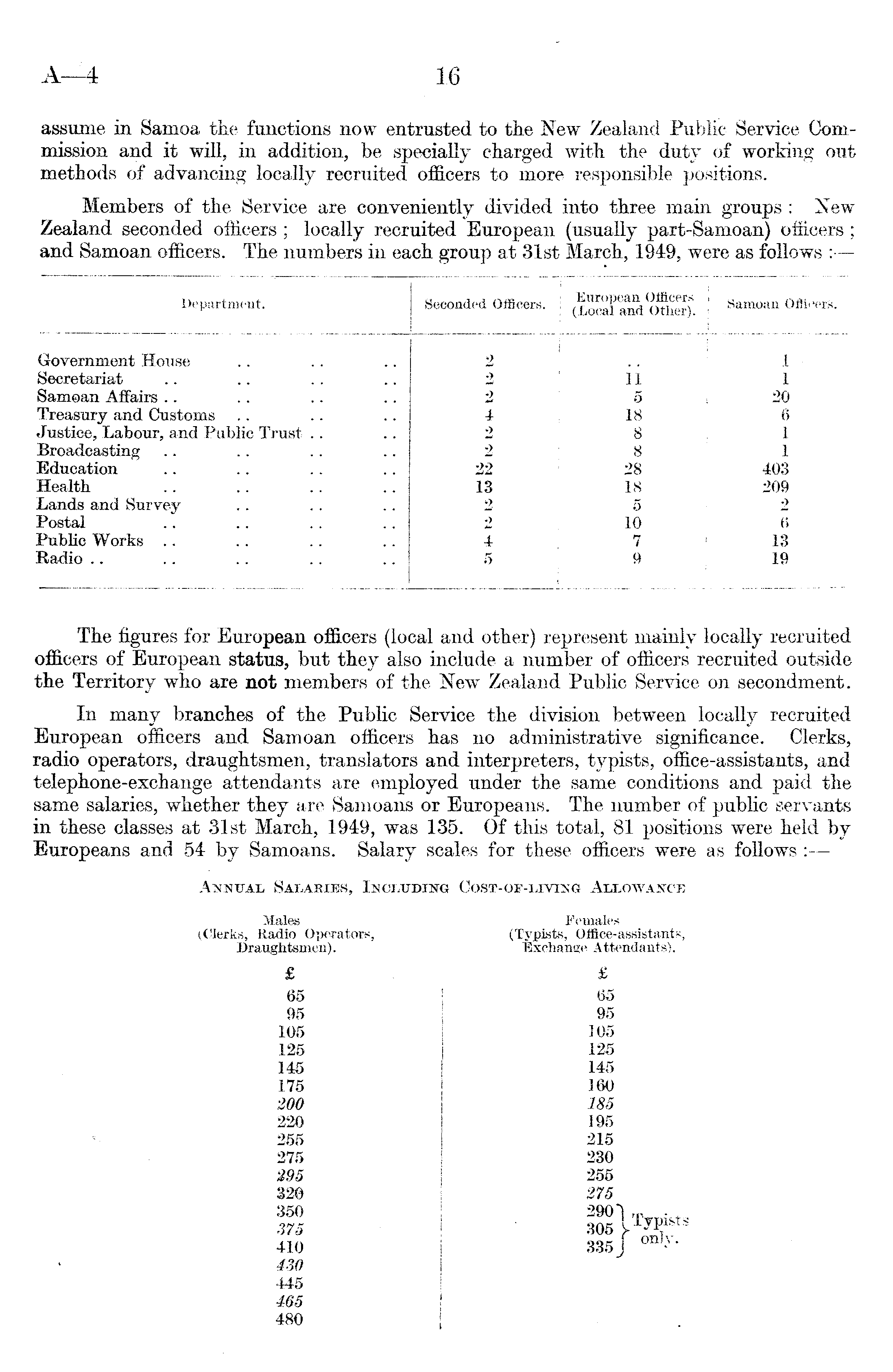 The figures for European officers (local and other) represent mainly locally recruited officers of European status, but they also include a number of officers recruited outside the Territory who are not members of the New Zealand Public Service on secondment. In many branches of the Public Service the division between locally recruited European officers and Samoan officers has no administrative significance. Clerks, radio operators, draughtsmen, translators and interpreters, typists, office-assistants, and telephone-exchange attendants are employed under the same conditions and paid the same salaries, whether they are Samoans or Europeans. The number of public servants in these classes at 31st March, 1949, was 135. Of this total, 81 positions were held by Europeans and 54 by Samoans. Salary scales for these officers were as follows : Annual Salaries, Including Cost-of-living Allowance Males Females (Clerks, Radio Operators, (Typists, Office-assistants, Draughtsmen). Exchange Attendants). £ £ 65 ] 65 95 | 95 105 | 105 125 125 145 145 175 160 200 185 220 J 195 " 255 | 215 275 | 230 295 | 255 328 1 275 350 i 29 °1 Typists 375 j 305 s 410 | 335 J * ' 430 445 465 | 480 I