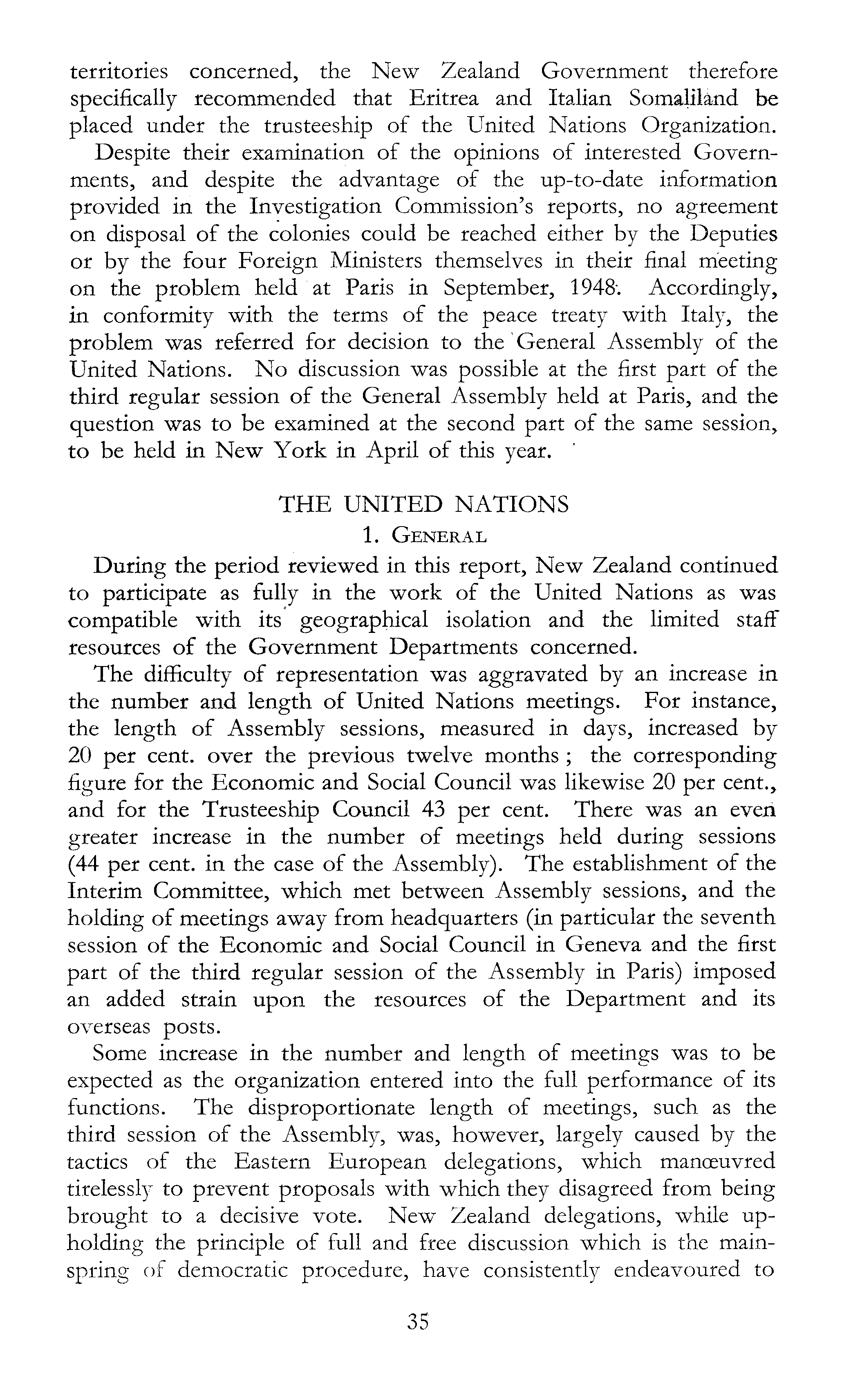 territories concerned, the New Zealand Government therefore specifically recommended that Eritrea and Italian Somaliland be placed under the trusteeship of the United Nations Organization. Despite their examination of the opinions of interested Governments, and despite the advantage of the up-to-date information provided in the Investigation Commission's reports, no agreement on disposal of the colonies could be reached either by the Deputies or by fhe four Foreign Ministers themselves in their final meeting on the problem held at Paris in September, 1948". Accordingly, in conformity with the terms of the peace treaty with Italy, the problem was referred for decision to the General Assembly of the United Nations. No discussion was possible at the first part of the third regular session of the General-Assembly held at Paris, and the question was to be examined at the second part of the same session, to be held in New York in April of this year. THE UNITED NATIONS 1. General During the period reviewed in this report, New Zealand continued to participate as fully in the work of the United Nations as was compatible with its geographical isolation and the limited staff resources of the Government Departments concerned. The difficulty of representation was aggravated by an increase in the number and length of United Nations meetings. For instance, the length of Assembly sessions, measured in days, increased by 20 per cent, over the previous twelve months ; the corresponding figure for the Economic and Social Council was likewise 20 per cent., and for the Trusteeship Council 43 per cent. There was an even greater increase in the number of meetings held during sessions (44 per cent, in the case of the Assembly). The establishment of the Interim Committee, which met between Assembly sessions, and the holding of meetings away from headquarters (in particular the seventh session of the Economic and Social Council in Geneva and the first part of the third regular session of the Assembly in Paris) imposed an added strain upon the resources of the Department and its overseas posts. Some increase in the number and length of meetings was to be expected as the organization entered into the full performance of its functions. The disproportionate length of meetings, such as the third session of the Assembly, was, however, largely caused by the tactics of the Eastern European delegations, which manoeuvred tirelessly to prevent proposals with which they disagreed from being brought to a decisive vote. New Zealand delegations, while upholding the principle of full and free discussion which is the mainspring of democratic procedure, have consistently endeavoured to