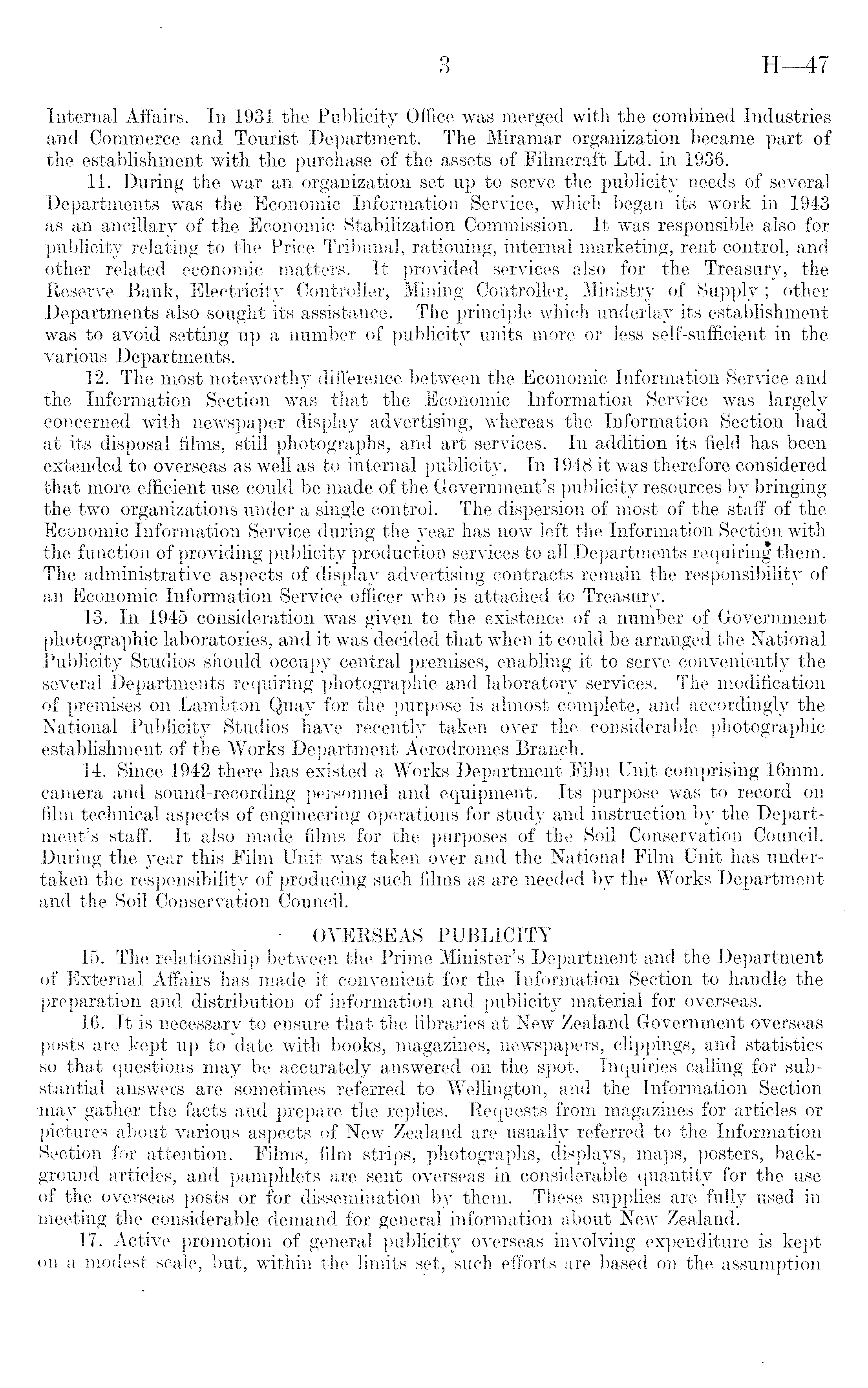 Internal Affairs. In 1931 the Publicity Office was merged with the combined Industries and Commerce and Tourist Department. The Miramar organization became part of the establishment with the purchase of the assets of Filmcraf't Ltd. in 1936. 11. During the war an organization set up to serve the publicity needs of several Departments was the Economic Information Service, which began its work in 1943 as an ancillary of the Economic Stabilization Commission. It was responsible also for publicity relating to the Price Tribunal, rationing, internal marketing, rent control, and other related economic matters. It provided services also for the Treasury, the Reserve Bank, Electricity Controller, Mining Controller, Ministry of Supply; other Departments also sought its assistance. The principle which underlay its establishment was to avoid setting up a number of publicity units more or less self-sufficient in the various Departments. 12. The most noteworthy difference between the Economic Information Service and the Information Section was that the Economic Information Service was largely concerned with newspaper display advertising, whereas the Information Section had at its disposal films, still photographs, and art services. In addition its field has been extended to overseas as well as to internal publicity. In 1948 it was therefore considered that more efficient use could be made of the Government's publicity resources by bringing the two organizations under a single control. The dispersion of most of the staff of the Economic Information Service during the year has now left the Information Section with the function of providing publicity production services to all Departments requiring them. The administrative aspects of display advertising contracts remain the responsibility of an Economic Information Service officer who is attached to Treasury. 13. In 1945 consideration was given to the existence of a number of Government photographic laboratories, and it was decided that when it could be arranged the National Publicity Studios should occupy central premises, enabling it to serve conveniently the several Departments requiring photographic and laboratory services. The modification of premises on Lambton Quay for the purpose is almost complete, and accordingly the National Publicity Studios have recently taken over the considerable photographic establishment of the Works Department Aerodromes Branch. 14. Since 1942 there has existed a Works Department Film Unit comprising 16mm. camera and sound-recording personnel and equipment. Its purpose was to record on film technical aspects of engineering operations for study and instruction by the Department's staff. It also made films for the purposes of the Soil Conservation Council. During the year this Film Unit was taken over and the National Film Unit has undertaken the responsibility of producing such films as are needed by the Works Department and the Soil Conservation Council. OVERSEAS PUBLICITY 15. The relationship between the Prime Minister's Department and the Department of External Affairs has made it convenient for the Information Section to handle the preparation and distribution of information and publicity material for overseas. 16. It is necessary to ensure that the libraries at New Zealand Government overseas posts are kept up to date with books, magazines, newspapers, clippings, and statistics so that questions may be accurately answered on the spot. Inquiries calling for substantial answers are sometimes referred to Wellington, and the Information Section ■may gather the facts and prepare the replies. Requests from magazines for articles or pictures about various aspects of New Zealand are usually referred to the Information Section for attention. Films, film strips, photographs, displays, maps, posters, background articles, and pamphlets are sent overseas in considerable quantity for the use of the overseas posts or for dissemination by them. These supplies are fully used in meeting the considerable demand for general information about New Zealand. 17. Active promotion of general publicity overseas involving expenditure is kept on a modest scale, but, within the limits set, such efforts are based on the assumption