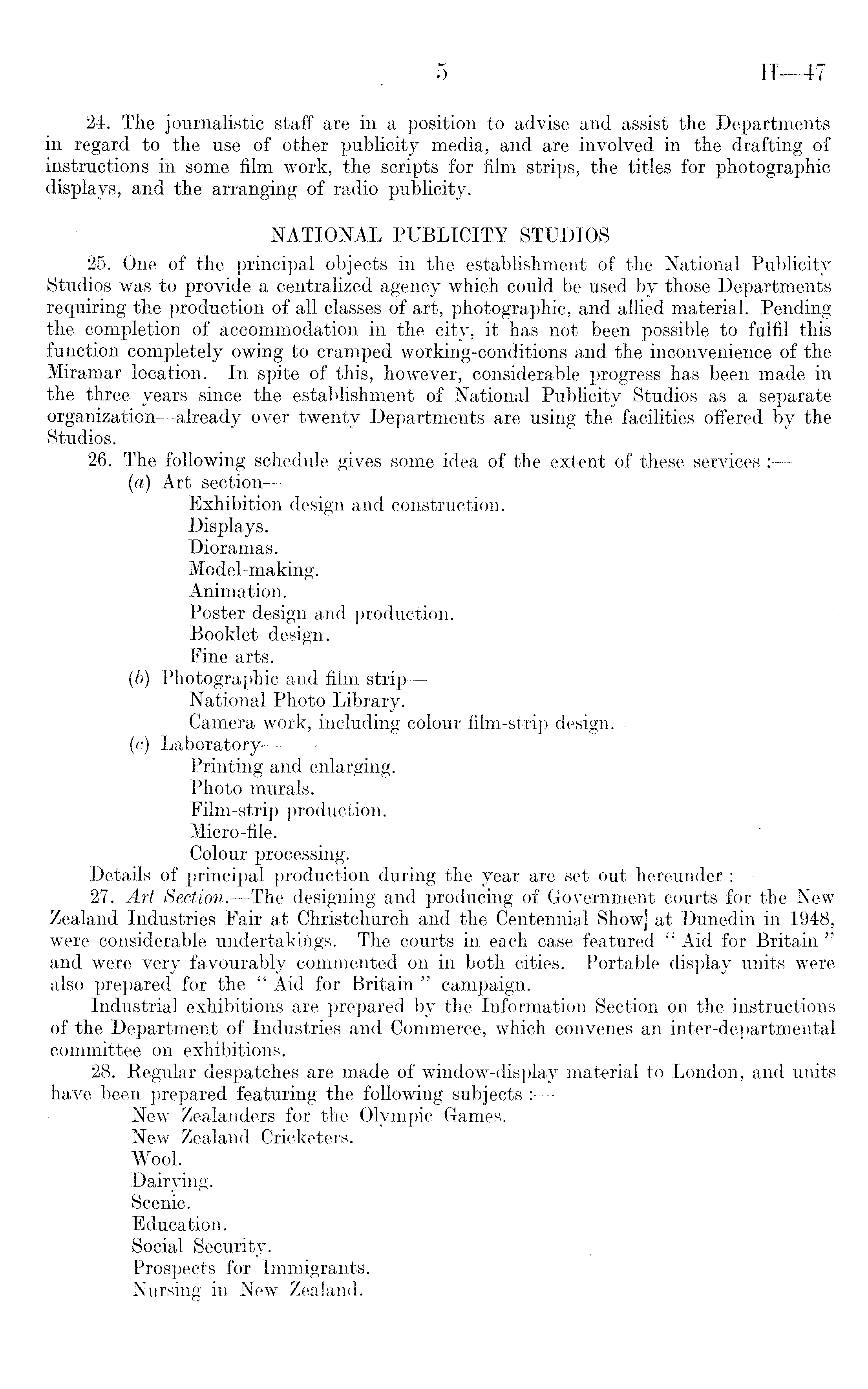 24. The journalistic staff are in a position to advise and assist the Departments in regard to the use of other publicity media, and are involved in the drafting of instructions in some film work, the scripts for film strips, the titles for photographic displays, and the arranging of radio publicity. NATIONAL PUBLICITY STUDIOS 25. One of the principal objects in the establishment of the National Publicity Studios was to provide a centralized agency which could be used by those Departments requiring the production of all classes of art, photographic, and allied material. Pending the completion of accommodation in the city, it has not been possible to fulfil this function completely owing to cramped working-conditions and the inconvenience of the Miramar location. In spite of this, however, considerable progress has been made in the three years since the establishment of National Publicity Studios as a separate organization—already over twenty Departments are using the facilities offered by the Studios. 26. The following schedule gives some idea of the extent of these services : (a) Art section — Exhibition design and construction. Displays. Dioramas. Model-making. Animation. Poster design and production. Booklet design. Fine arts. (b) Photographic and film strip — National Photo Library. Camera work, including colour film-strip design. (c) Laboratory— Printing and enlarging. Photo murals. Film-strip production. Micro-file. Colour processing. Details of principal production during the year are set out hereunder 27. Art■ Section.—The designing and producing of Government courts for the New Zealand Industries Fair at Christchurch and the Centennial Show] at Dunedin in 1948, were considerable undertakings. The courts in each case featured " Aid for Britain " and were very favourably commented on in both cities. Portable display units were also prepared for the " Aid for Britain " campaign. Industrial exhibitions are prepared by the Information Section on the instructions of the Department of Industries and Commerce, which convenes an inter-departmental committee on exhibitions. 28. Regular despatches are made of window-display material to London, and units have been prepared featuring the following subjects : New Zealanders for the Olympic Games. New Zealand Cricketers. Wool. Dairying. Scenic. Education. Social Security. Prospects for Immigrants. Nursing in New Zealand.