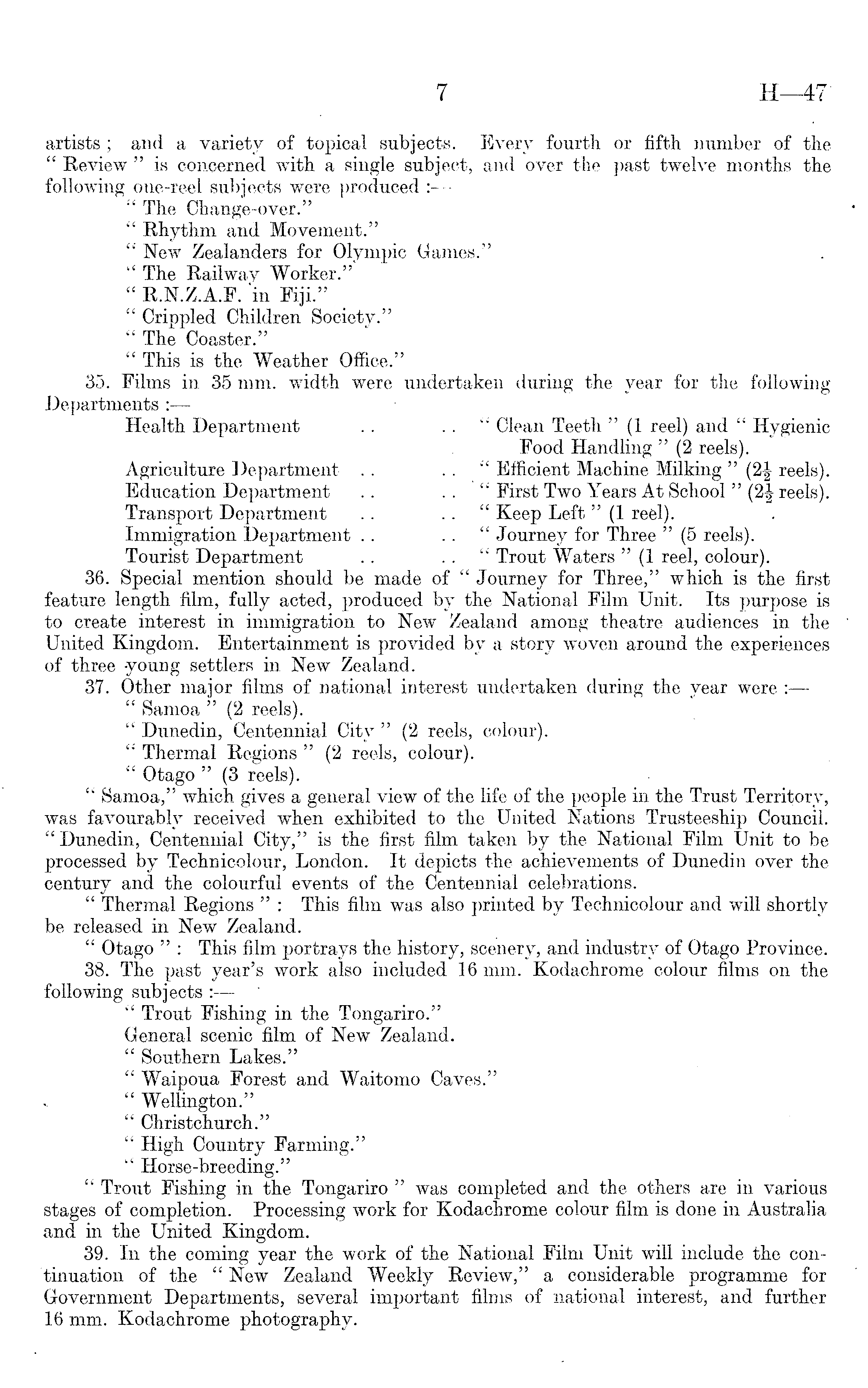 artists ; and a variety of topical subjects. Every fourth or fifth number of the " Review " is concerned with a single subject, and over the past twelve months the following one-reel subjects were produced : " The Change-over." " Rhythm and Movement." " New Zealanders for Olympic Games." " The Railway Worker." " R.N.Z.A.F. in Fiji." " Crippled Children Society." " The Coaster." " This is the Weather Office." 35. Films in 35 mm. width were undertaken during the year for the following Departments : Health Department . . .. " Clean Teeth "(1 reel) and " Hygienic Food Handling " (2 reels). Agriculture Department . . . . " Efficient Machine Milking " (2| reels). Education Department .. .. " First Two Years At School " (2| reels). Transport Department .. " Keep Left "(1 reel). Immigration Department .. . . " Journey for Three "(5 reels). Tourist Department . . . . " Trout Waters "(1 reel, colour). 36. Special mention should be made of " Journey for Three," which is the first feature length film, fully acted, produced by the National Film Unit. Its purpose is to create interest in immigration to New Zealand among theatre audiences in the United Kingdom. Entertainment is provided by a story woven around the experiences of three -young settlers in New Zealand. 37. Other major films of national interest undertaken during the year were : " Samoa " (2 reels). " Dunedin, Centennial City " (2 reels, colour). " Thermal Regions " (2 reels, colour). " Otago " (3 reels). " Samoa," which gives a general view of the life of the people in the Trust Territory, was favourably received when exhibited to the United Nations Trusteeship Council. " Dunedin, Centennial City," is the first film taken by the National Film Unit to be processed by Technicolour, London. It depicts the achievements of Dunedin over the century and the colourful events of the Centennial celebrations. " Thermal Regions " : This film was also printed by Technicolour and will shortly be released in New Zealand. " Otago " : This film portrays the history, scenery, and industry of Otago Province. 38. The past year's work also included 16 mm. Kodachrome colour films on the following subjects : " Trout Fishing in the Tongariro." General scenic film of New Zealand. " Southern Lakes." " Waipoua Forest and Waitomo Caves." " Wellington." " Christchurch." " High Country Farming." " Horse-breeding." " Trout Fishing in the Tongariro " was completed and the others are in various stages of completion. Processing work for Kodachrome colour film is done in Australia and in the United Kingdom. 39. In the coming year the work of the National Film Unit will include the continuation of the "New Zealand Weekly Review," a considerable programme for Government Departments, several important films of national interest, and further 16 mm. Kodachrome photography.