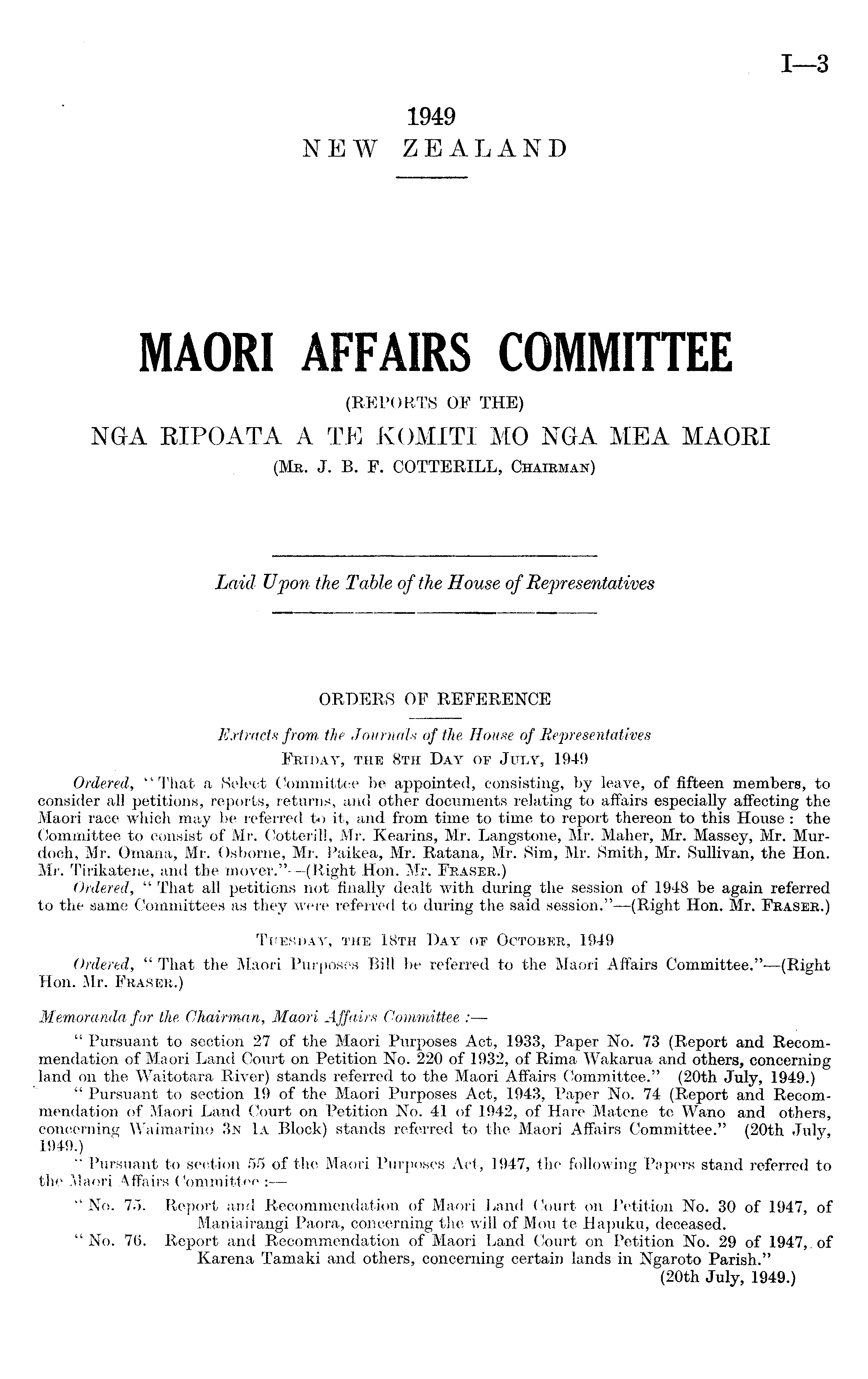 Extracts from the• Journals of the House of Representatives Friday, the Bth Day of July, 1949 Ordered, '' That a Select Committee be appointed, consisting, by leave, of fifteen members, to consider all petitions, reports, returns, and other documents relating to affairs especially affecting the Maori race which may be referred to it, and from time to time to report thereon to this House : the Committee to consist of Mr. Cotterill, Mr. Kearins, Mr. Langstone, Mr. Maher, Mr. Massey, Mr. Murdoch, Mr. Ornana, Mr. Osborne, Mr. Paikea, Mr. Ratana, Mr. Sim, Mr. Smith, Mr. Sullivan, the Hon. Mr. Tirikatene, and the mover."—(Right Hon. Mr. Fraser.) Ordered, " That all petitions not finally dealt with during the session of 1948 be again referred to the same Committees as they were referred to during the said session."—(Right Hon. Mr. Fraser.) Tuesday, the 18th Day of October, 1949 Ordered, " That the Maori Purposes Rill be referred to the Maori Affairs Committee."—(Right Hon. Mr. Fraser.) Memoranda for the Chairman, Maori Affairs Committee " Pursuant to section 27 of the Maori Purposes Act, 1933, Paper No. 73 (Report and Recommendation of Maori Land Court on Petition No. 220 of 1932, of Rima Wakarua and others, concerning land on the Waitotara River) stands referred to the Maori Affairs Committee." (20th July, 1949.) " Pursuant to section 19 of the Maori Purposes Act, 1943, Paper No. 74 (Report and Recommendation of Maori Land Court on Petition No. 41 of 1942, of Hare Matene te Wano and others, concerning Waimarino 3n Ia Block) stands referred to the Maori Affairs Committee." (20th July, 1949.) " Pursuant to section 55 of the Maori Purposes Act, 1947, the following Papers stand referred to the Maori Affairs Committee : " No. 75. Report and Recommendation of Maori Land Court on Petition No. 30 of 1947, of Maniairangi Paora, concerning the will of Mou te Hapuku, deceased. "No. 76. Report and Recommendation of Maori Land Court on Petition No. 29 of 1947, of Karena Tamaki and others, concerning certain lands in Ngaroto Parish." (20th July, 1949.)