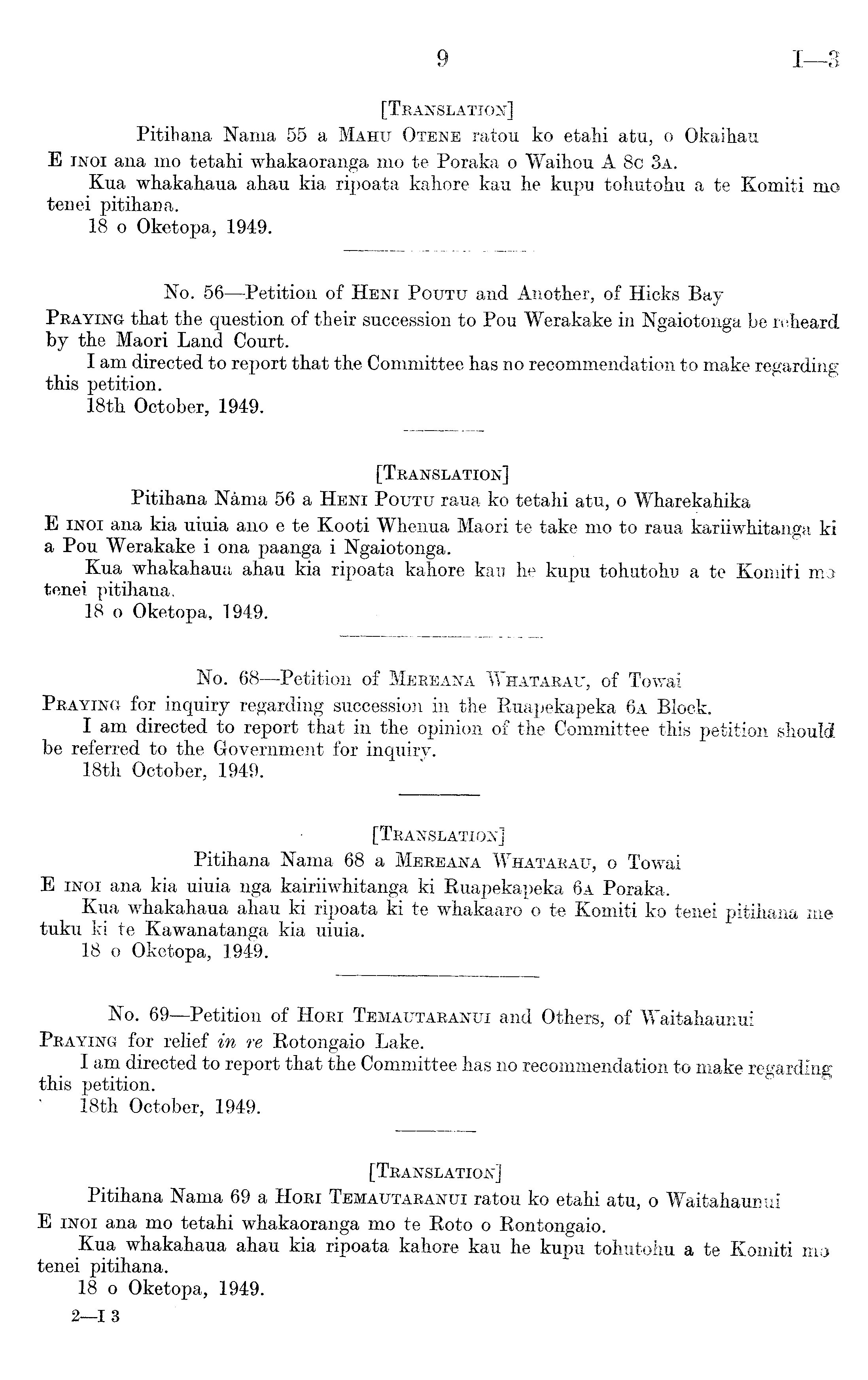 [Translation] Pitihana Nama 69 a Hori Temautaranui raton ko etahi atu, o Waitahaunui E inoi ana mo tetahi whakaoranga mo te Roto o Bontongaio. Kua whakahaua ahau kia ripoata kahore kau lie kupu tohutohu a te Komiti mo tenei pitihana. 18 o Oketopa, 1949.