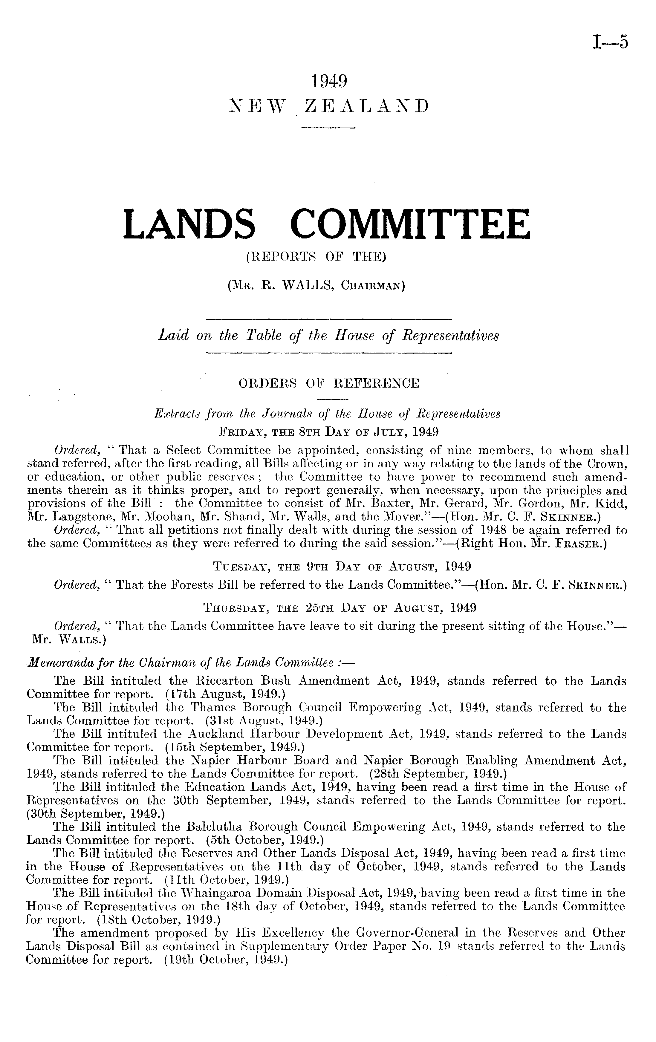 Extracts from the. Journals of the House of Representatives Friday, the Bth Day of July, 1949 Ordered, " That a Select Committee be appointed, consisting of nine members, to whom shall stand referred, after the first reading, all Bills affecting or in any way relating to the lands of the Crown, or education, or other public reserves ; the Committee to have power to recommend such amendments therein as it thinks proper, and to report generally, when necessary, upon the principles and provisions of the Bill : the Committee to consist of Mr. Baxter, Mr. Gerard, Mr. Gordon, Mr. Kidd, Mr. Langstone, Mr. Moohan, Mr. Shand, Mr. Walls, and the Mover."—(Hon. Mr. C. F. Skinner.) Ordered, " That all petitions not finally dealt with during the session of 1948 be again referred to the same Committees as they were referred to during the said session."—(Right Hon. Mr. Fraser.) Tuesday, the 9th Day of August, 1949 Ordered, " That the Forests Bill be referred to the Lands Committee."—(Hon. Mr. C. F. Skinner.) Thursday, the 25th Day of August, 1949 Ordered, " That the Lands Committee have leave to sit during the present sitting of the House."— Mr. Walls.) Memoranda for the Chairman of the Lands Committee : The Bill intituled the Riccarton Bush Amendment Act, 1949, stands referred to the Lands Committee for report. (17th August, 1949.) The Bill intituled the Thames Borough Council Empowering Act, 1949, stands referred to the Lands Committee for report. (31st August, 1949.) The Bill intituled the Auckland Harbour Development Act, 1949, stands referred to the Lands Committee for report. (15th September, 1949.) The Bill intituled the Napier Harbour Board and Napier Borough Enabling Amendment Act, 1949, stands referred to the Lands Committee for report. (28th September, 1949.) The Bill intituled the Education Lands Act, 1949, having been read a first time in the House of Representatives on the 30th September, 1949, stands referred to the Lands Committee for report. (30th September, 1949.) The Bill intituled the Balclutha Borough Council Empowering Act, 1949, stands referred to the Lands Committee for report. (sth October, 1949.) The Bill intituled the Reserves and Other Lands Disposal Act, 1949, having been read a first time in the House of Representatives on the 11th day of October, 1949, stands referred to the Lands Committee for report. (11th October, 1949.) The Bill intituled the Whaingaroa Domain Disposal Act, 1949, having been read a first time in the House of Representatives on the 18th day of October, 1949, stands referred to the Lands Committee for report. (18th October, 1949.) The amendment proposed by His Excellency the Governor-General in the Reserves and Other Lands Disposal Bill as contained in Supplementary Order Paper No. 19 stands referred to the Lands Committee for report. (19th October, 1949.)