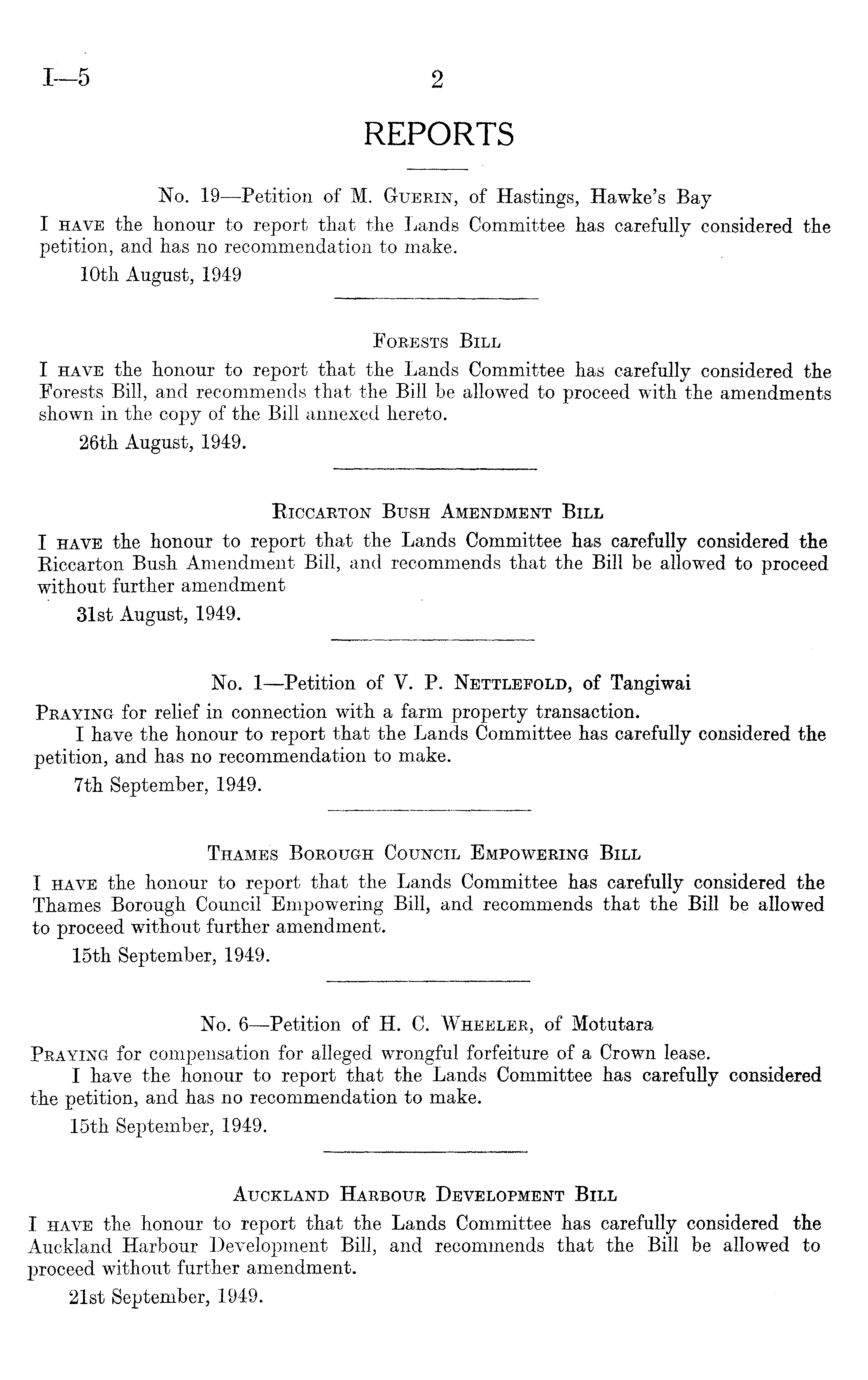 No. I—Petition1 —Petition of V. P. Nettlefold, of Tangiwai Praying for relief in connection with a farm property transaction. I have the honour to report that the Lands Committee has carefully considered the petition, and has no recommendation to make. 7th September, 1949.