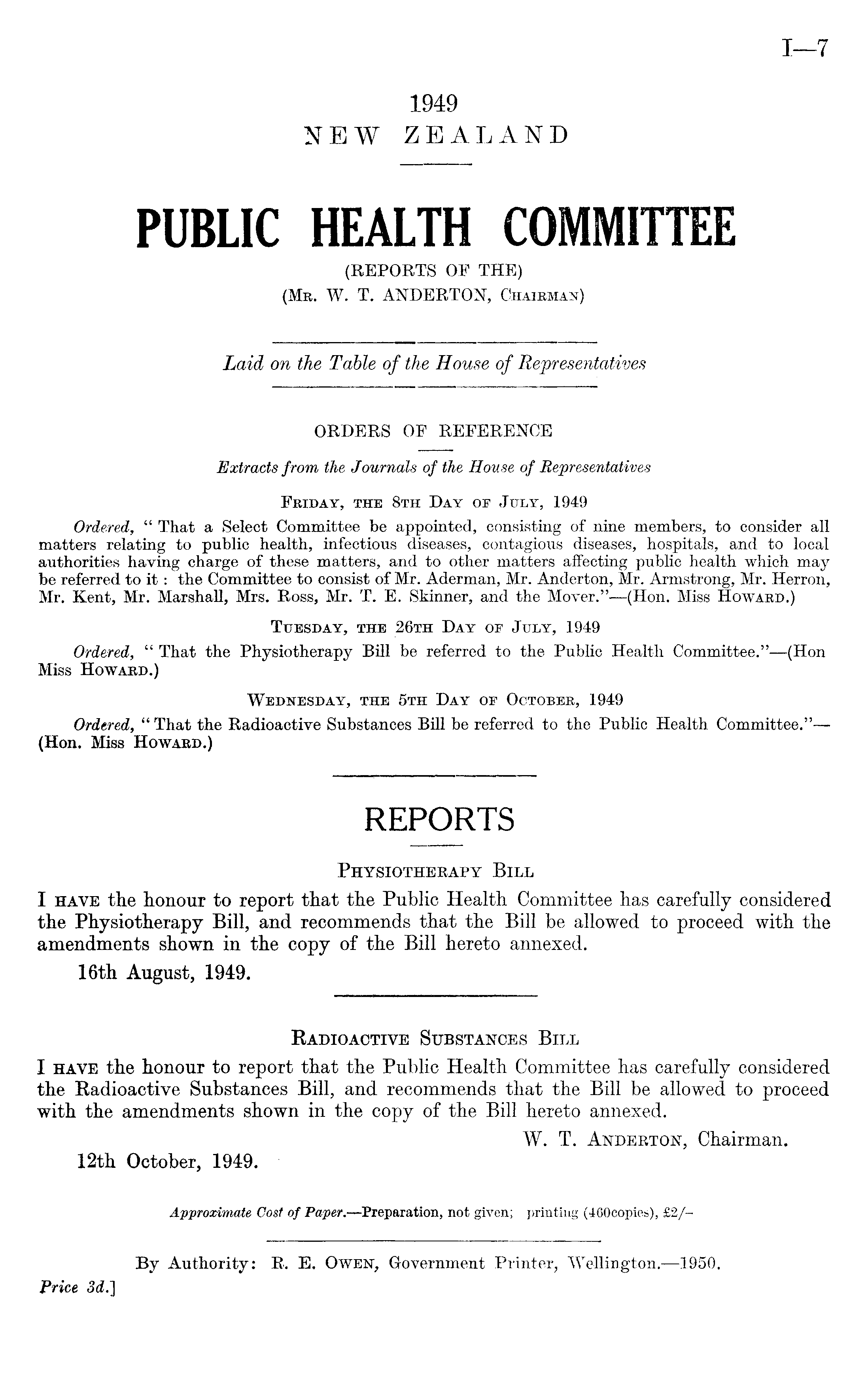 Extracts from the Journals of the House of Representatives Friday, the Bth Day of July, 1949 Ordered, " That a Select Committee be appointed, consisting of nine members, to consider all matters relating to public health, infectious diseases, contagious diseases, hospitals, and to local authorities having charge of these matters, and to other matters affecting public health which may be referred to it: the Committee to consist of Mr. Aderman, Mr. Anderton, Mr. Armstrong, Mr. Herron, Mr. Kent, Mr. Marshall, Mrs. Ross, Mr. T. E. Skinner, and the Mover."—(Hon. Miss Howard.) Tuesday, the 26th Day of July, 1949 Ordered, " That the Physiotherapy Bill be referred to the Public Health Committee."—(Hon Miss Howard.) Wednesday, the sth Day op October, 1949 Ordered, " That the Radioactive Substances Bill be referred to the Public Health Committee." — (Hon. Miss Howard.)