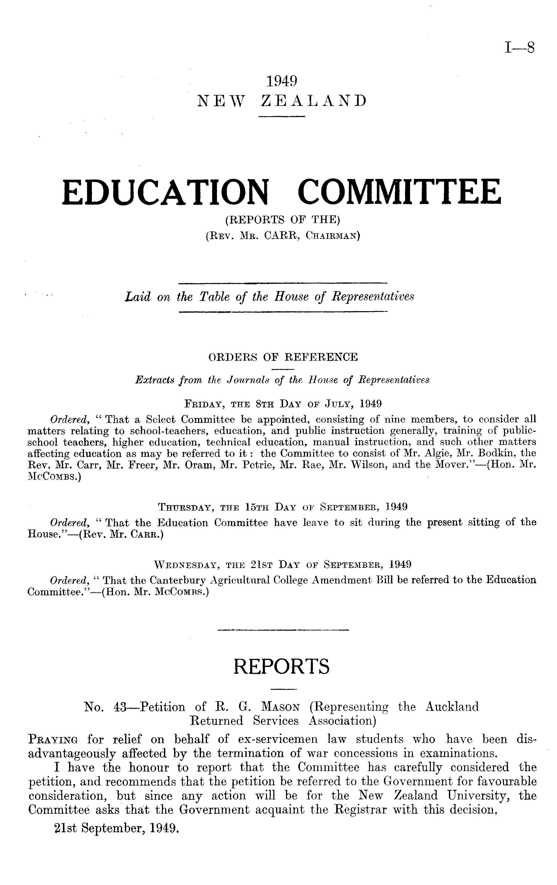 Extracts from the Journals of the House of Representatives Friday, the Bth Day of July, 1949 Ordered, " That a Select Committee be appointed, consisting of nine members, to consider all matters relating to school-teachers, education, and public instruction generally, training of publicschool teachers, higher education, technical education, manual instruction, and such other matters affecting education as may be referred to it: the Committee to consist of Mr. Algie, Mr. Bodkin, the Rev. Mr. Carr, Mr. Freer, Mr. Oram, Mr. Petrie, Mr. Rae, Mr. Wilson, and the Mover."—(Hon. Mr. McCombs.) Thursday, the 15th Day of September, 1949 Ordered, " That the Education Committee have leave to sit during the present sitting of the House."—(Rev. Mr. Carr.) Wednesday, the 21st Day of September, 1949 Ordered, " That the Canterbury Agricultural College Amendment Bill be referred to the Education Committee."—(Hon. Mr. McCombs.)