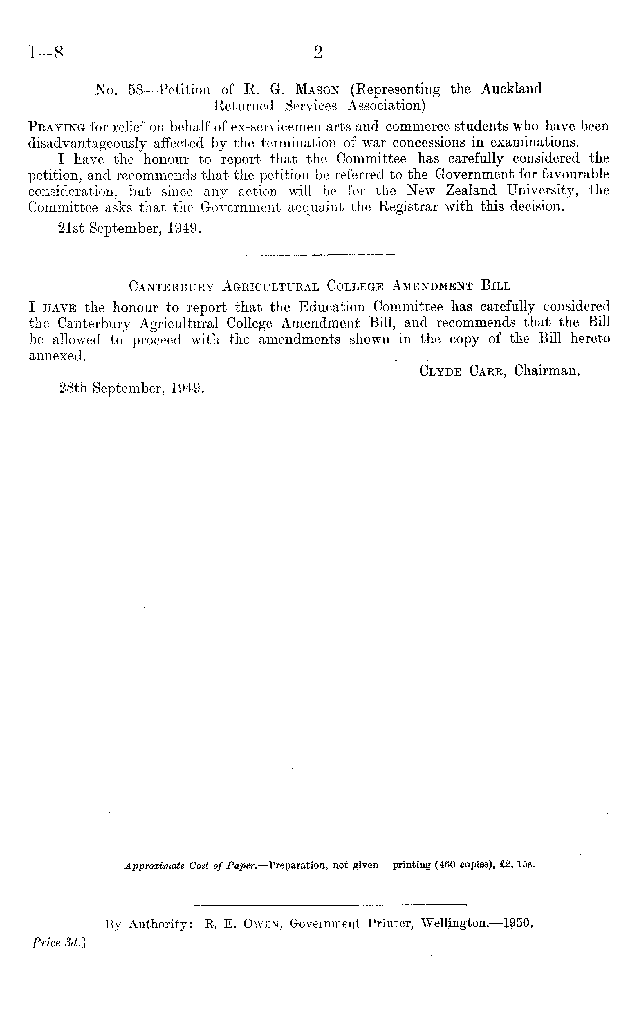 No. 58—Petition of R. G. Mason (Eepresenting the Auckland Returned Services Association) Praying for relief on behalf of ex-servicemen arts and commerce students who have been disadvantageously affected by the termination of war concessions in examinations. I have the honour to report that the Committee has carefully considered the petition, and recommends that the petition be referred to the Government for favourable consideration, but since any action will be for the New Zealand University, the Committee asks that the Government acquaint the Registrar with this decision. 21st September, 1949.