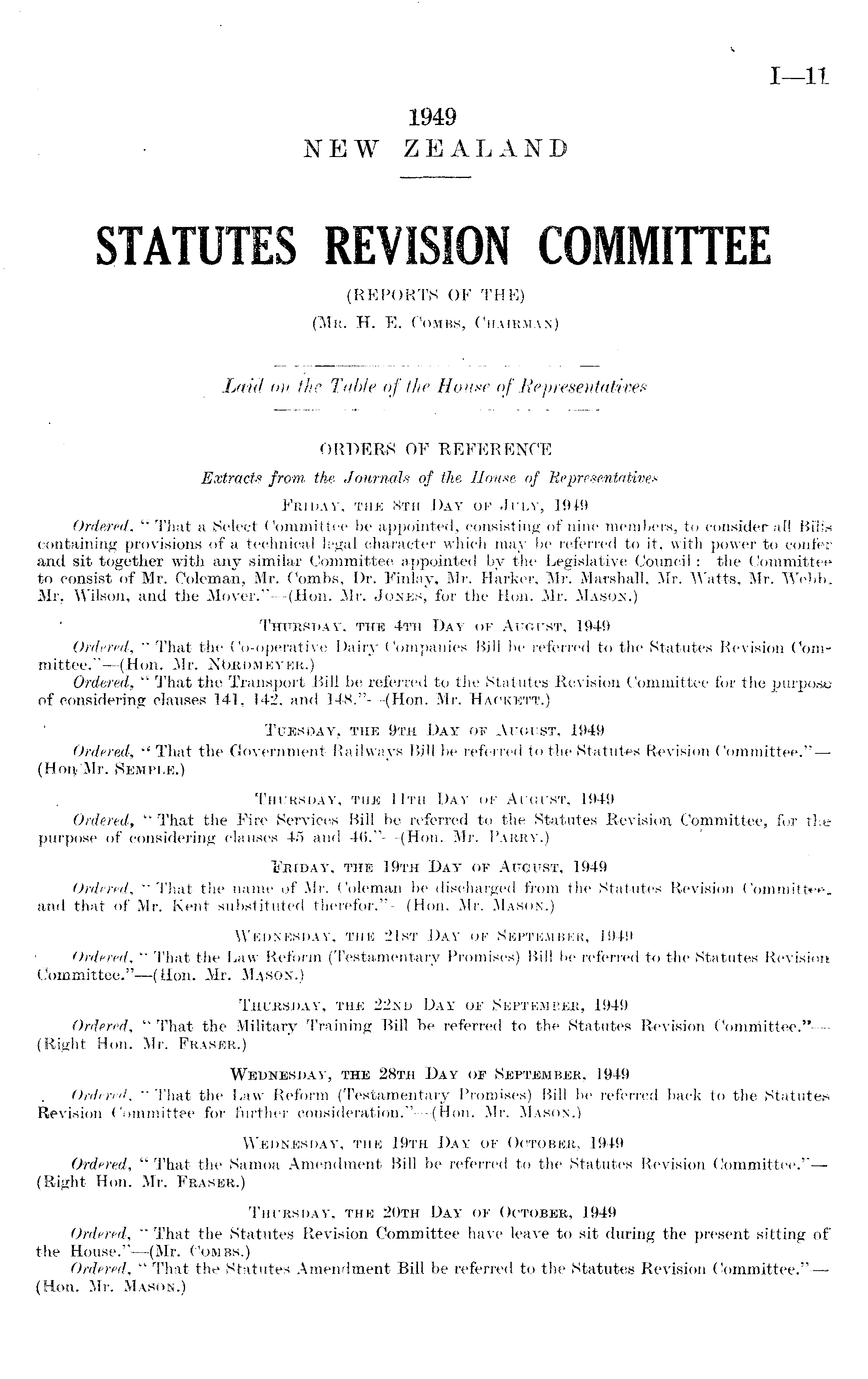 ORDERS OF REFERENCE Extracts from the Journals of the House of Representatives Friday, the Bth Day of July, 1949 Ordered, " That a Select Committee be appointed, consisting of nine members, to consider all' Bills containing provisions of a technical legal character which may be referred to it, with power to confer and sit together with any similar Committee appointed by the Legislative Council : the Committee to consist of Mr. Coleman, Mr. Combs, Dr. Finlay, Mr. Harker, Mr. Marshall, Mr. Watts, Mr. Webb. Mr. Wilson, and the Mover."—(Hon. Mr. Jones, for the Hon. Mr. Mason.) Thursday, the 4th Day of August, 1949 Ordered, " That the Co-operative Dairy Companies Bill be referred to the Statutes Revision Committee." —(Hon. Mr. NOrdmeyer.) Ordered, " That the Transport Bill be referred to the Statutes Revision Committee for the purpose of considering clauses 14], 142, and 148."—(Hon. Mr. Haokett.) Tuesday, the 9th Day of August, 1949 Ordered, " That the Government Railways Bill be referred to the Statutes Revision Committee." — (HonfMr. Semple.) Thursday, the 11th Day of August, 1949 Ordered, " That the Fire Services Bill be referred to the Statutes Revision Committee, for the purpose of considering clauses 45 and 46."-—(Hon. Mr, Parry.) Friday, the 19th Day of August, 1949 Ordered, " That the name of Mr. Coleman be discharged from the Statutes Revision Committee, and that of Mr. Kent substituted therefor." —(Hon, Mr. Mason.) Wednesday, the 21st Day of September, J 949 Ordered, " That the Law Reform (Testamentary Promises) Bill be referred to the Statutes Revision Committee."—(Hon. Mr. M4SON.) Thursday, the 22nd Day of September, 1949 Ordered, " That the Military Training Bill be referred to the Statutes Revision Committee."— (Right Hon. Mr. Fraser.) Wednesday, the 28th Day of September, 1949 Ordered, " That the Law Reform (Testamentary Promises) Bill be referred back to the Statutes Revision Committee for further consideration." —(Hon. Mr. Mason.) Wednesday, the 19th Day of October, 1949 Ordered, " That the Samoa Amendment Bill be referred to the Statutes Revision Committee." — (Right Hon. Mr. Fraser.) Thursday, the 20th Day of October, 1949 Ordered, " That the Statutes Revision Committee have leave to sit during the present sitting of the House." —(Mr. Combs.) Ordered, " That the Statutes Amendment Bill be referred to the Statutes Revision Committee."— (Hon. Mr. Mason.)