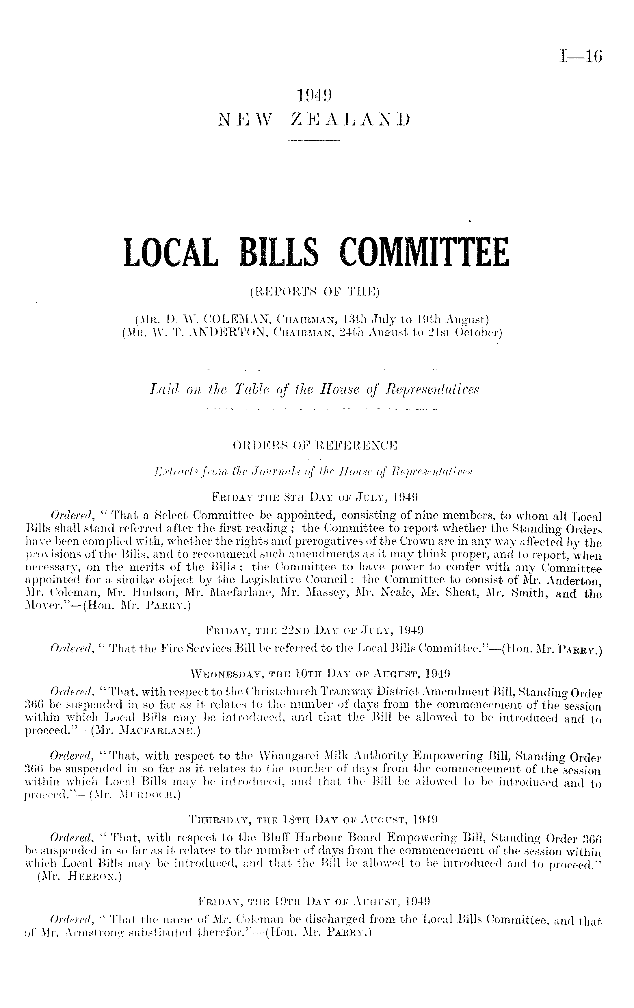 Extract? from flie Journals of the House of Representatives Friday tub Bth Day op July, 1949 Ordered, " That a Select Committee be appointed, consisting of nine members, to whom all Local Bills shall stand referred after the first reading ; the Committee to report whether the Standing Orders have been complied with, whether the rights and prerogatives of the Crown are in any way affected by the provisions of the Bills, and to recommend such amendments as it may think proper, and to report, when necessary, on the merits of the Bills ; the Committee to have power to confer with any Committee appointed for a similar object by the Legislative Council: the Committee to consist of Mr. Anderton, Mr. Coleman, Mr. Hudson, Mr. Macfarlane, Mr. Massey, Mr. Neale, Mr. Sheat, Mr. Smith, and the Mover." —(Hon. Mr, Parry.) Friday, the 22nd Day of July, 1949 Ordered, " That the Fire Services Bill be referred to the Local Bills Committee."—(Hon. Mr. Parry.) Wednesday, the 10th Day of August, 1949 Ordered, "That, with respect to the Christchurch Tramway District Amendment Bill, Standing Order 366 be suspended in so far as it relates to the number of days from the commencement of the session within which Local Bills may be introduced, and that the Bill be allowed to be introduced and to proceed."—(Mr. Macfarlane.) Ordered, "That, with respect to the Whangarei Milk Authority Empowering Bill, Standing Order 366 be suspended in so far as it relates to the number of days from the commencement of the session within which Local Bills may be introduced, and that the Bill be allowed to be introduced and to proceed."—(Mr. Murdoch.) Thursday, the 18th Day of Auoust, 1949 Ordered, " That, with respect to the Bluff Harbour Board Empowering Bill, Standing Order 366 be suspended in so far as it relates to the number of days from the commencement of the session within which Local Bills may be introduced, and that the Bill be allowed to be introduced and to proceed." —(Mr. Herron.) Friday, the 19th Day of August, 1949 Ordered, " That the name of Mr. Coleman be discharged from the Local Bills Committee, and that of Mr. Armstrong substituted therefor." —(Hon. Mr, Parry.)