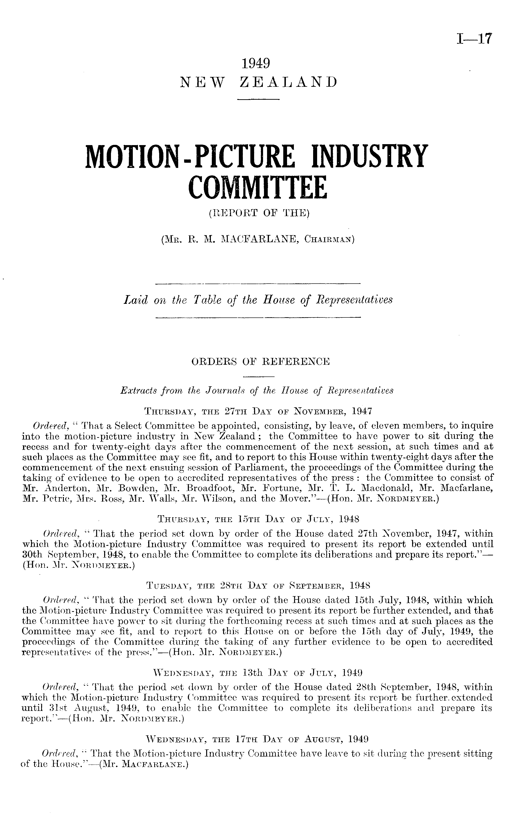 Extracts from the Journals of the House of Representatives Thursday, the 27th Day of November, 1947 Ordered, " That a Select Committee be appointed, consisting, by leave, of eleven members, to inquire into the motion-picture industry in New Zealand; the Committee to have power to sit during the recess and for twenty-eight days after the commencement of the next session, at such times and at such places as the Committee may see fit, and to report to this House within twenty-eight days after the commencement of the next ensuing session of Parliament, the proceedings of the Committee during the taking of evidence to be open to accredited representatives of the press : the Committee to consist of Mr. Anderton, Mr. Bowden, Mr. Broadfoot, Mr. Fortune, Mr. T. L. Macdonald, Mr. Macfarlane, Mr. Petrie, Mrs. Ross, Mr. Walls, Mr. Wilson, and the Mover." —(Hon. Mr. Nordmeyer.) Thursday, the 15th Day of July, 1948 Ordered, " That the period set down by order of the House dated 27th November, 1947, within which the Motion-picture Industry Committee was required to present its report be extended until 30th September, 1948, to enable the Committee to complete its deliberations and prepare its report."— (Hon. Mr. Nordmeyer.) Tuesday, the 28th Day of September, 1948 Ordered, " That the period set down by order of the House dated 15th July, 1948, within which the Motion-picture Industry Committee was required to present its report be further extended, and that the Committee have power to sit during the forthcoming recess at such times and at such places as the Committee may see fit, and to report to this House on or before the 15th day of July, 1949, the proceedings of the Committee during the taking of any further evidence to be open to accredited representatives of the press."—(Hon. Mr. Nordmeyer.) Wednesday, the 13th Day of July, 1949 Ordered, " That the period set down by order of the House dated 28th September, 1948, within which the Motion-picture Industry Committee was required to present its report be further, extended until 31st August, 1949, to enable the Committee to complete its deliberations and prepare its report."—(Hon. Mr. Nordmeyer.) Wednesday, the 17th Day of August, 1949 Ordered, " That the Motion-picture Industry Committee have leave to sit during the present sitting of the House." —(Mr. Macfarlane.)