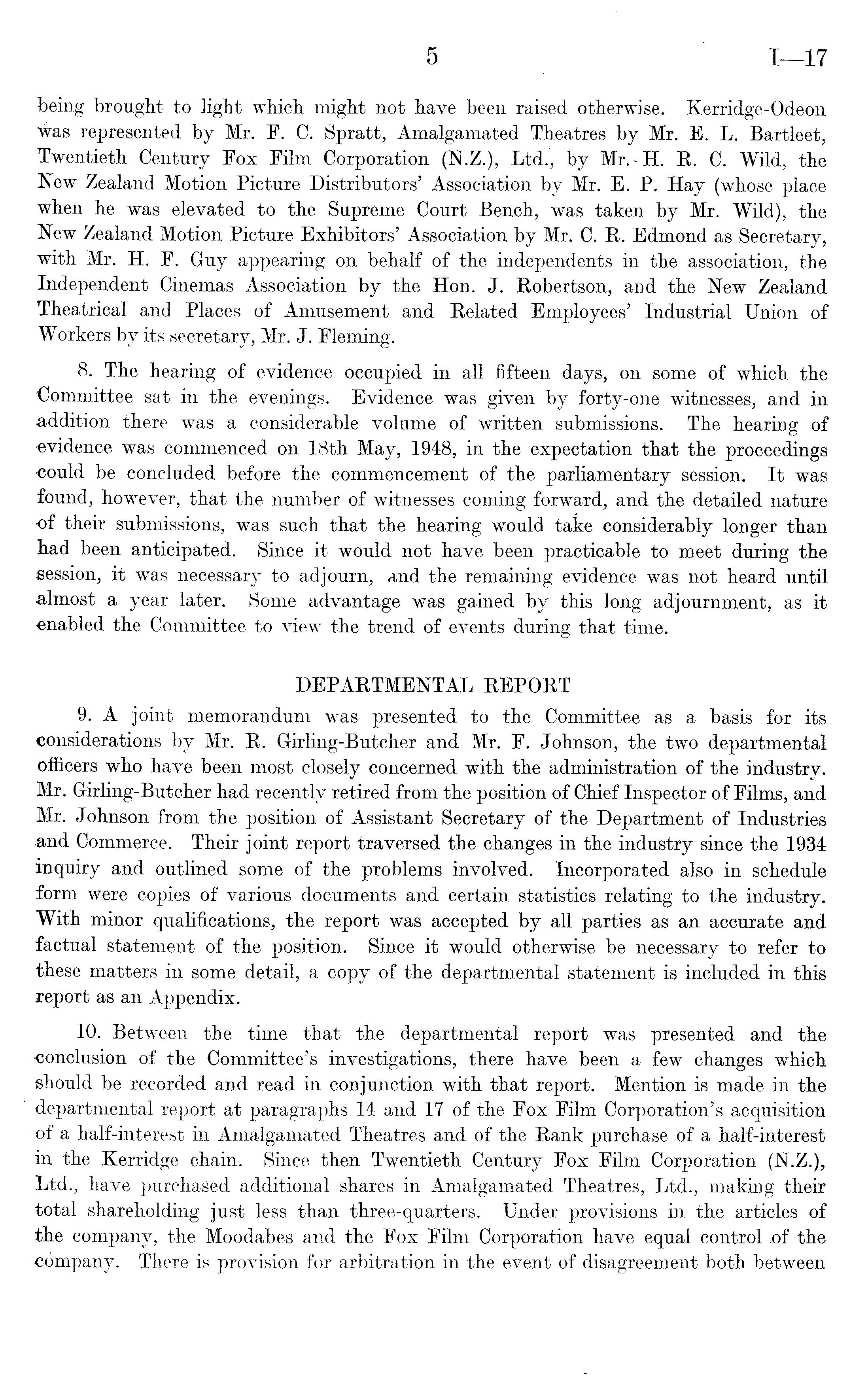 being brought to light which might not have been raised otherwise. Kerridge-Odeon was represented by Mr. F. C. Spratt, Amalgamated Theatres by Mr. E. L. Bartleet, Twentieth Century Fox Film Corporation (N.Z.), Ltd., by Mr.-H. R. C. Wild, the New Zealand Motion Picture Distributors' Association by Mr. E. P. Hay (whose place when he was elevated to the Supreme Court Bench, was taken by Mr. Wild), the New Zealand Motion Picture Exhibitors' Association by Mr. C. R. Edmond as Secretary, with Mr. H. F. Guy appearing on behalf of the independents in the association, the Independent Cinemas Association by the Hon. J. Robertson, and the New Zealand Theatrical and Places of Amusement and Related Employees' Industrial Union of Workers by its secretary, Mr. J. Fleming. 8. The hearing of evidence occupied in all fifteen days, on some of which the Committee sat in the evenings. Evidence was given by forty-one witnesses, and in addition there was a considerable volume of written submissions. The hearing of evidence was commenced on 18th May, 1948, in the expectation that the proceedings could be concluded before the commencement of the parliamentary session. It was found, however, that the number of witnesses coming forward, and the detailed nature of their submissions, was such that the hearing would take considerably longer than had been anticipated. Since it would not have been practicable to meet during the session, it was necessary to adjourn, and the remaining evidence was not heard until almost a year later. Some advantage was gained by this long adjournment, as it enabled the Committee to view the trend of events during that time. DEPARTMENTAL REPORT 9. A joint memorandum was presented to the Committee as a basis for its considerations by Mr. R. Girling-Butcher and Mr. F. Johnson, the two departmental officers who have been most closely concerned with the administration of the industry. Mr. Girling-Butcher had recently retired from the position of Chief Inspector of Films, and Mr. Johnson from the position of Assistant Secretary of the Department of Industries and Commerce. Their joint report traversed the changes in the industry since the 1934 inquiry and outlined some of the problems involved. Incorporated also in schedule form were copies of various documents and certain statistics relating to the industry. With minor qualifications, the report was accepted by all parties as an accurate and factual statement of the position. Since it would otherwise be necessary to refer to these matters in some detail, a copy of the departmental statement is included in this report as an Appendix. 10. Between the time that the departmental report was presented and the conclusion of the Committee's investigations, there have been a few changes which should be recorded and read in conjunction with that report. Mention is made in the departmental report at paragraphs 14 and 17 of the Fox Film Corporation's acquisition ■of a half-interest in Amalgamated Theatres and of the Rank purchase of a half-interest in the Kerridge chain. Since then Twentieth Century Fox Film Corporation (N.Z.), Ltd., have purchased additional shares in Amalgamated Theatres, Ltd., making their total shareholding just less than three-quarters. Under provisions in the articles of the company, the Moodabes and the Fox Film Corporation have equal control .of the company. There is provision for arbitration in the event of disagreement both between