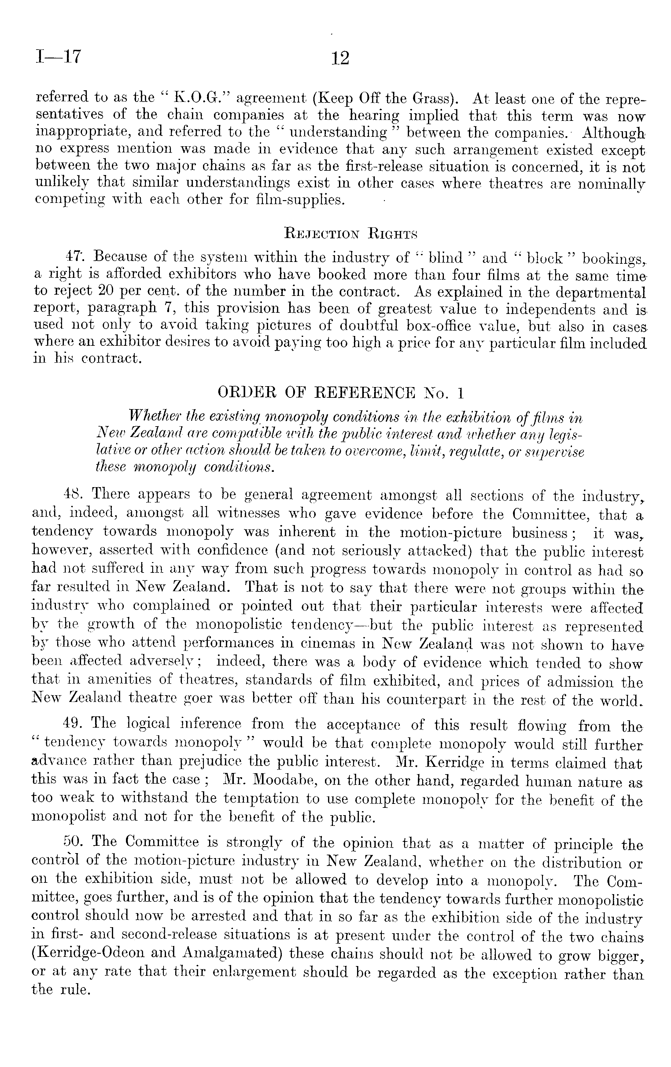 referred to as the " K.0.G." agreement (Keep Off the Grass). At least one of the representatives of the chain companies at the hearing implied that this term was now inappropriate, and referred to the " understanding " between the companies. Although no express mention was made in evidence that any such arrangement existed except between the two major chains as far as the first-release situation is concerned, it is not unlikely that similar understandings exist in other cases where theatres are nominally competing with each other for film-supplies. Rejection Rights 47'. Because of the system within the industry of " blind " and " block " bookings,, a right is afforded exhibitors who have booked more than four films at the same time to reject 20 per cent, of the number in the contract. As explained in the departmental report, paragraph 7, this provision has been of greatest value to independents and is used not only to avoid taking pictures of doubtful box-office value, but also in cases where an exhibitor desires to avoid paying too high a price for any particular film included in his contract. ORDER OF REFERENCE No. 1 Whether the existing monopoly conditions in the exhibition of films in New Zealand are compatible with the public interest and whether any legislative or other action should be taken to overcome, limit, regulate, or supervise these monopoly conditions. 48. There appears to be general agreement amongst all sections of the industry, and, indeed, amongst all witnesses who gave evidence before the Committee, that a tendency towards monopoly was inherent in the motion-picture business ; it was, however, asserted with confidence (and not seriously attacked) that the public interest had not suffered in any way from such progress towards monopoly in control as had so far resulted in New Zealand. That is not to say that there were not groups within the industry who complained or pointed out that their particular interests were affected by the growth of the monopolistic tendency—but the public interest as represented by those who attend performances in cinemas in New Zealand was not shown to have been affected adversely; indeed, there was a body of evidence which tended to show that in amenities of theatres, standards of film exhibited, and prices of admission the New Zealand theatre goer was better off than his counterpart in the rest of the world. 49. The logical inference from the acceptance of this result flowing from the " tendency towards monopoly " would be that complete monopoly would still further advance rather than prejudice the public interest. Mr. Kerridge in terms claimed that this was in fact the case ; Mr. Moodabe, on the other hand, regarded human nature as too weak to withstand the temptation to use complete monopoly for the benefit of the monopolist and not for the benefit of the public. 50. The Committee is strongly of the opinion that as a matter of principle the control of the motion-picture industry in New Zealand, whether on the distribution or on the exhibition side, must not be allowed to develop into a monopoly. The Committee, goes further, and is of the opinion that the tendency towards further monopolistic control should now be arrested and that in so far as the exhibition side of the industry in first- and second-release situations is at present under the control of the two chains (Kerridge-Odeon and Amalgamated) these chains should not be allowed to grow bigger, or at any rate that their enlargement should be regarded as the exception rather than the rule.